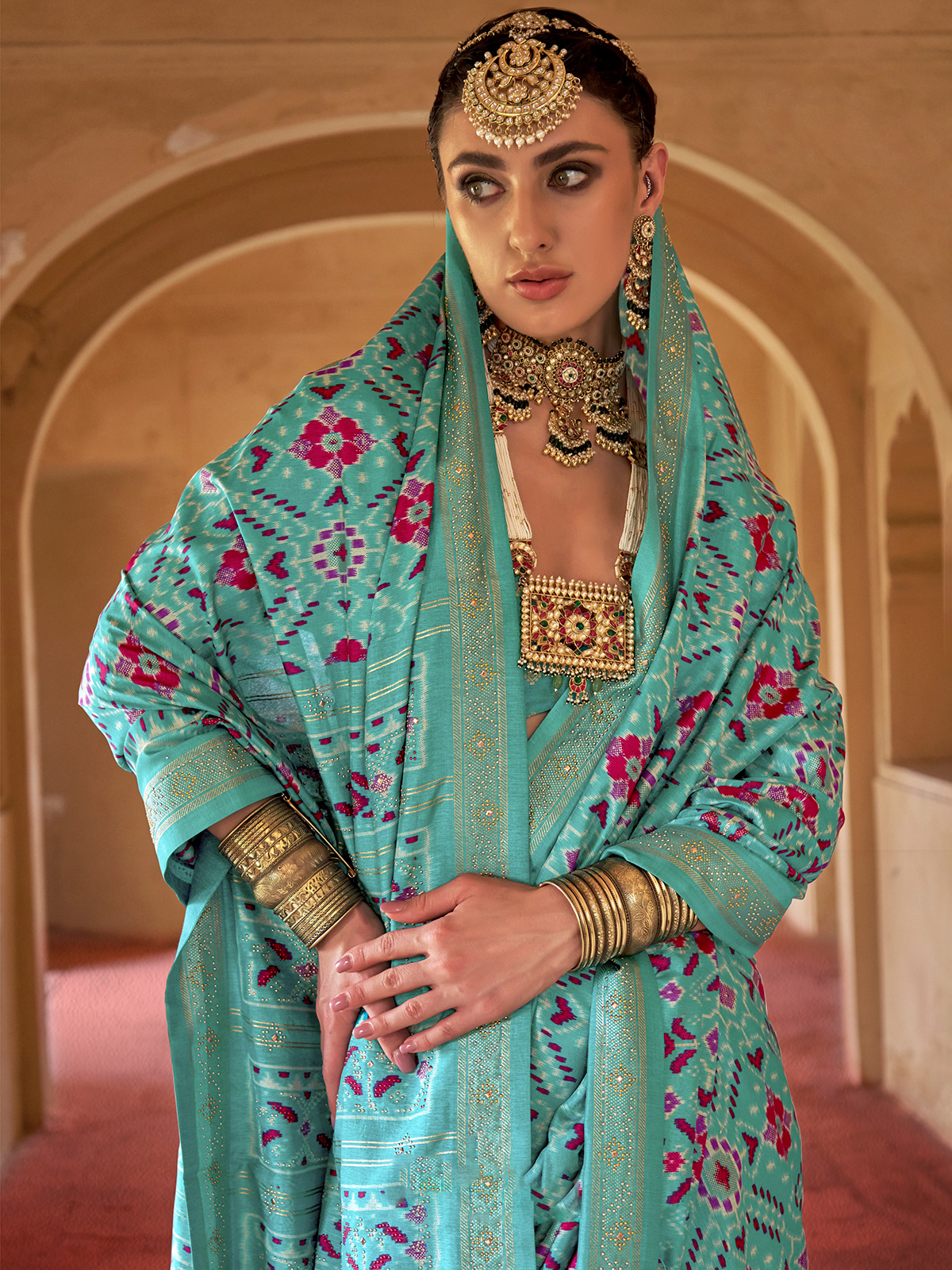 A soothing mint blue patola silk saree featuring timeless ikkat work and a border adorned with lace and subtle stones. Light in feel yet rich in ethnic allure, it comes with a matching blouse—perfect for family events and festive celebrations.