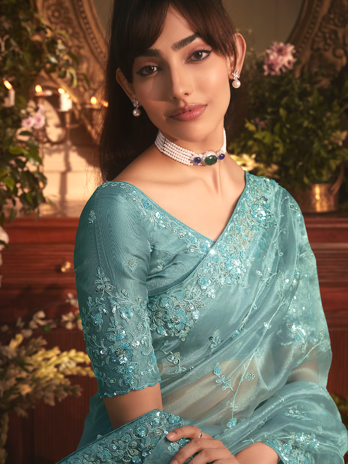 Mint blue tissue organza brings refreshing coolness to this graceful drape, offering a serene, floating elegance. Resham and sequins form soft, glistening motifs that highlight the saree’s airy texture. With its unstitched blouse piece included, it becomes a refined pick for festive gatherings, wedding celebrations, and polished reception evenings.