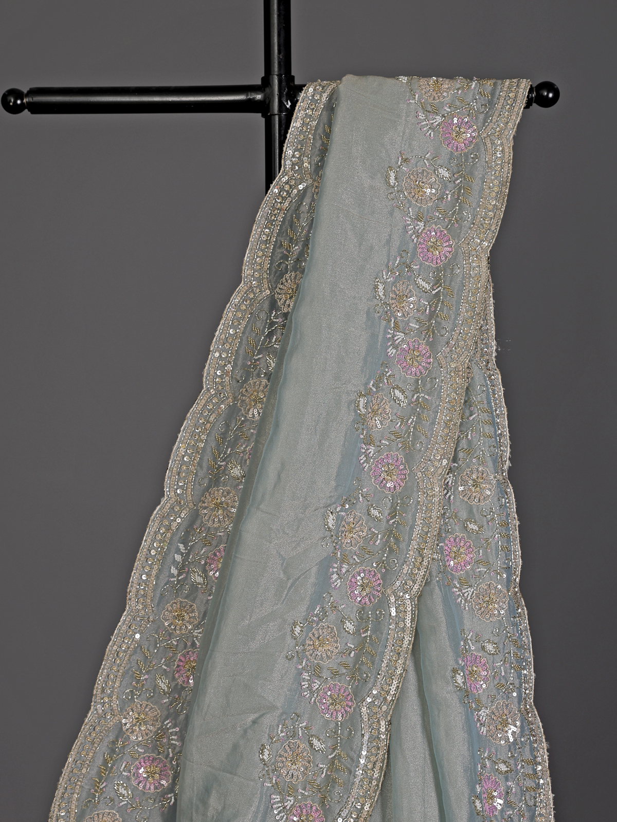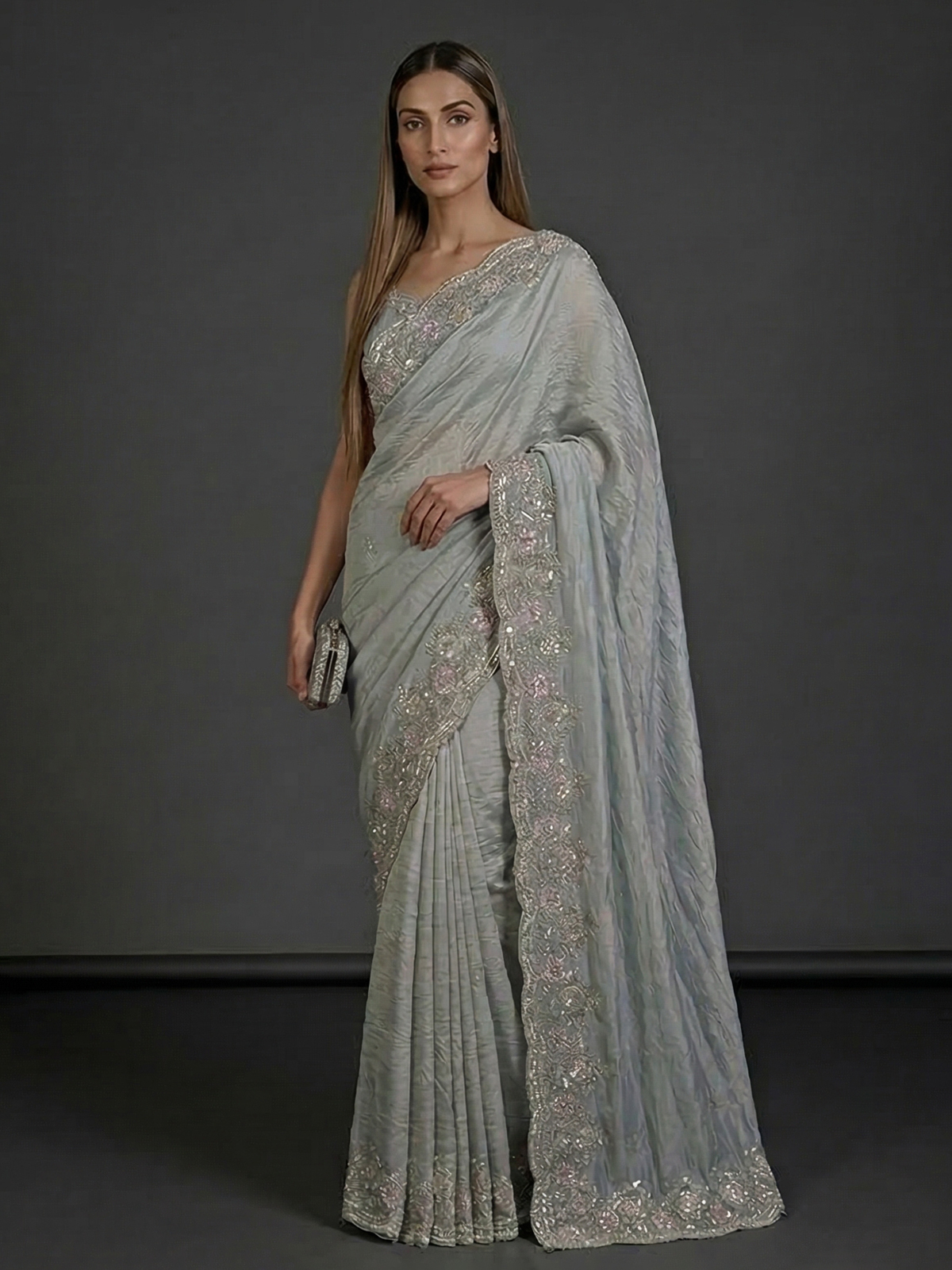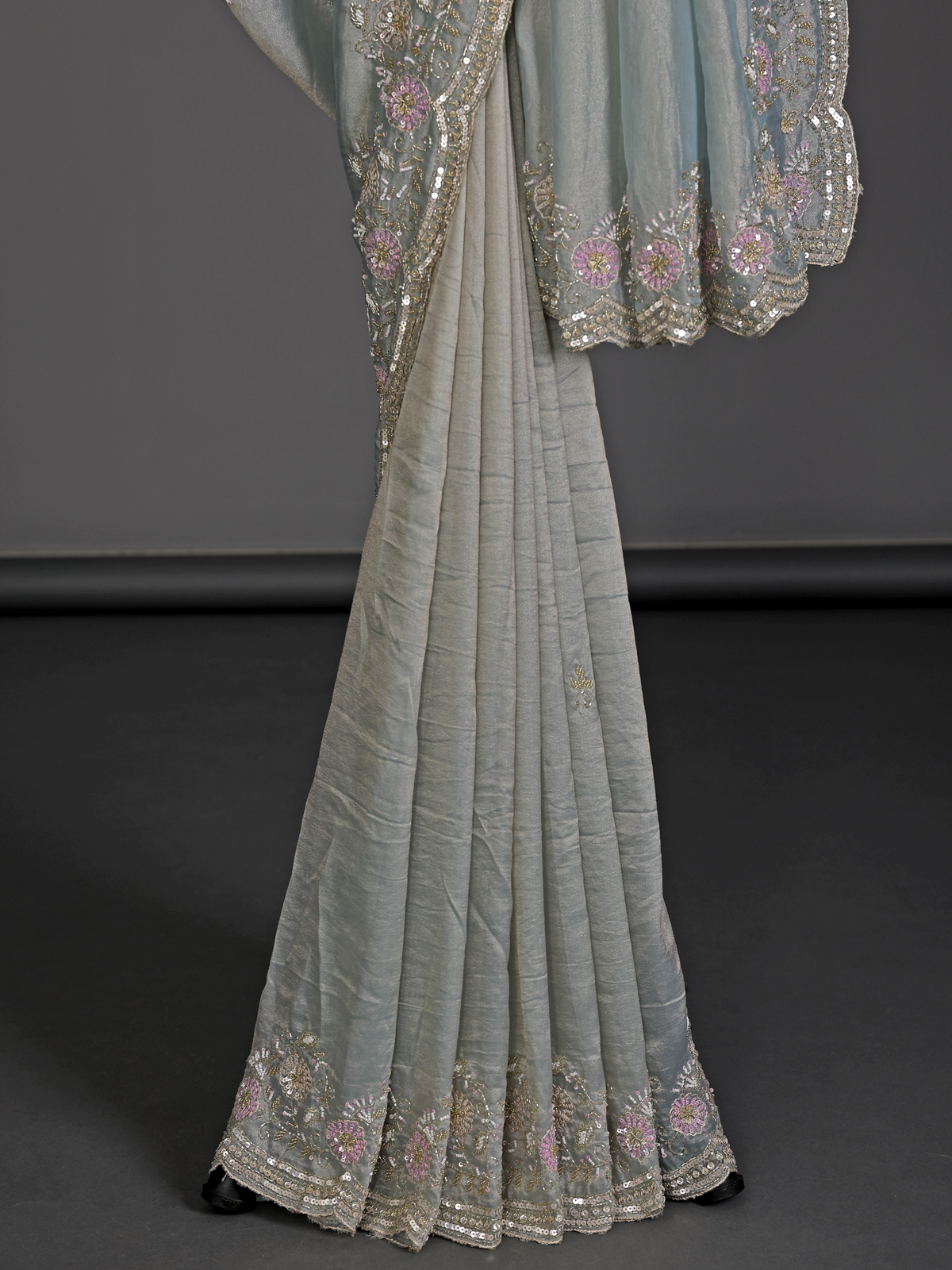 Refreshing mint blue tones bring serene elegance to this tissue silk saree designed for grand celebrations. Adorned with cutdana, sequins and bead work. It reflects refined shimmer and festive charm. The lightweight drape flows gracefully, enhancing feminine allure. Perfect for weddings, receptions and parties. It comes with an unstitched blouse piece for a complete and customizable ethnic look.
