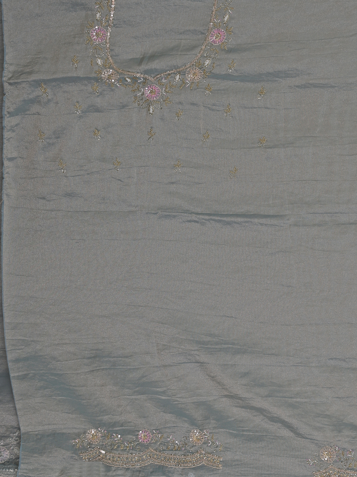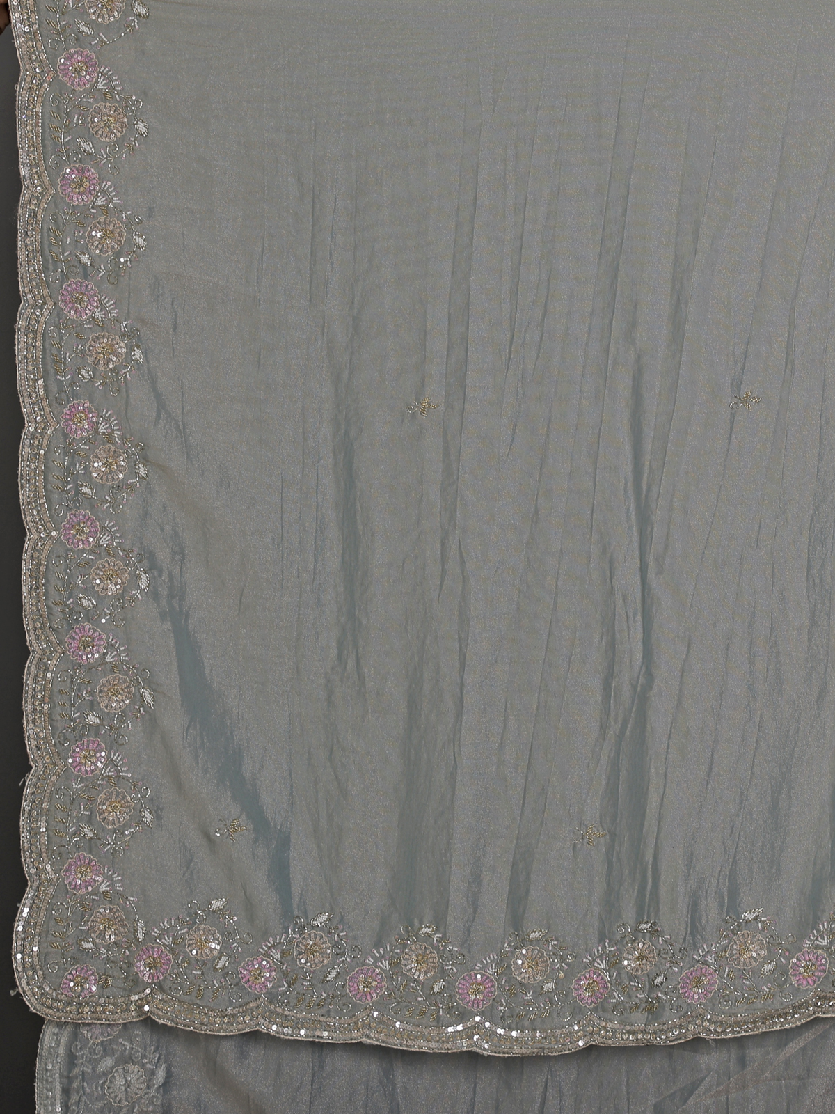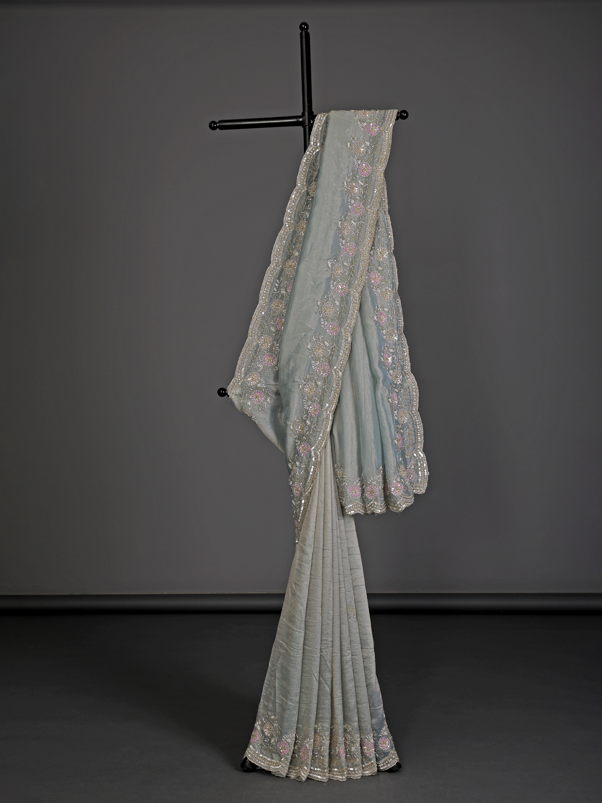 Refreshing mint blue tones bring serene elegance to this tissue silk saree designed for grand celebrations. Adorned with cutdana, sequins and bead work. It reflects refined shimmer and festive charm. The lightweight drape flows gracefully, enhancing feminine allure. Perfect for weddings, receptions and parties. It comes with an unstitched blouse piece for a complete and customizable ethnic look.