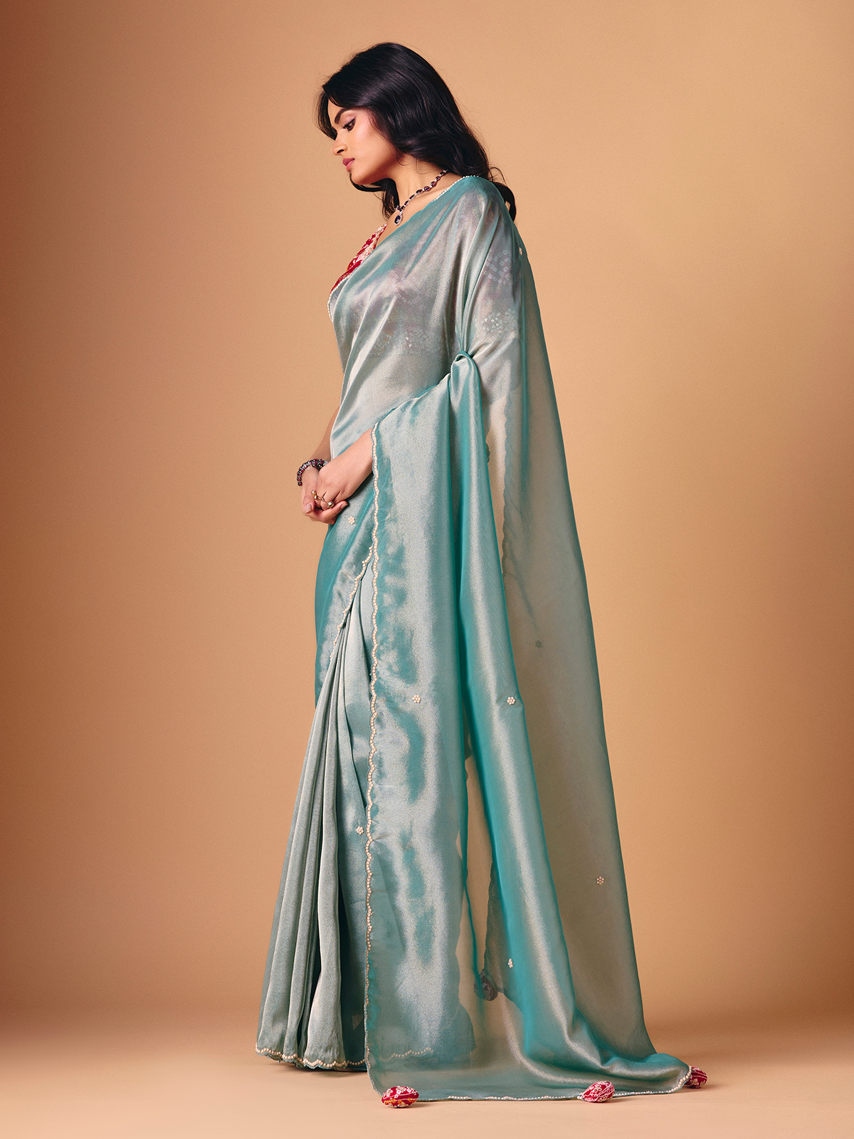 Crafted in refreshing mint blue tissue silk saree is adorned with cutdana, zardosi, pearls, sequins and gota detailing. Styled with a bandhej printed ready made blouse, it offers elegant movement and festive charm for weddings, sangeet and reception events.