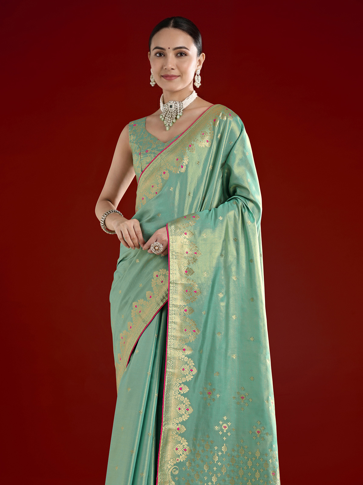 Graceful and regal, this mint blue tissue silk saree features a luxurious sheen that reflects classic ethnic charm. The broad borders and pallu are enriched with elaborate golden zari work, complemented by subtle floral motifs and delicate red accents across the body. Contrasting red piping and elegant tassels frame the edges beautifully. Paired with an unstitched blouse, this saree is perfect for weddings and festive occasions.