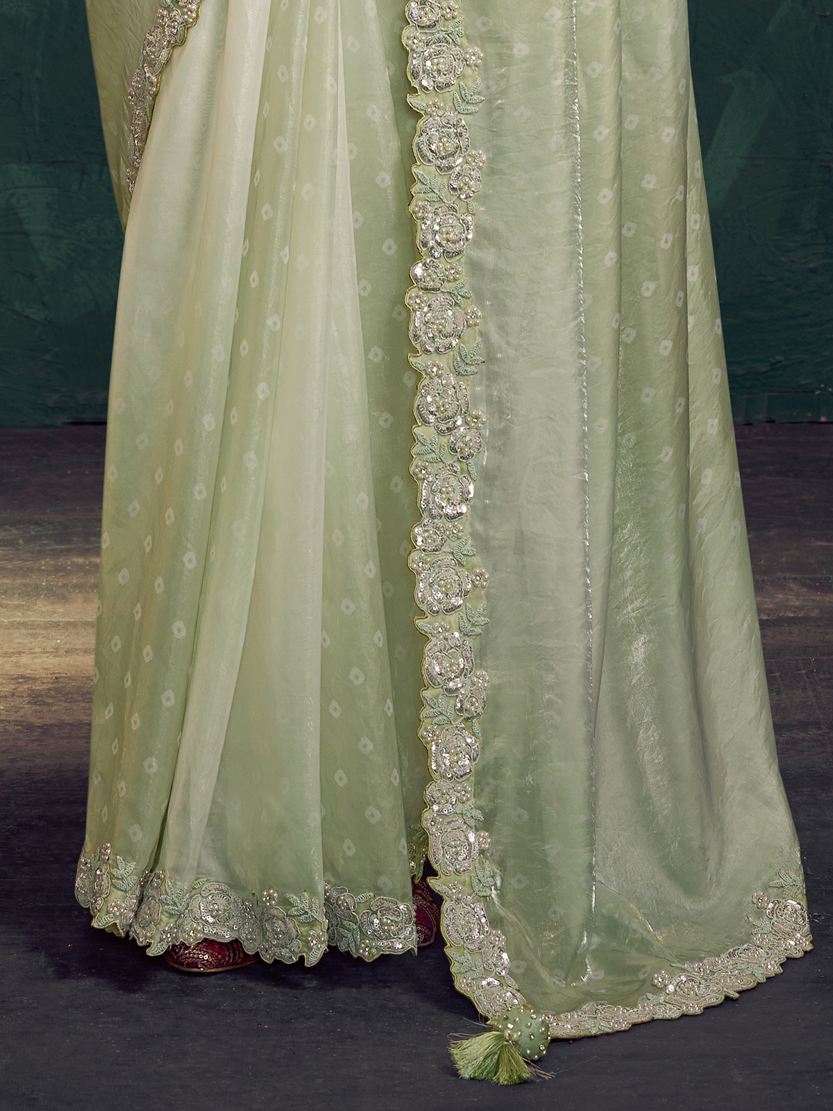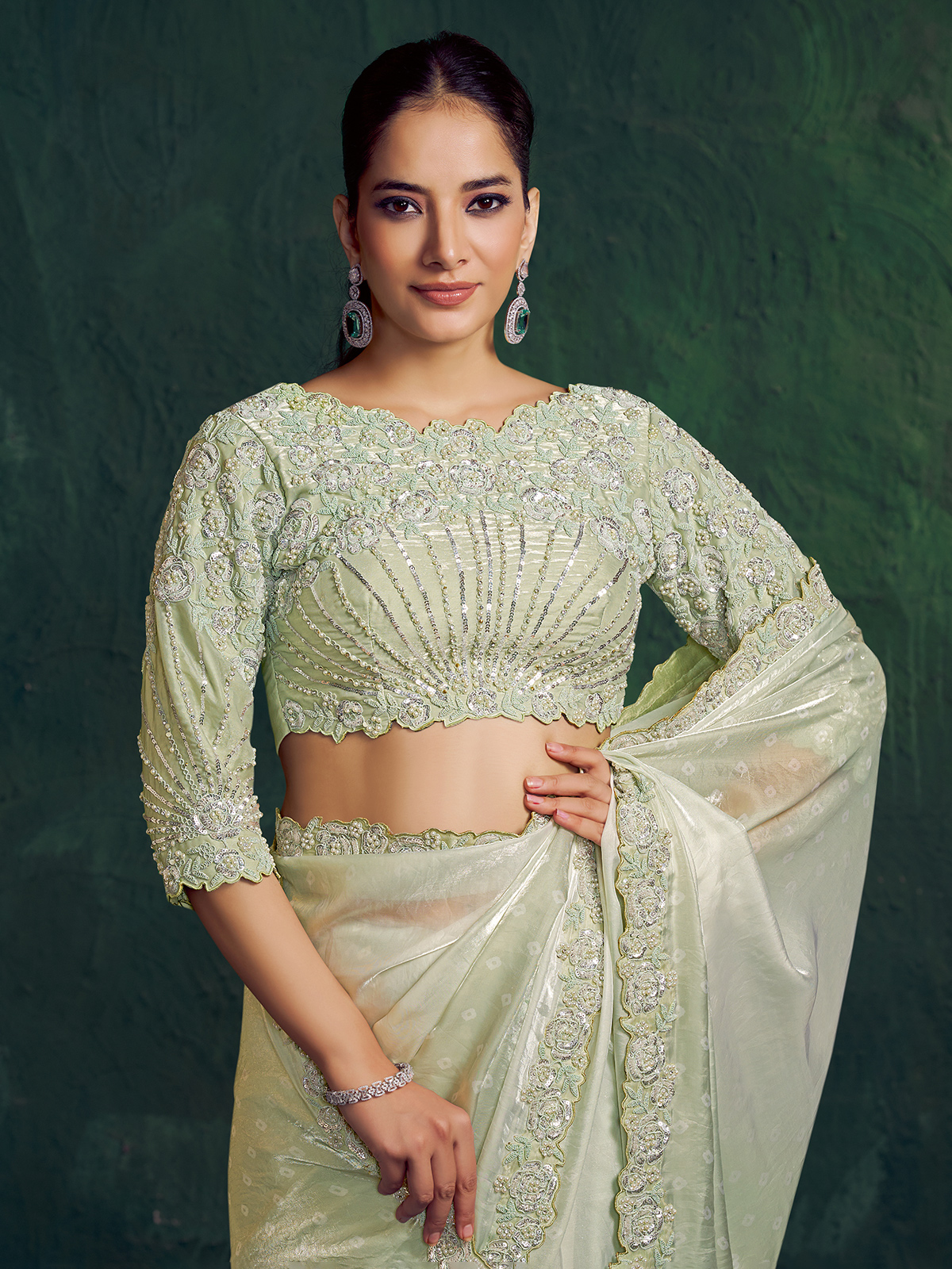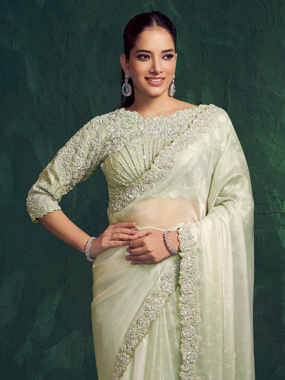 Rendered in mint green two tone shaded satin silk, this saree displays printed accents enhanced with embroidery, sequins and pearl detailing. The soft sheen lends modern elegance. Paired with an unstitched blouse piece, it is ideal for receptions, festive gatherings, sangeet functions and stylish party occasions.