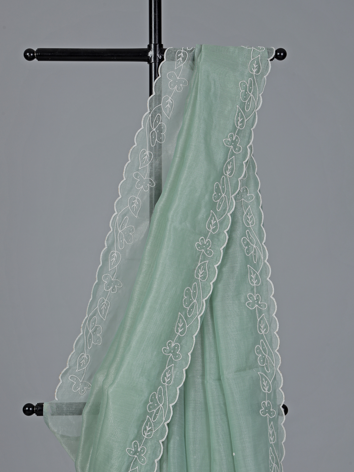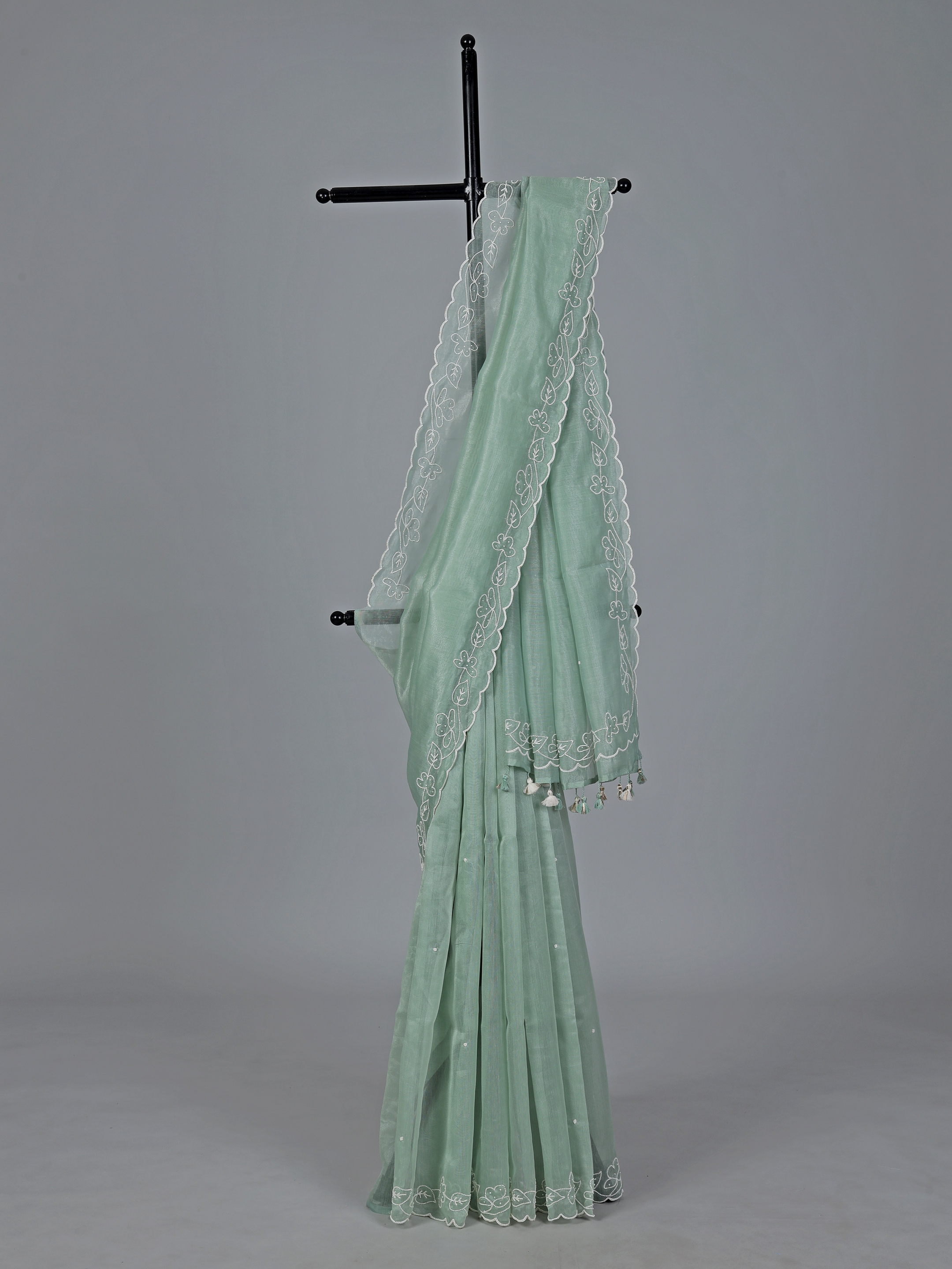 Fresh and soothing mint green semi organza saree is adorned with intricate thread and bead work. The airy silhouette and soft shimmer create a graceful festive presence. Includes an unstitched blouse piece for personalized elegance.