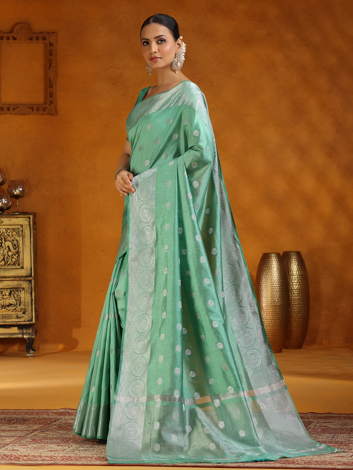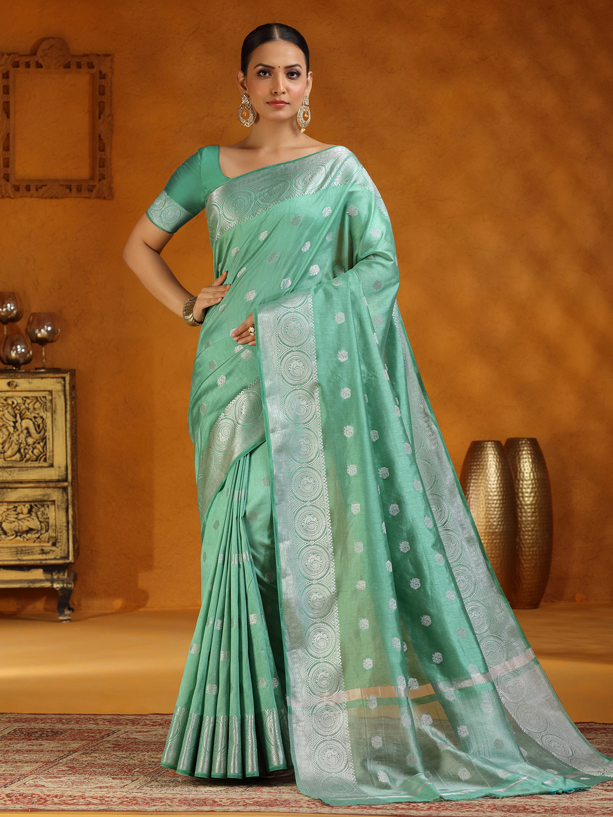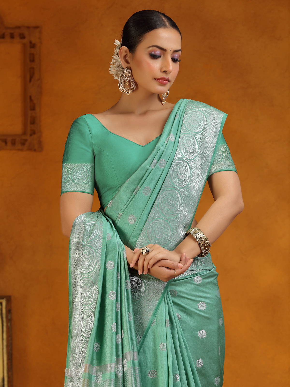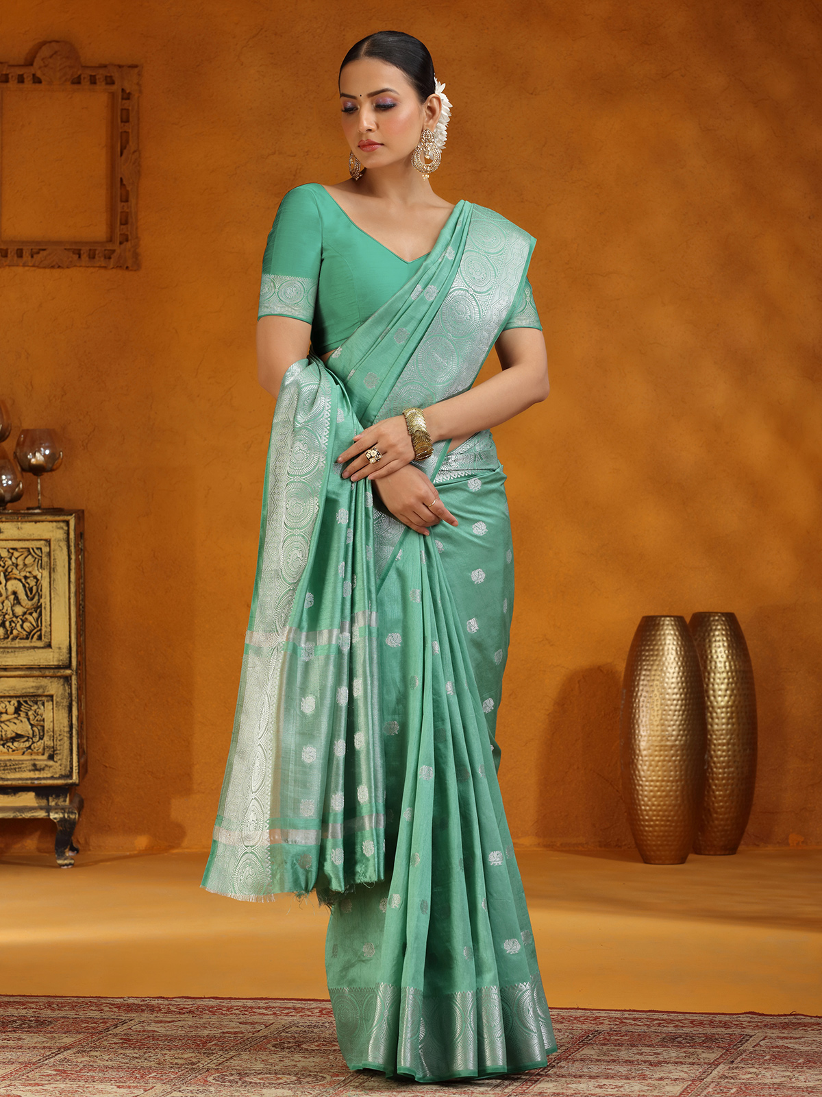 A timeless lime green silk saree with subtle silver zari for understated elegance. Includes an unstitched blouse piece.