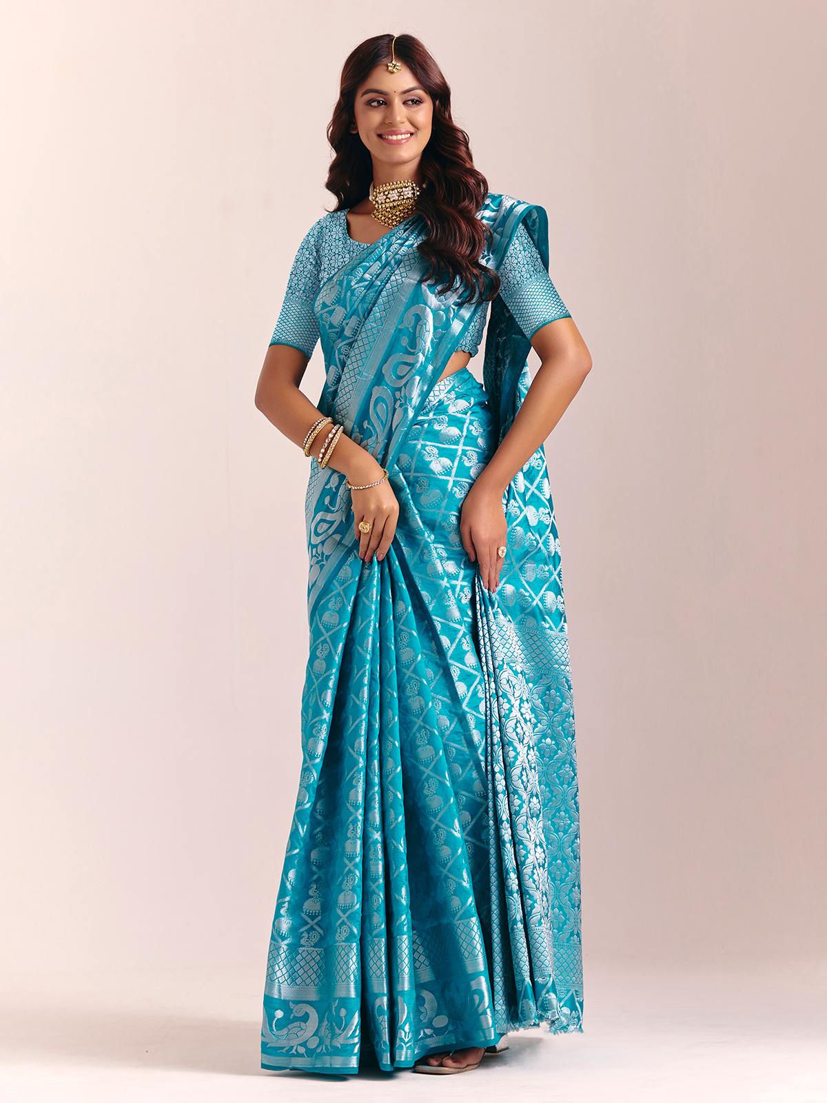 This mint green silk saree shines with intricate zari weaving that adds a refreshing yet elegant festive touch. Its soft drape creates a beautifully flattering silhouette. The unstitched blouse piece allows perfect customization, making it ideal for weddings and graceful festive occasions.