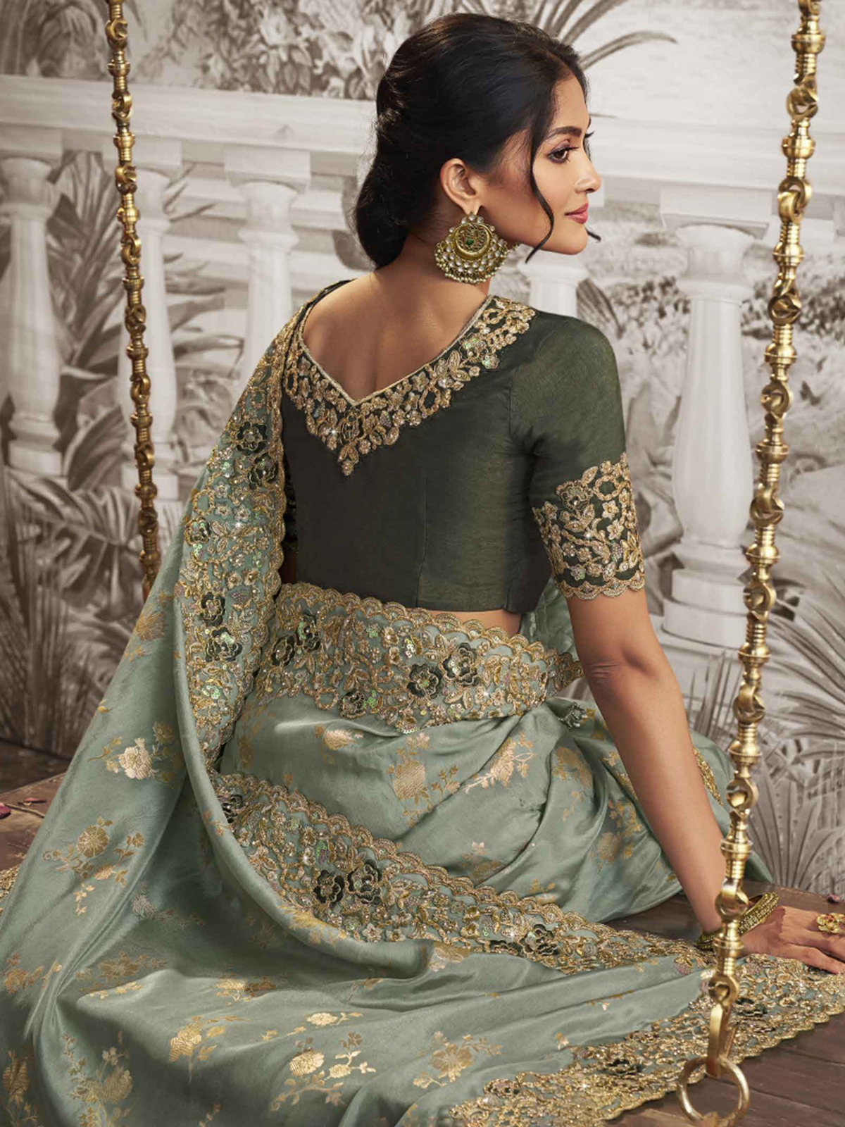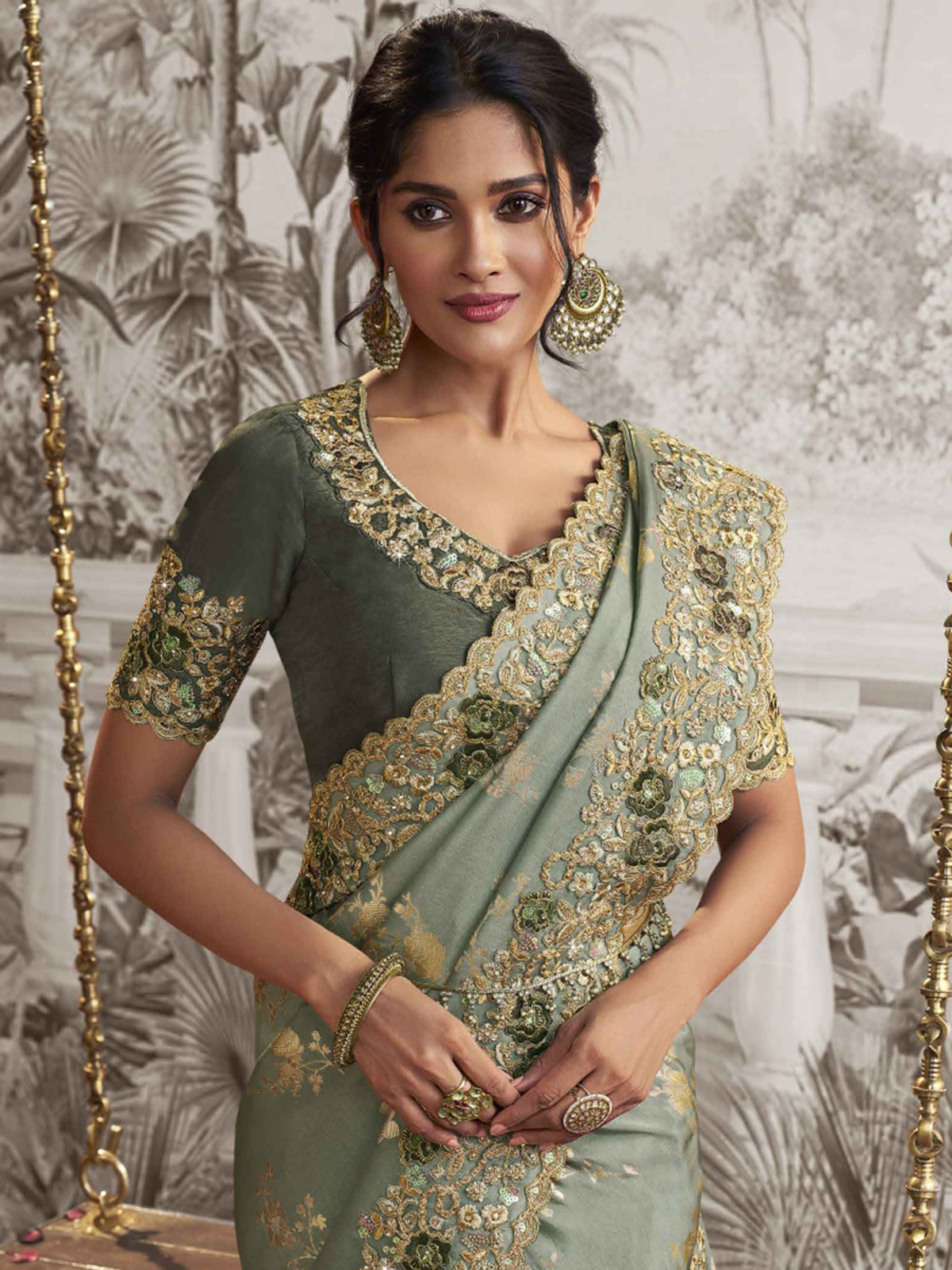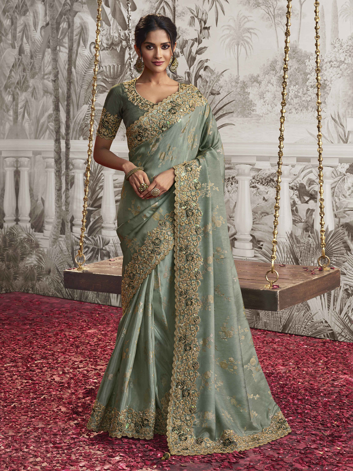 Celebrate in refined style with this mint green silk saree, adorned with intricate zari work throughout and a richly crafted border featuring sequins, mirror, resham, embroidery, and stone accents. Complete with a coordinating blouse piece, it is tailored for weddings and festive functions.