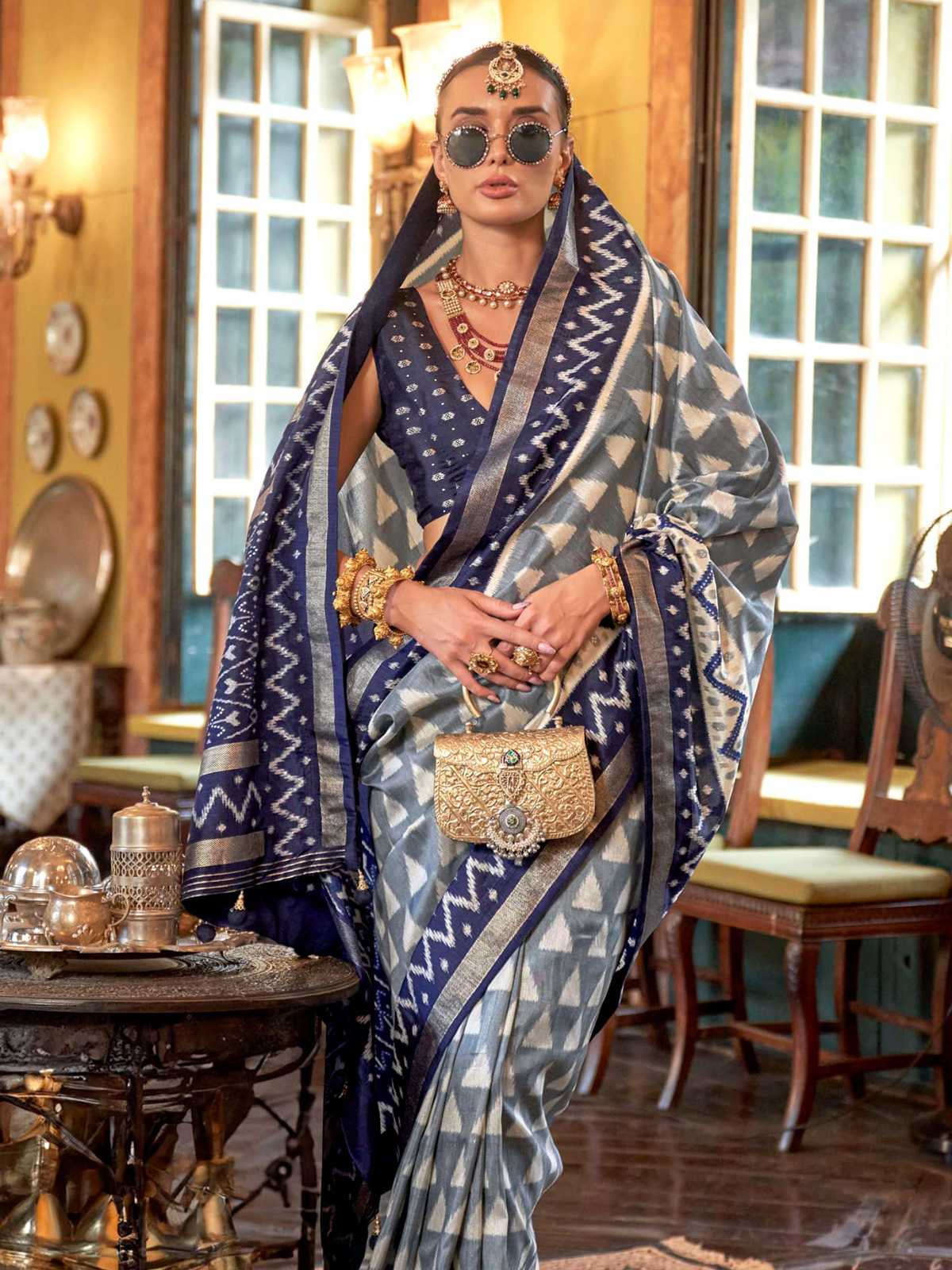 Celebrate the festive season in style with this luxurious grey silk saree, enriched with intricate patola inspired zari weaving. A perfect mix of tradition and elegance, it is paired with a contrasting blue unstitched blouse piece for a polished, customized look.