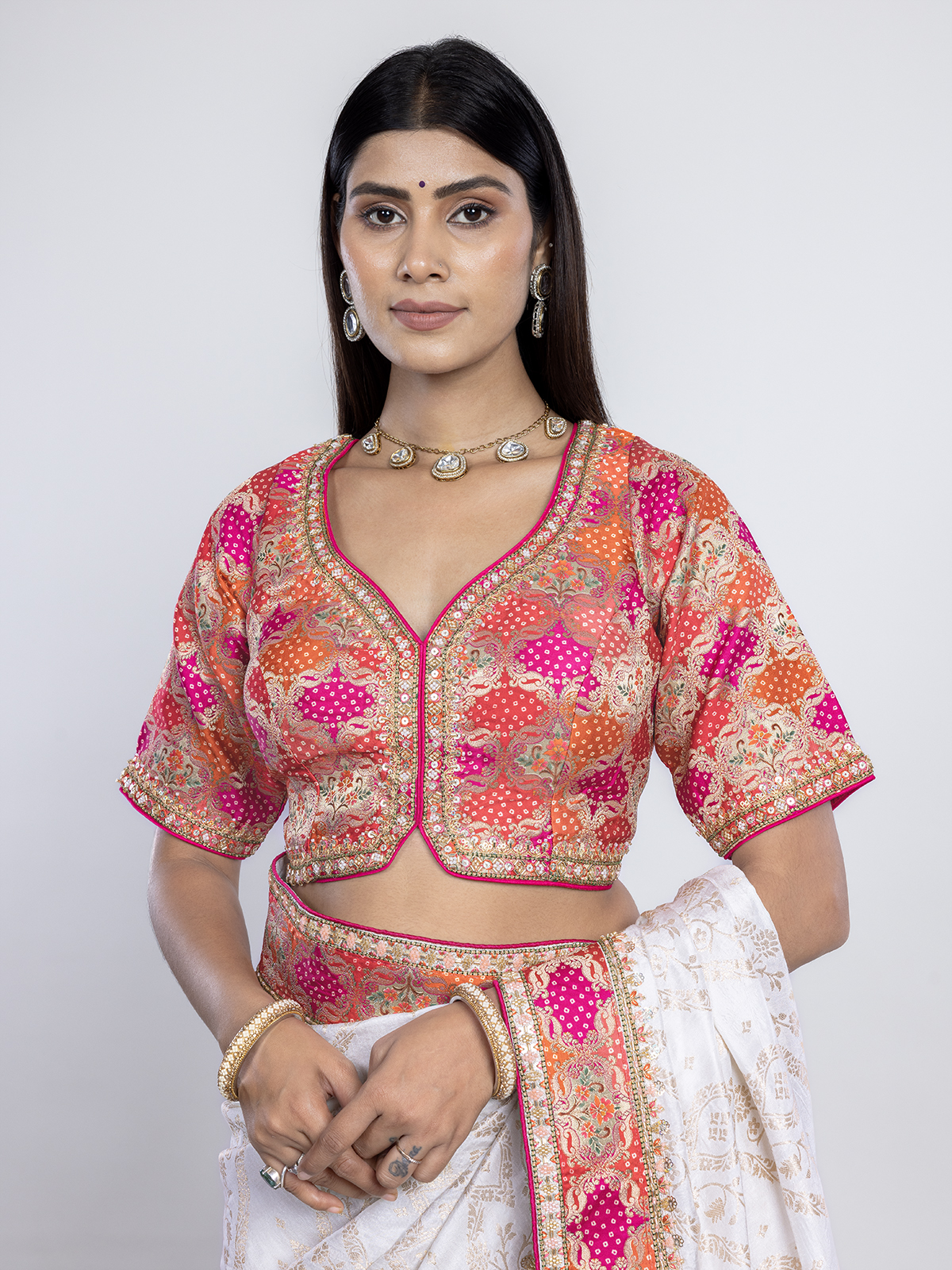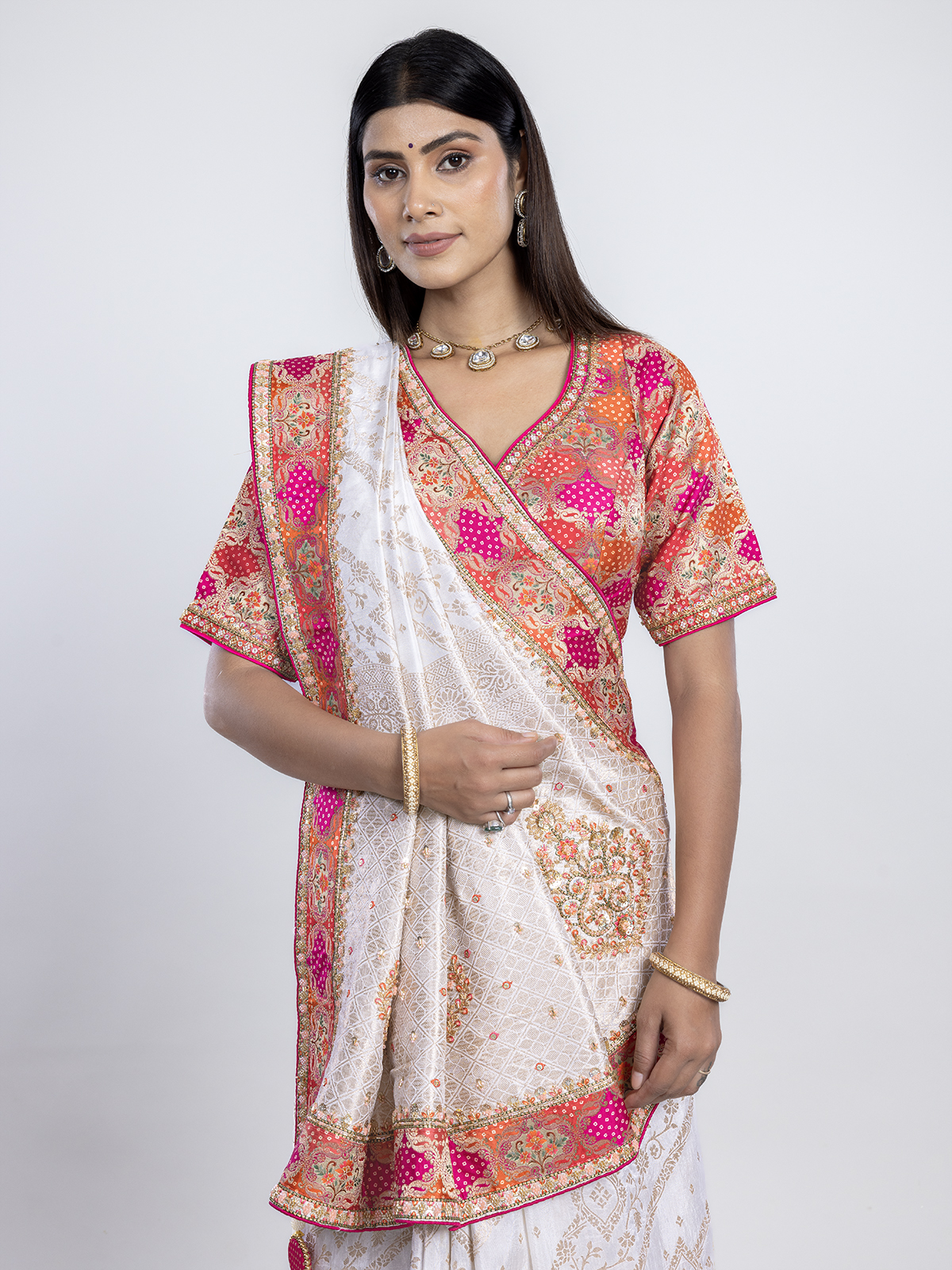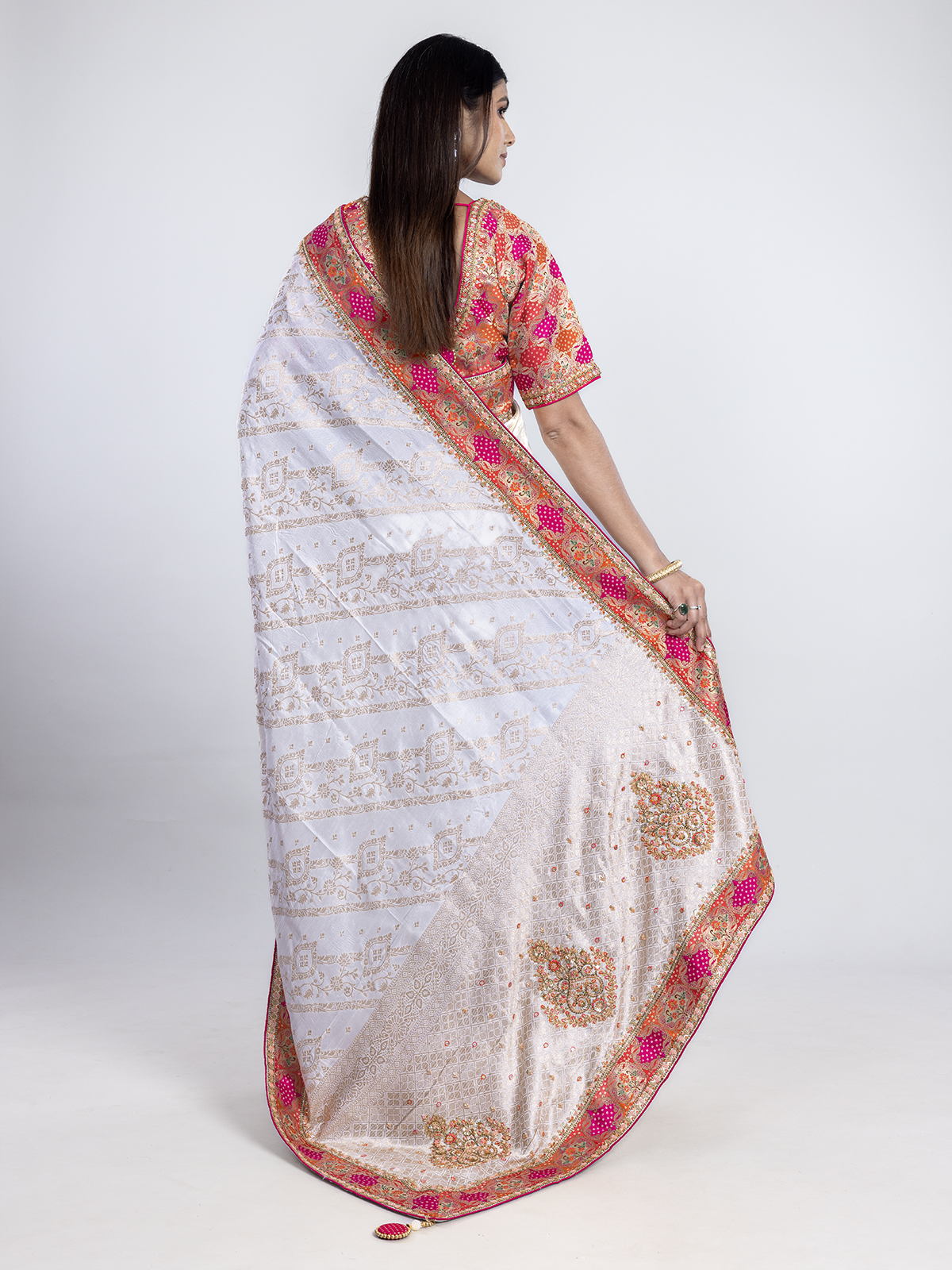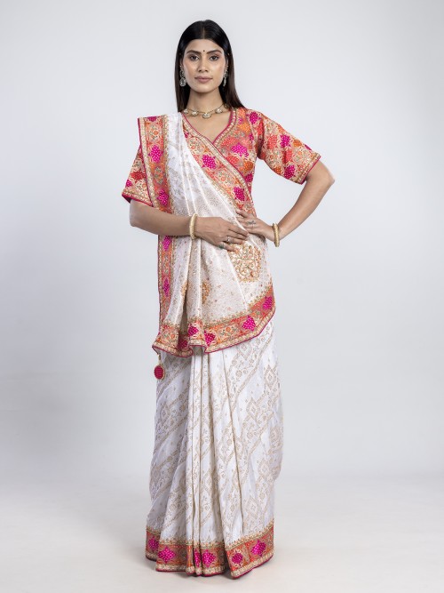 This moonlit white dola silk saree glows with zari, cutdana, resham, and sequins, radiating celestial grace. The luminous weave embodies serenity and refined tradition, ideal for weddings and celebrations. Teamed with a red readymade blouse, it creates a divine balance of purity and passion, wrapped in timeless sophistication.