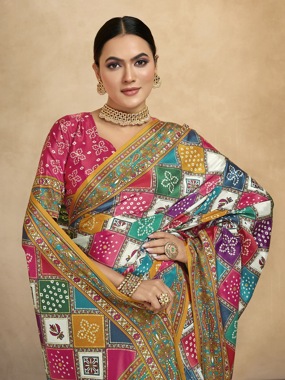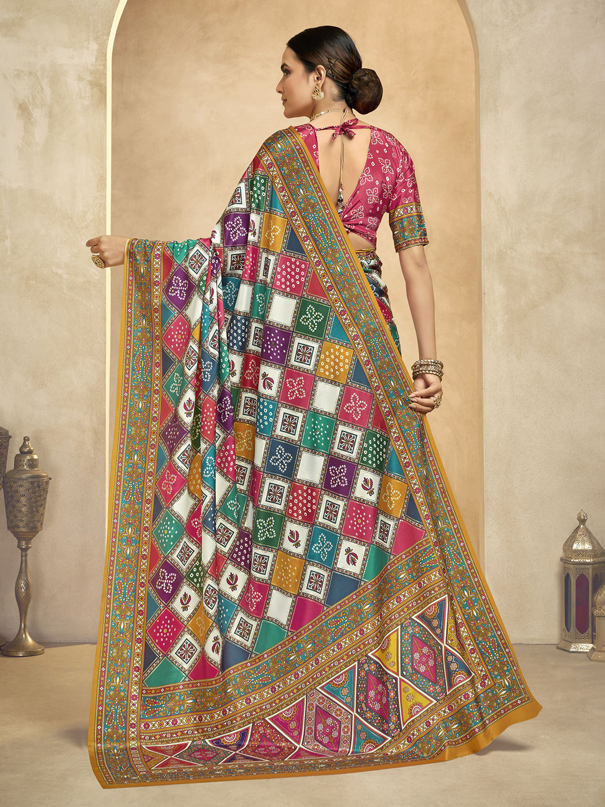 This multicolor crepe silk saree brings together lively digital prints that create a vibrant ethnic look. Smooth in texture and easy to drape, it is paired with an unstitched blouse piece, making it suitable for casual festivities and colorful celebratory occasions.