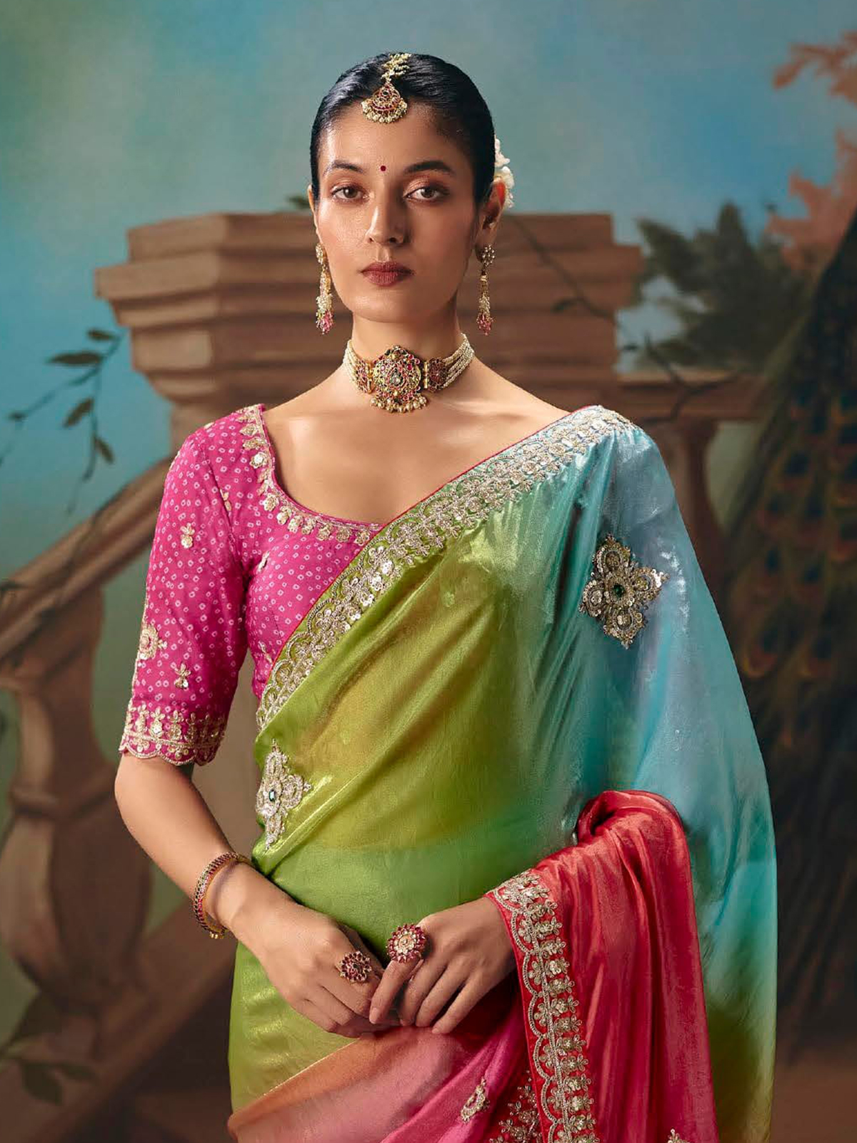 This eye-catching multicolor fancy tissue silk saree showcases a shaded finish adorned with resham, sequins and stone embellishments. Styled with an unstitched blouse piece, it delivers a vibrant festive look, perfect for sangeet nights and joyful celebration gatherings.