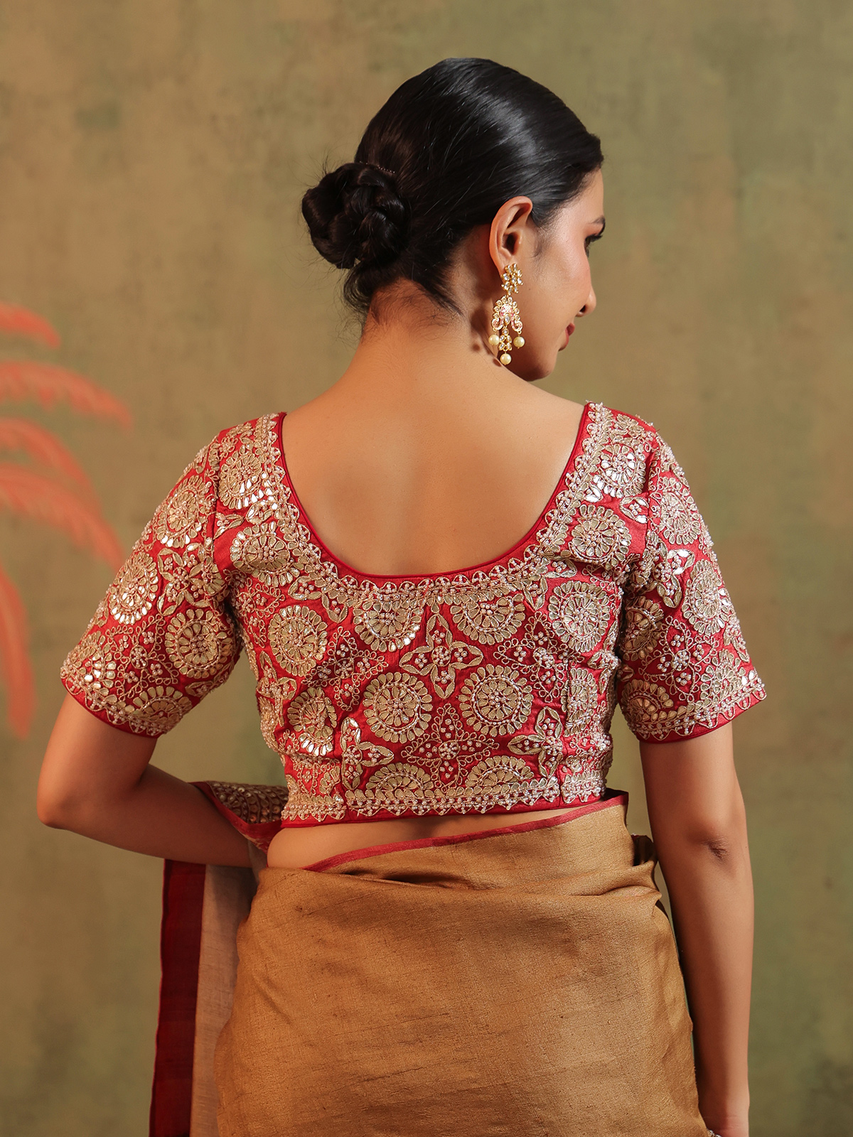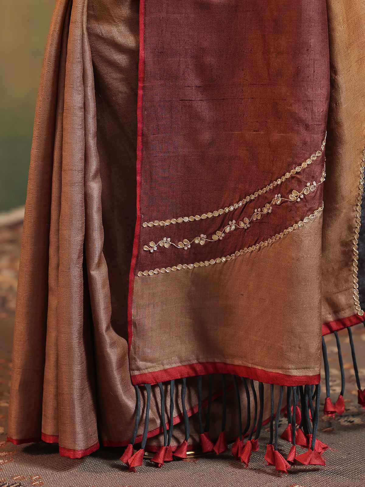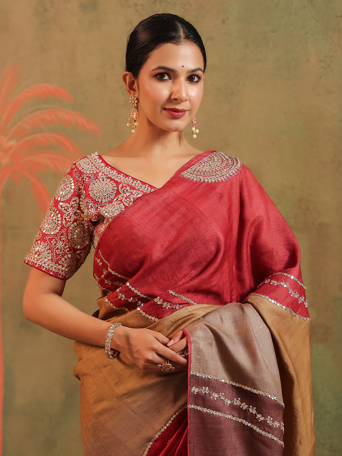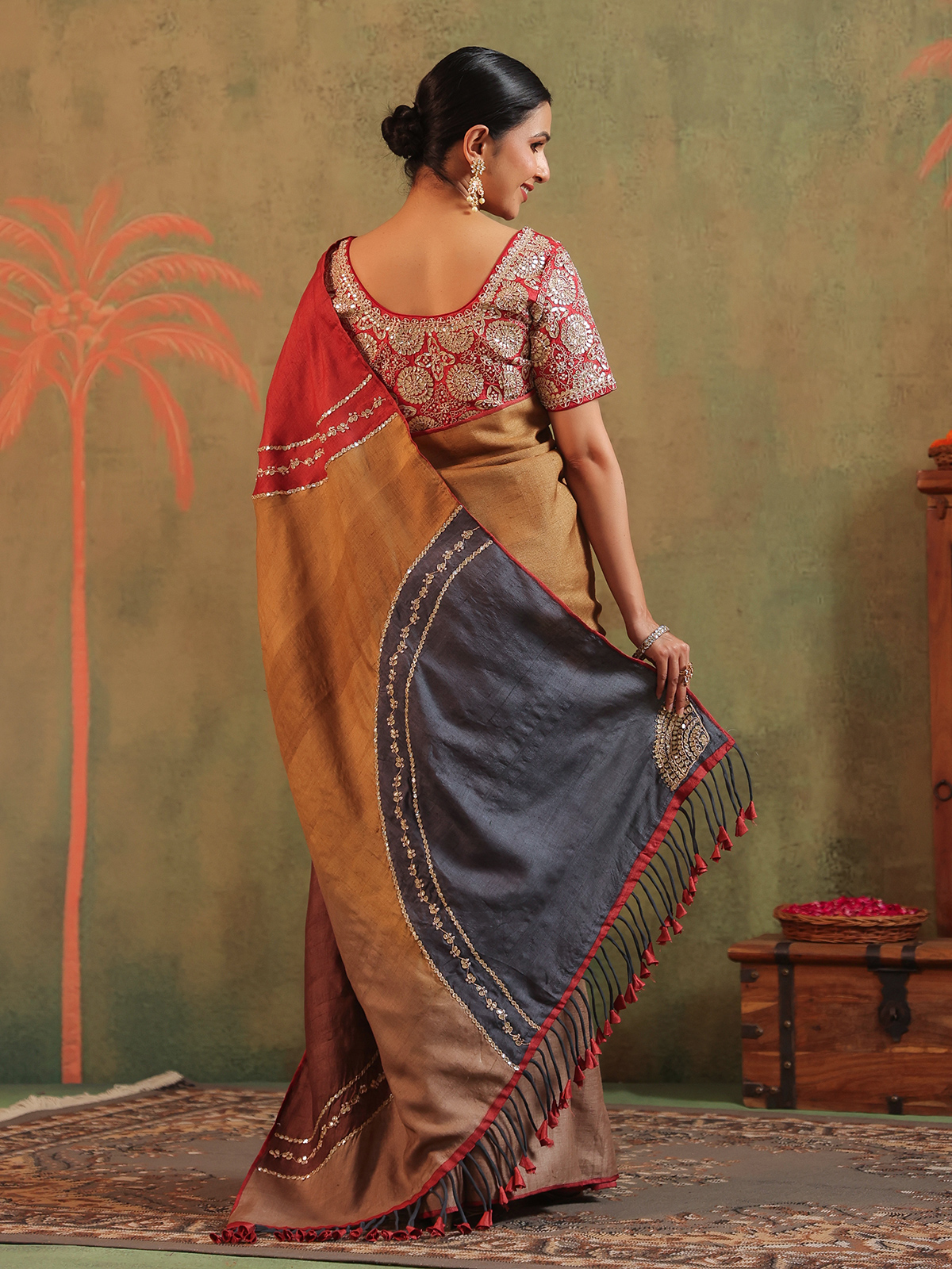 Grace rests in the muted elegance of this multi color silk saree, adorned with sequins, cutdana, zardosi and soft threads. A canvas of classic charm, it speaks through gentle glimmers and fine needlework. With its unstitched blouse piece, it is the perfect companion for wedding rituals and festive days steeped in sentiment.