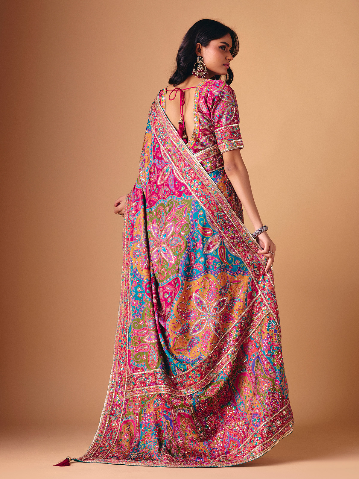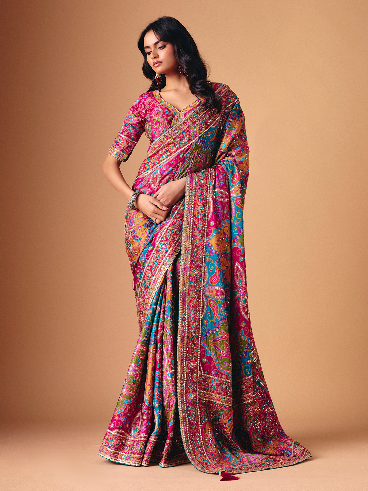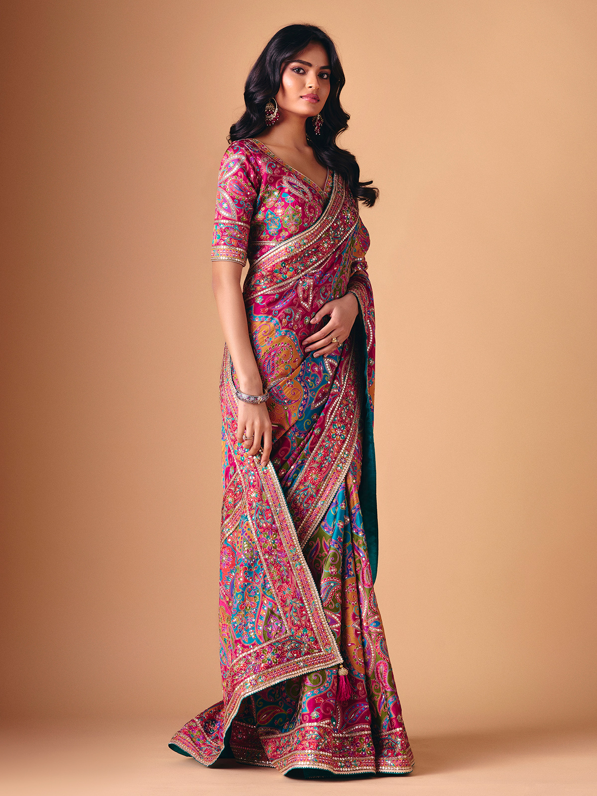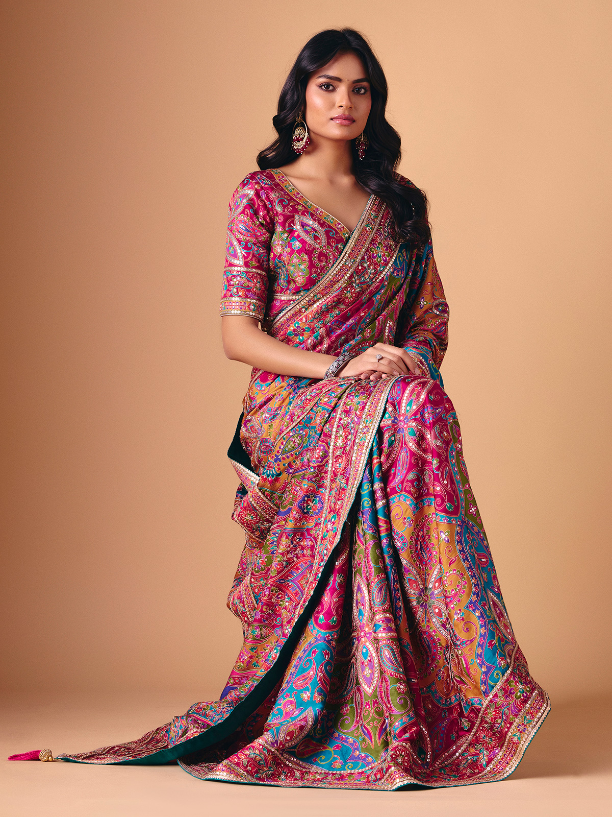 Crafted in fluid multicolor modal silk, this saree is highlighted with vibrant colorful print enriched by resham and sequin accents. Paired with a ready-made blouse, it offers effortless grace, making it ideal for weddings, sangeet functions, receptions and festive celebrations.