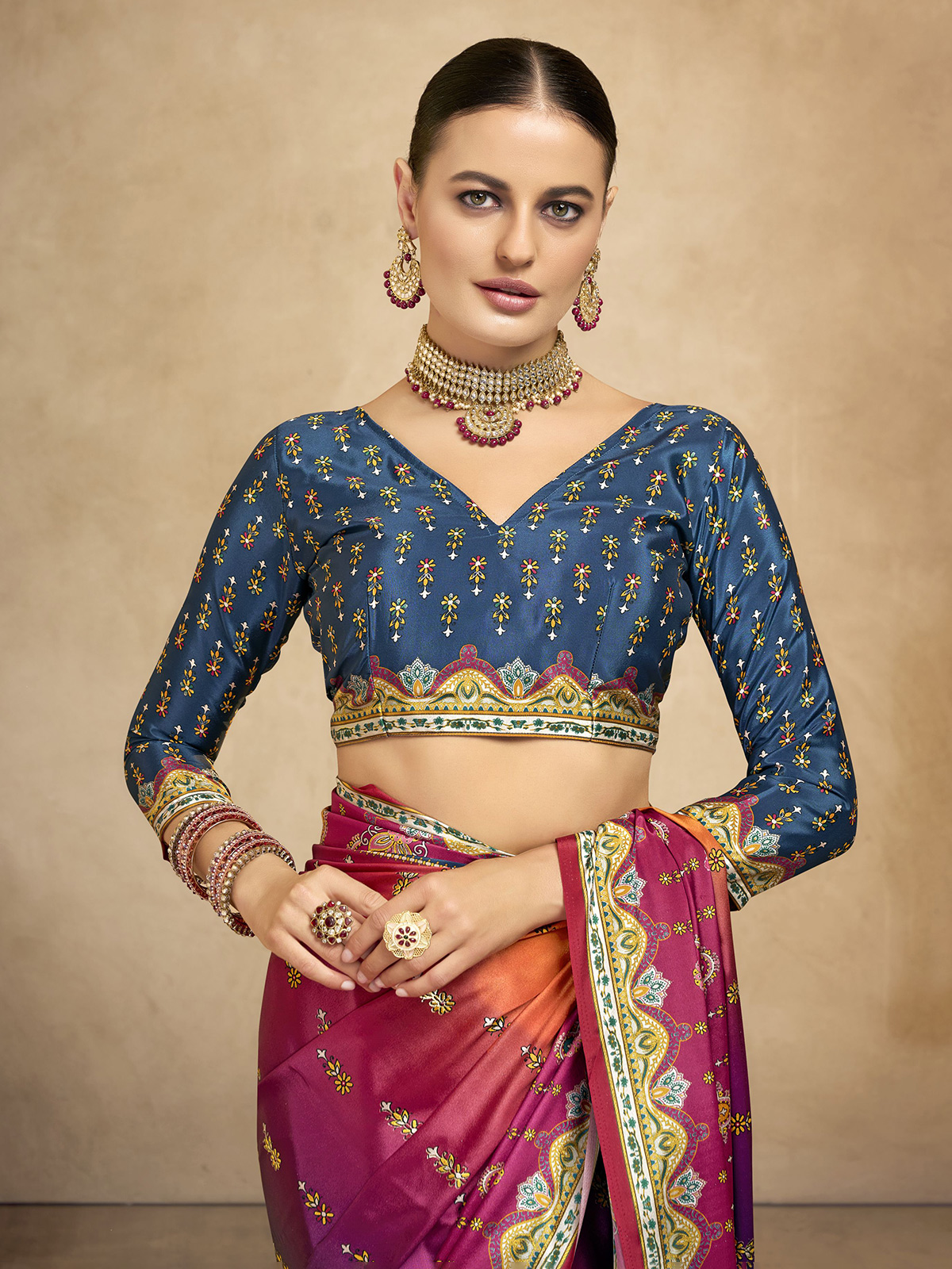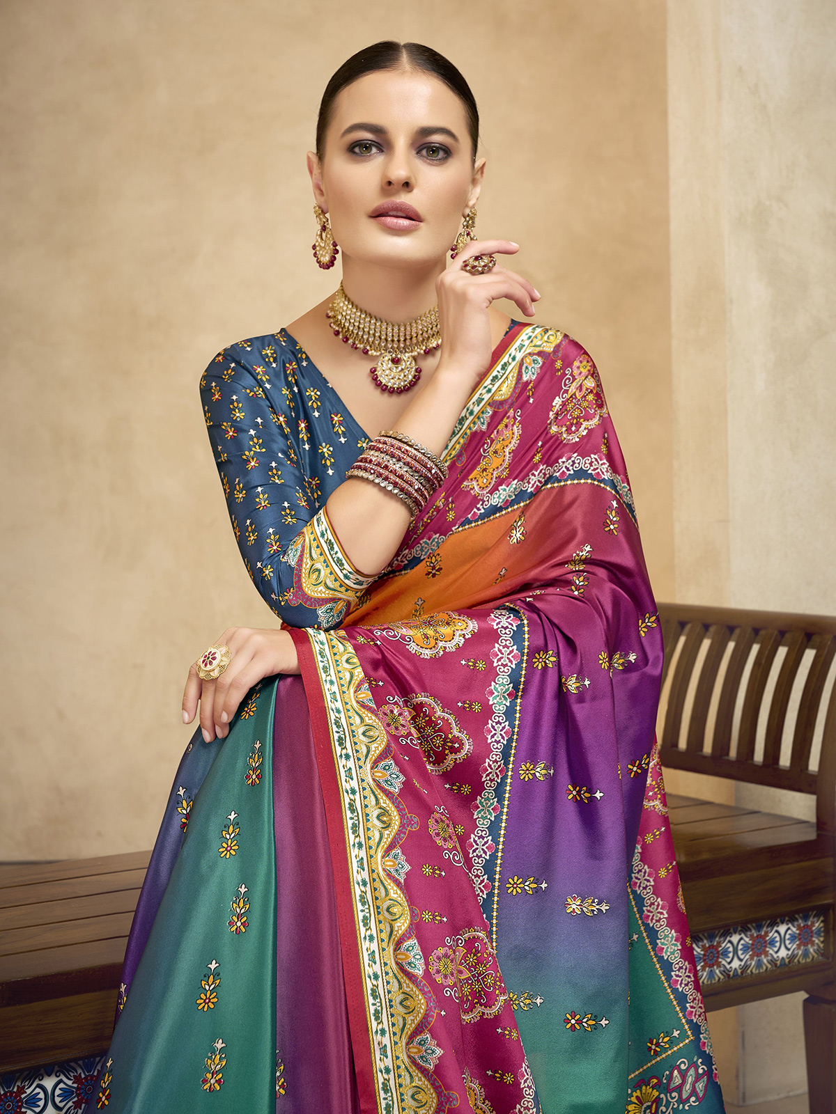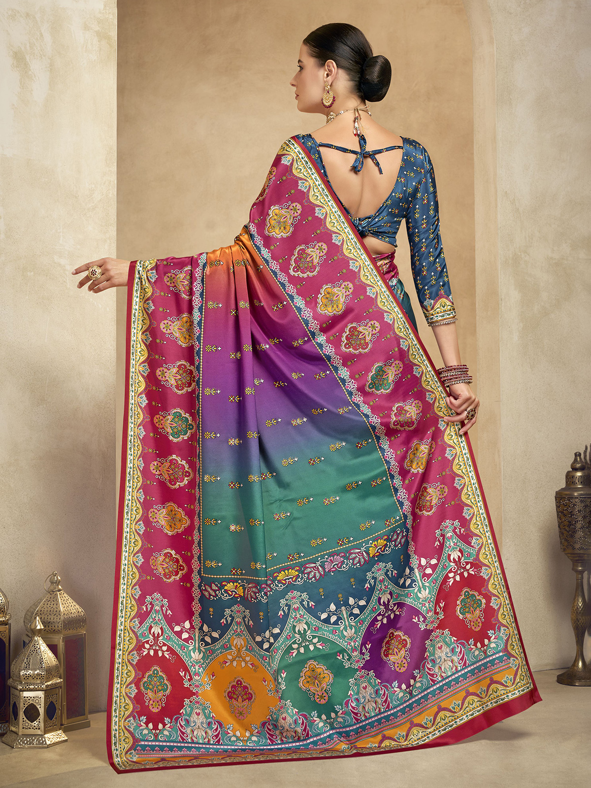 Featuring a shaded multicolor design, this crepe silk saree is adorned with artistic digital prints for added depth. Lightweight and graceful, it is paired with an unstitched blouse piece, making it perfect for festive wear, casual gatherings and daytime celebrations.