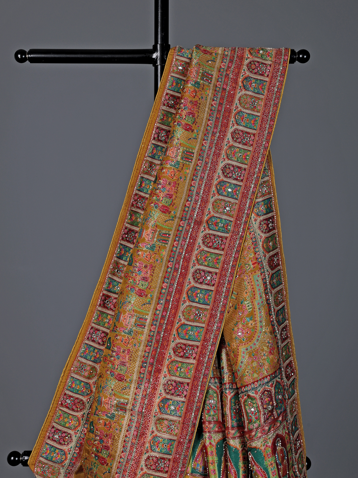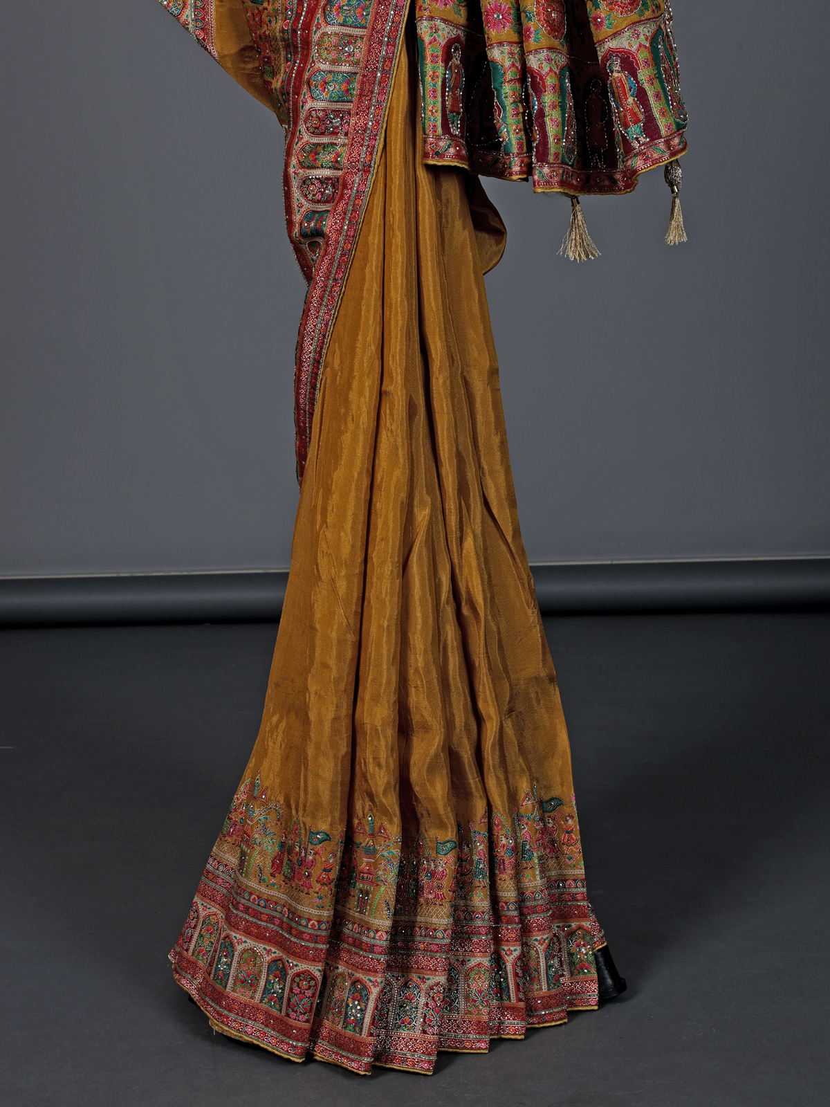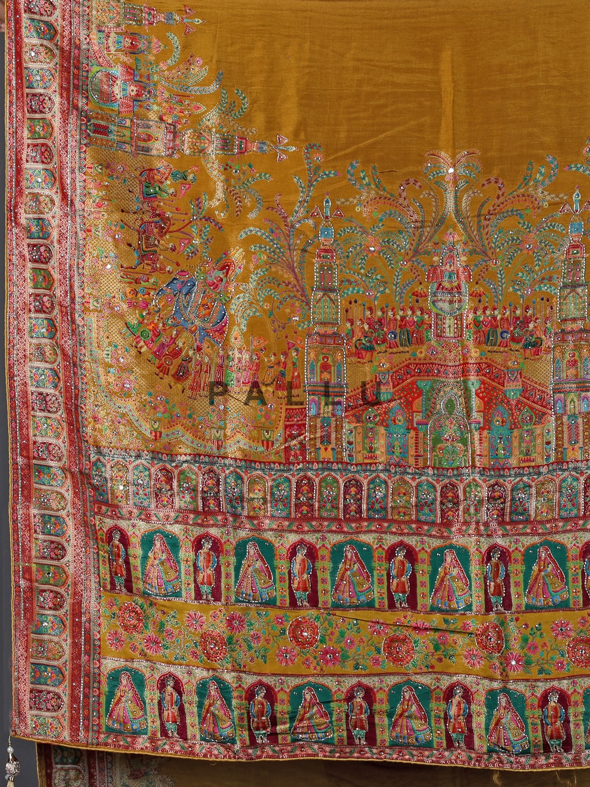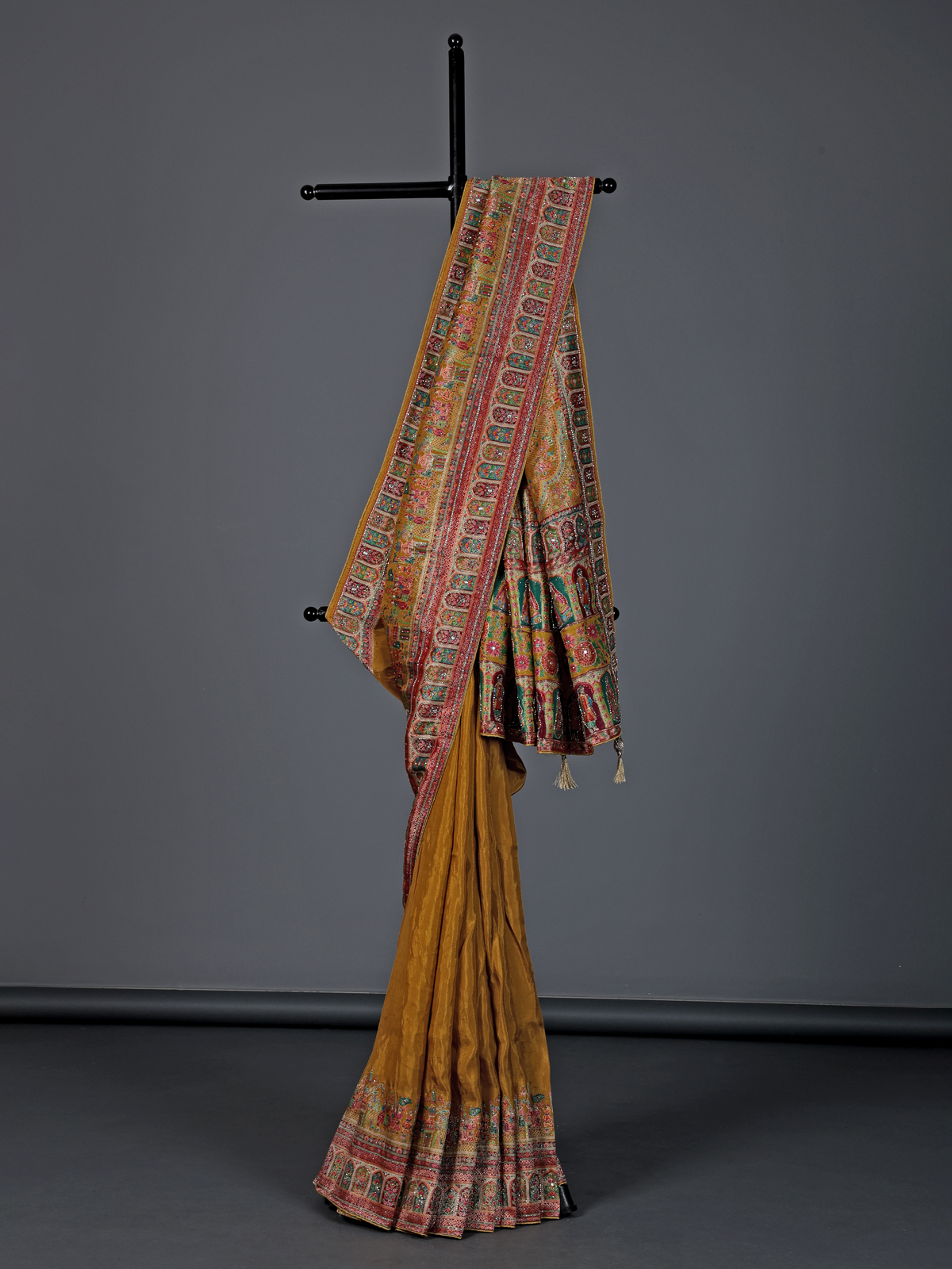 Warm and cheerful mustard yellow art silk saree shines with colorful motifs and intricate cutdana, mirror and diamond work. Perfect for haldi and festive occasions. It radiates joyful elegance. Paired with an unstitched blouse piece. It offers a versatile and vibrant ensemble.
