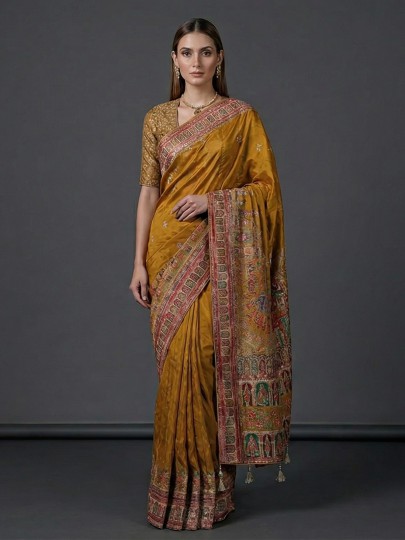 Mustard Yellow Art Silk Mirror Work Haldi Saree