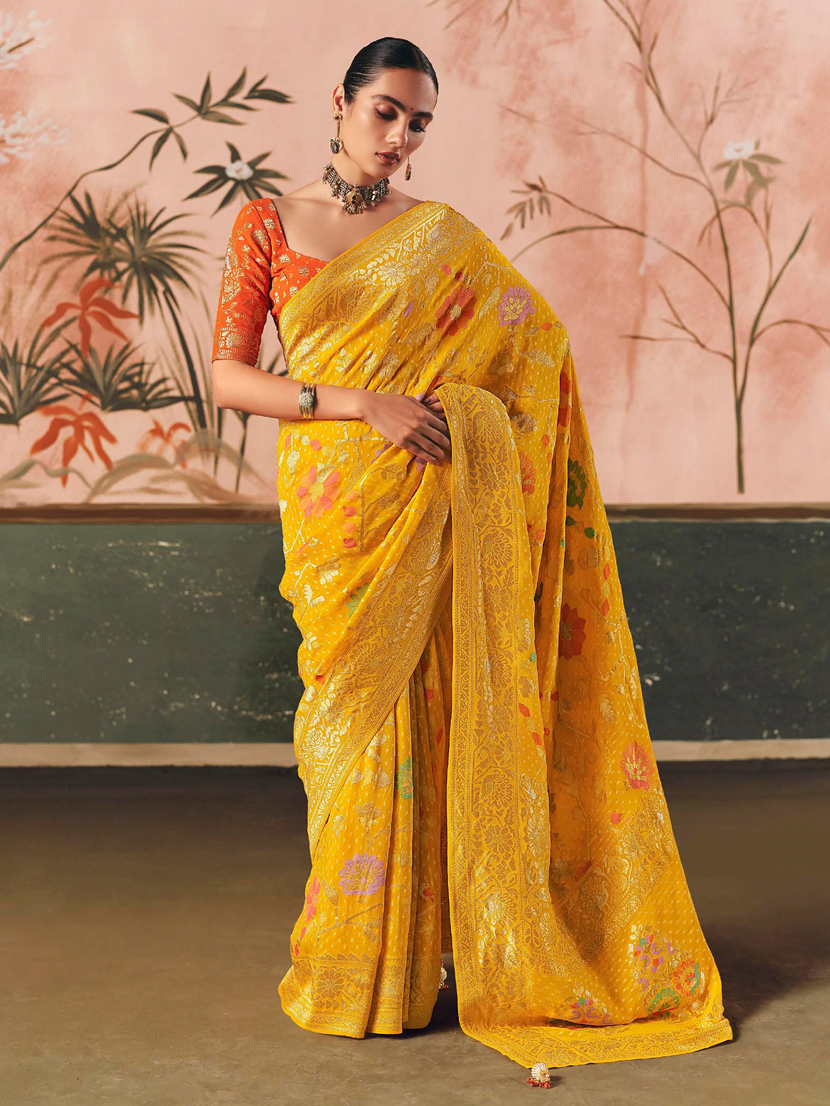 Mustard Yellow Bandhej Georgette Saree With Elegant Zari Work