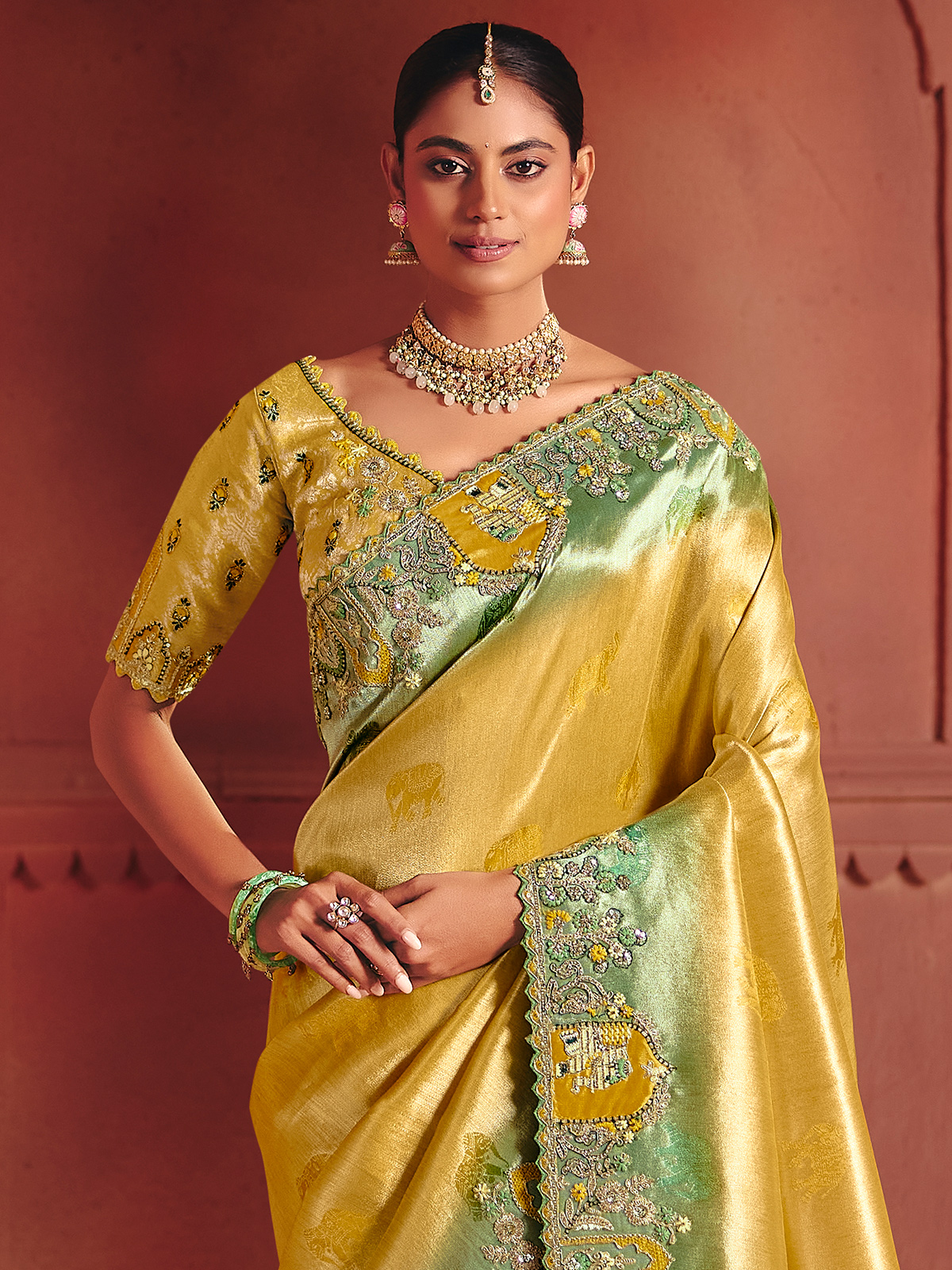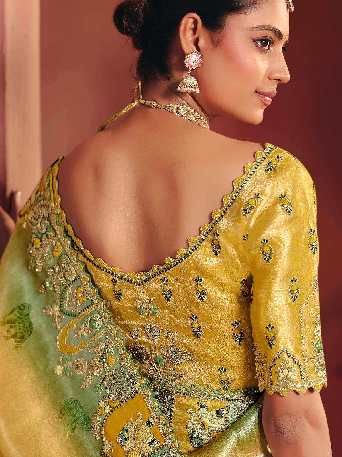 Distinctive unstitched blouse designed on rich silk featuring expressive peacock and feminine motifs. Heavily worked borders crafted through zari, zardosi, sequins, beads, embroidery add depth and grandeur. Warm mustard yellow tone complements wedding, bridal, reception, sangeet, haldi ceremonies, reflecting heritage appeal, joyful warmth, artisanal excellence.