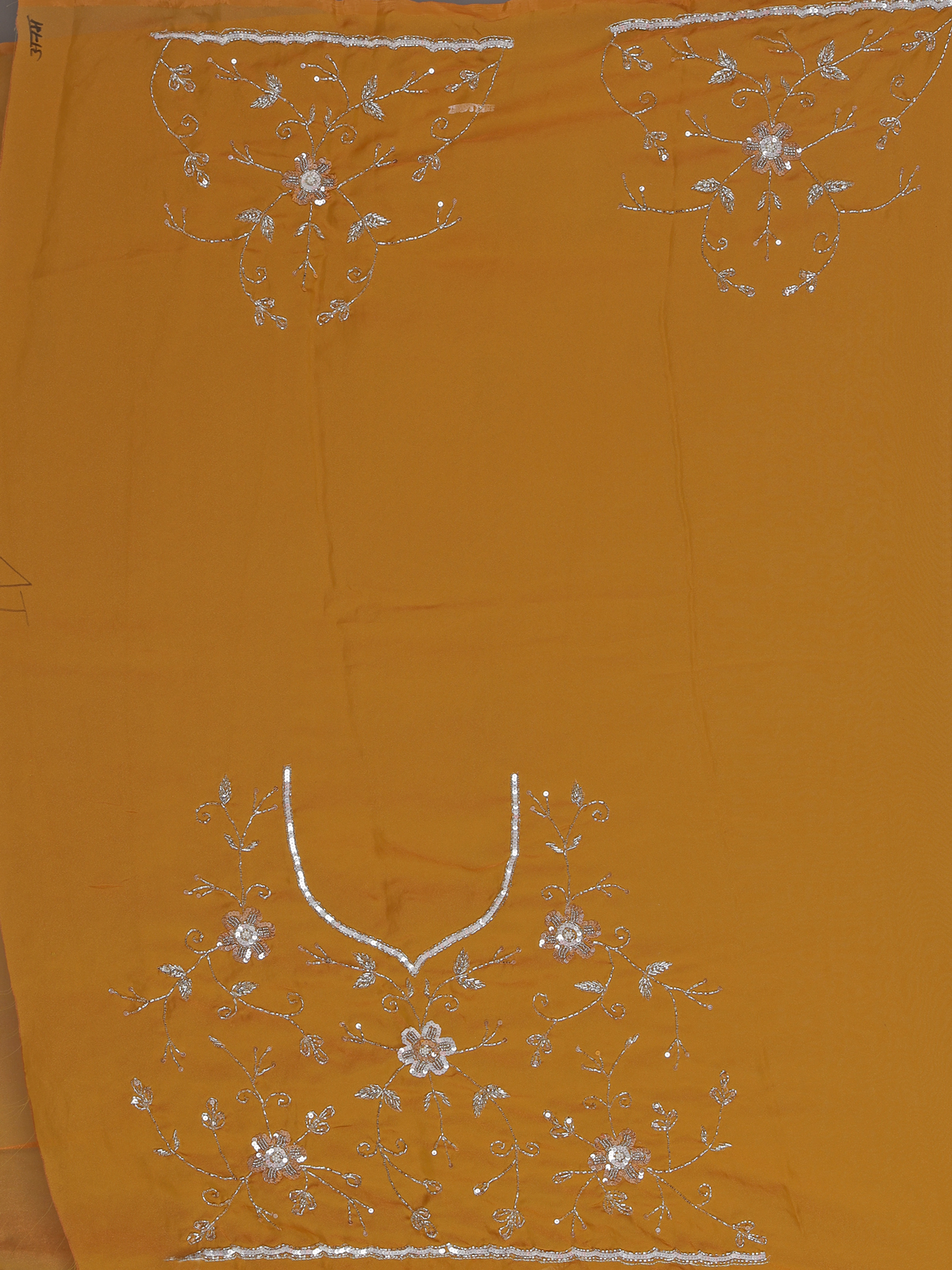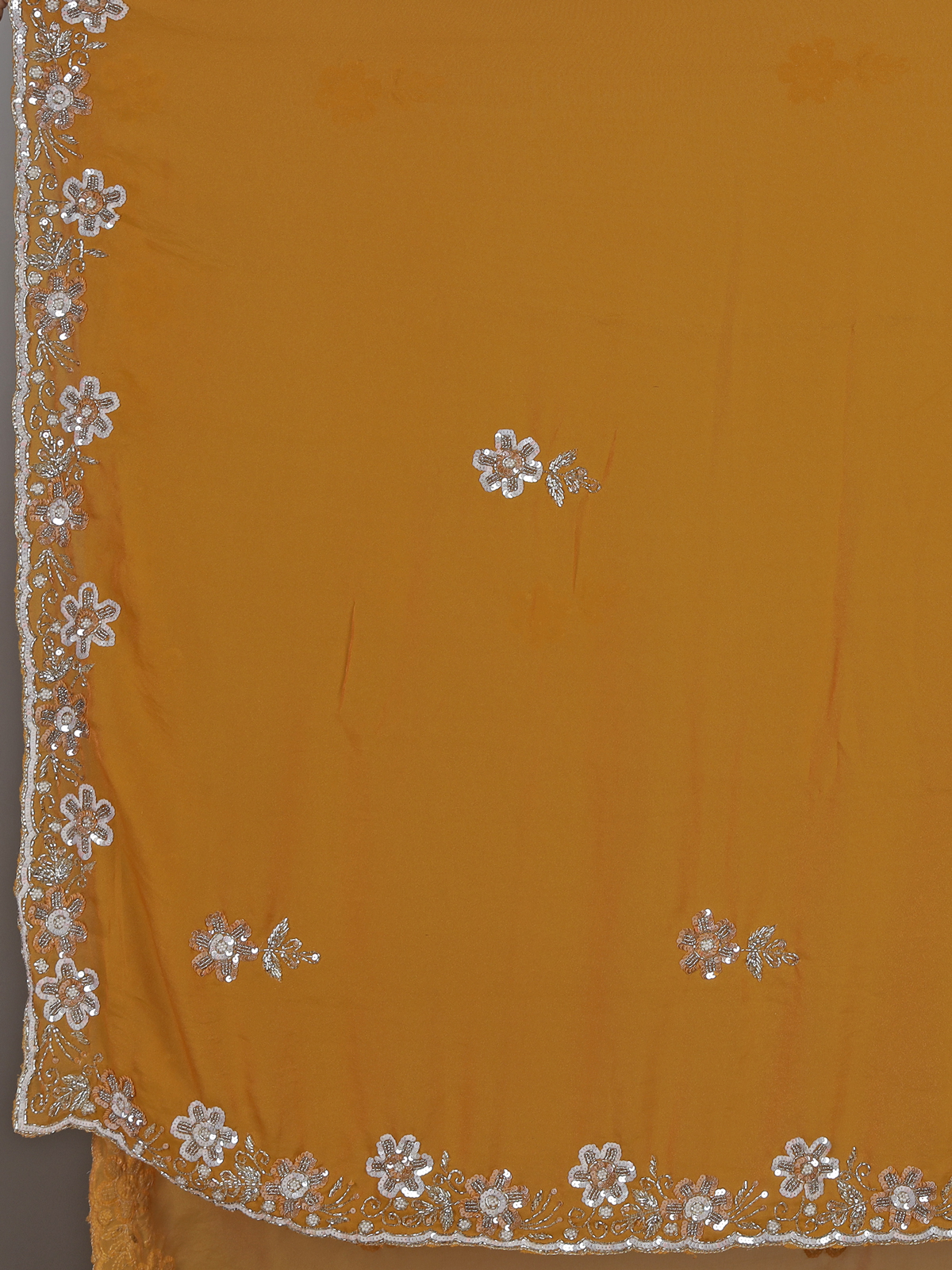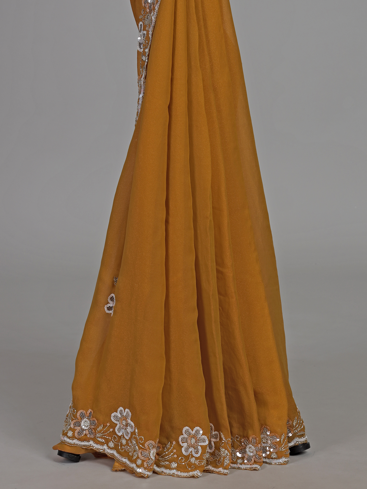 Bright mustard yellow tones illuminate this chiffon saree designed for joyful haldi celebrations. Embellished with cutdana, sequins and pearls work. It sparkles with festive brilliance. The airy drape enhances comfort and movement. Ideal for weddings, haldi and sangeet, this saree includes an unstitched blouse piece for a vibrant and elegant styling experience.