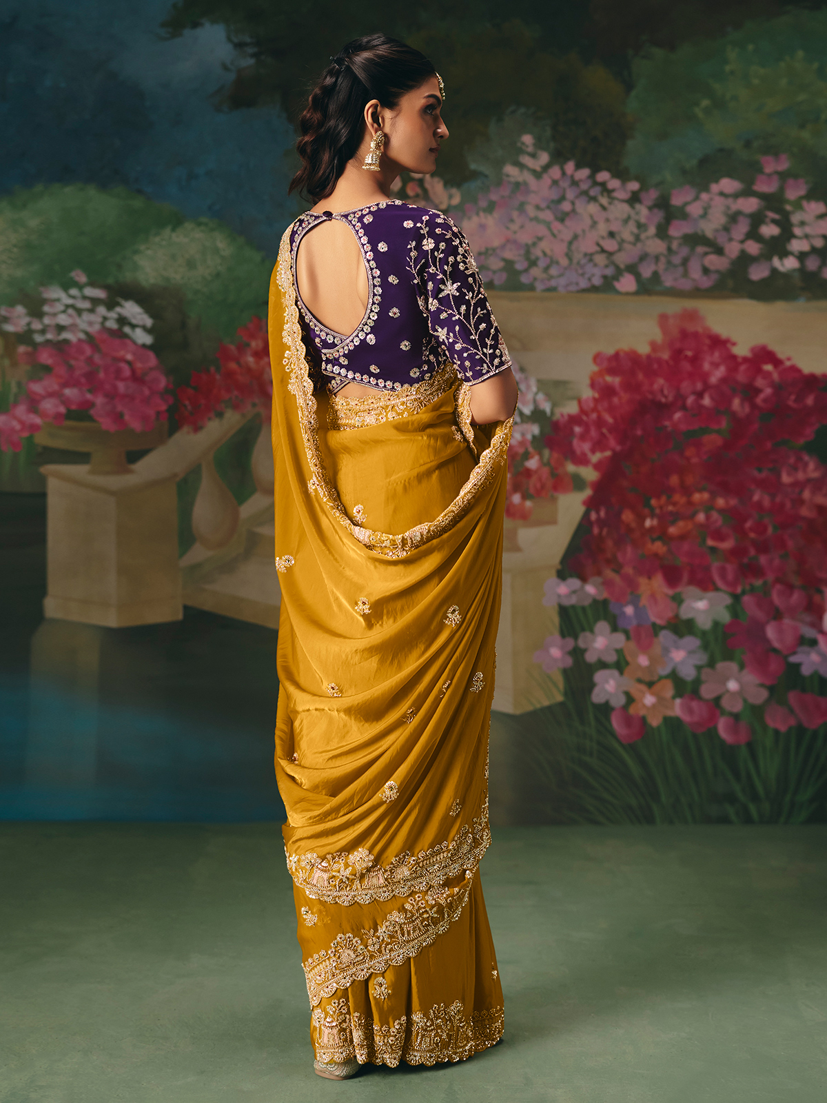 This mustard yellow chinon silk saree is teamed with a heavy work contrast blouse. Embellished with cutdana, beads and sequins work. Radiating festive warmth, it is an excellent choice for weddings, receptions, sangeet, festive occasions and haldi ceremonies.