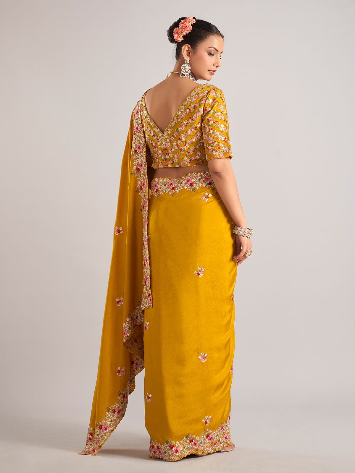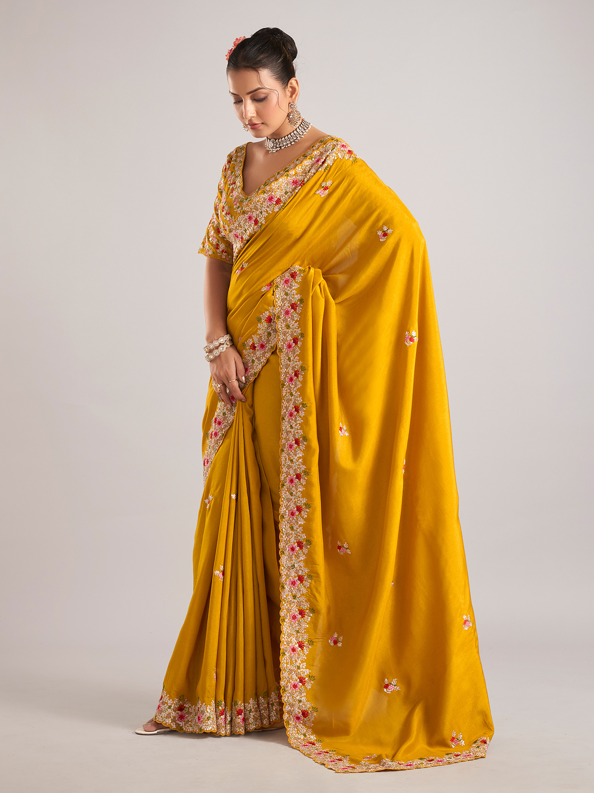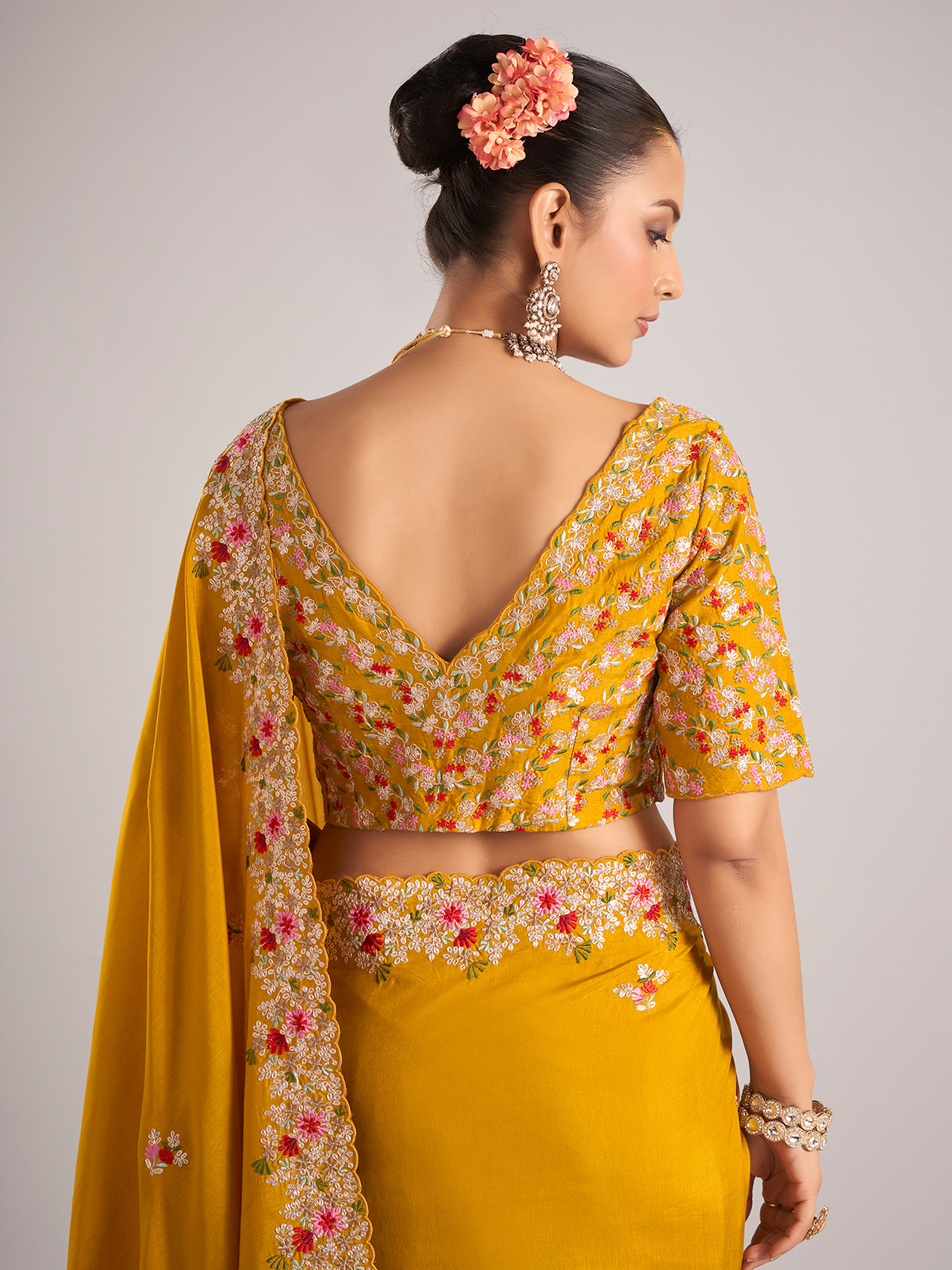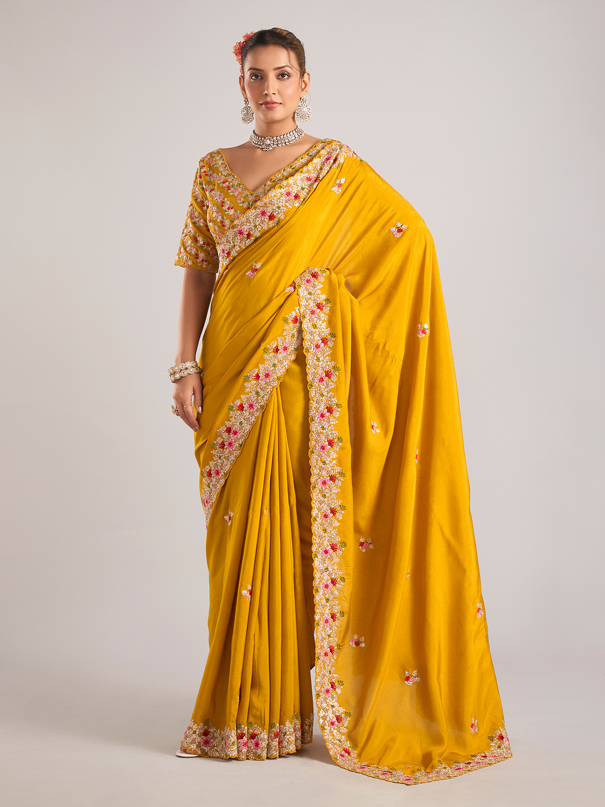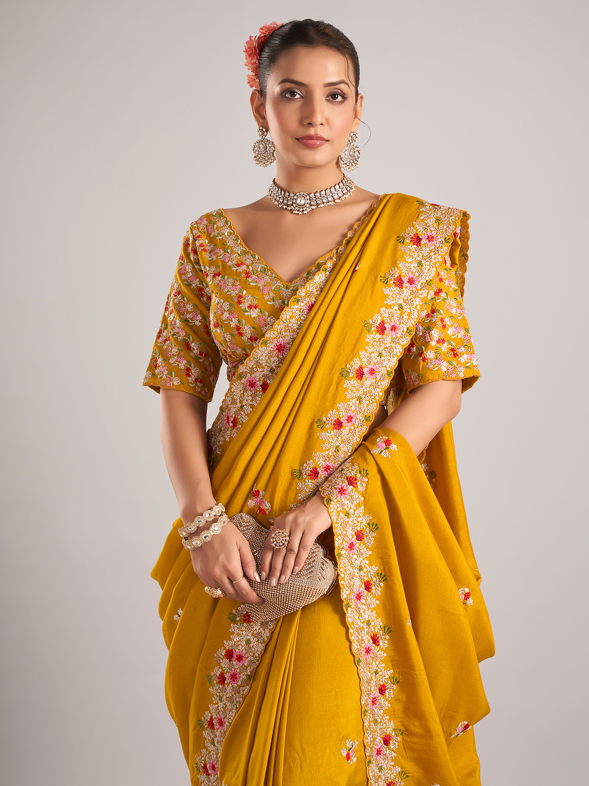 Traditional charm defines this mustard yellow pure dola silk saree, highlighted with resham and fine embroidery. Ideal for haldi and wedding ceremonies, it comes with a ready-made blouse.