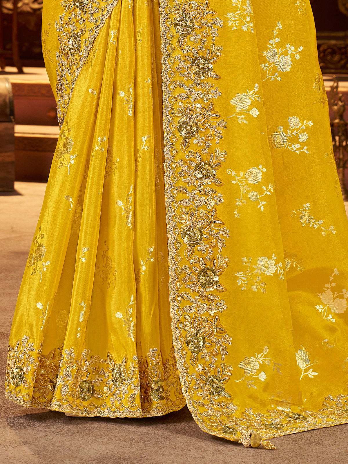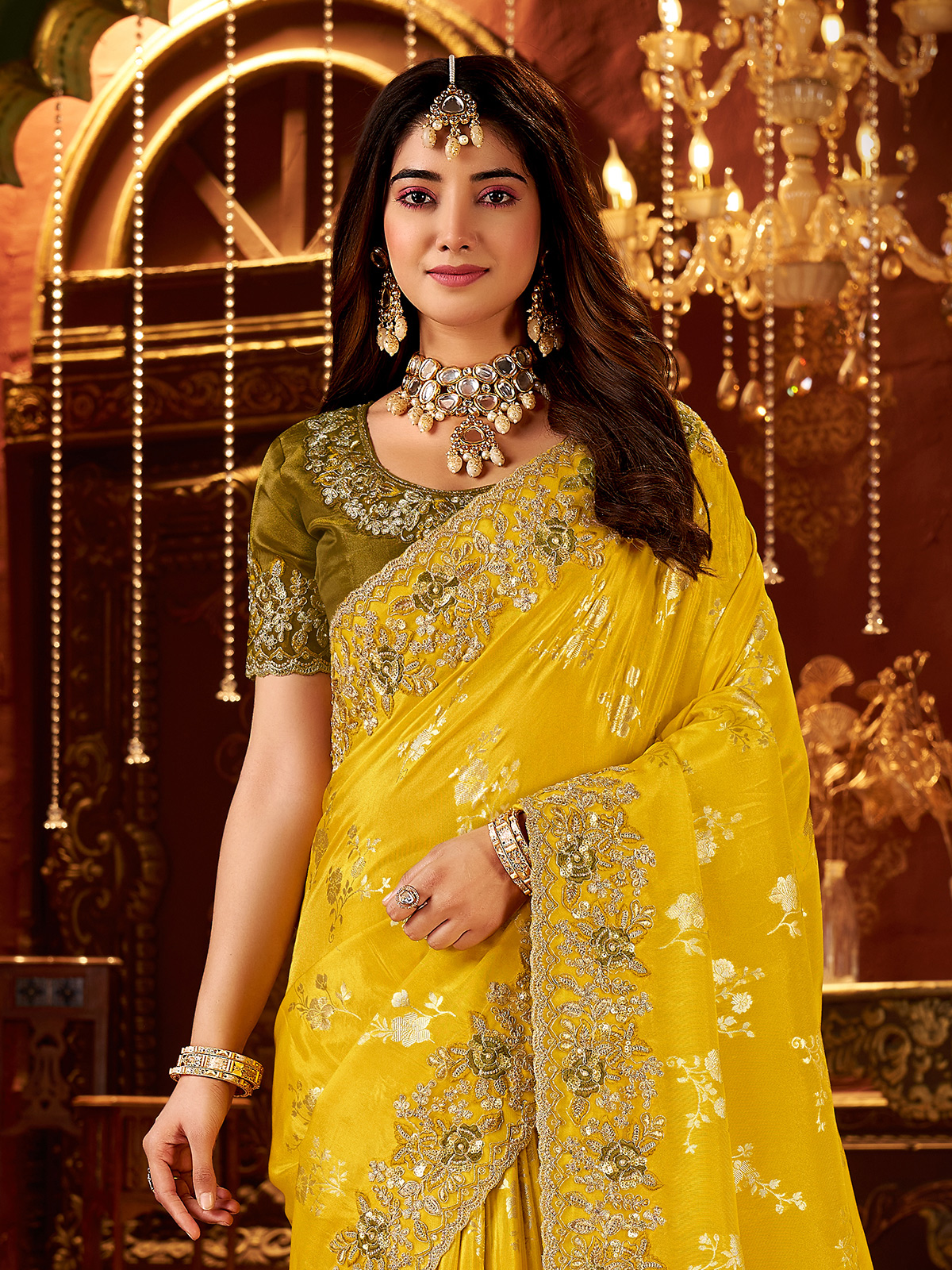 Featuring elegant embroidery with sequins, thread, stone, zardosi, and zari, this mustard yellow soft silk saree comes with a contrast unstitched blouse piece. Perfect for weddings, sangeet, receptions, festive events, and haldi ceremonies.