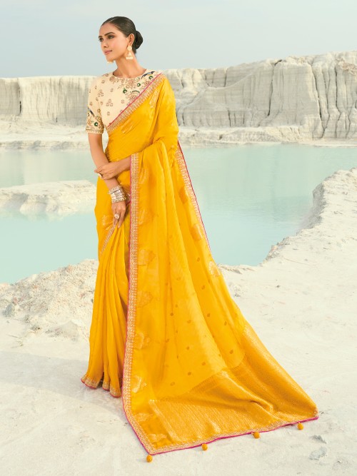 Mustard Yellow Organza Satin Saree With Resham And Zari