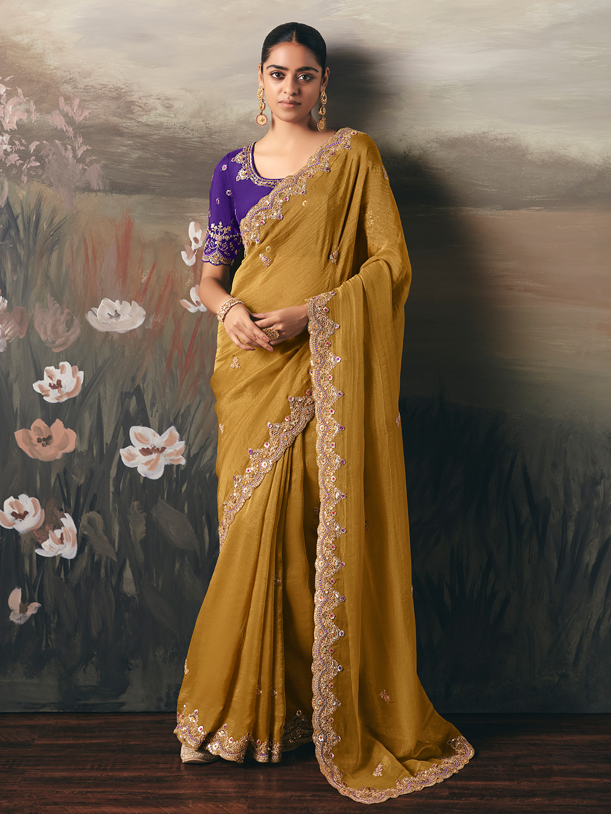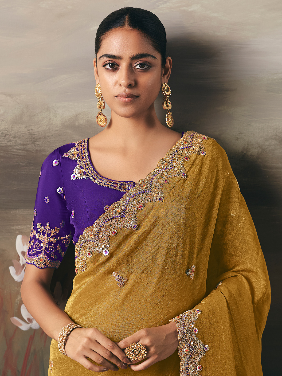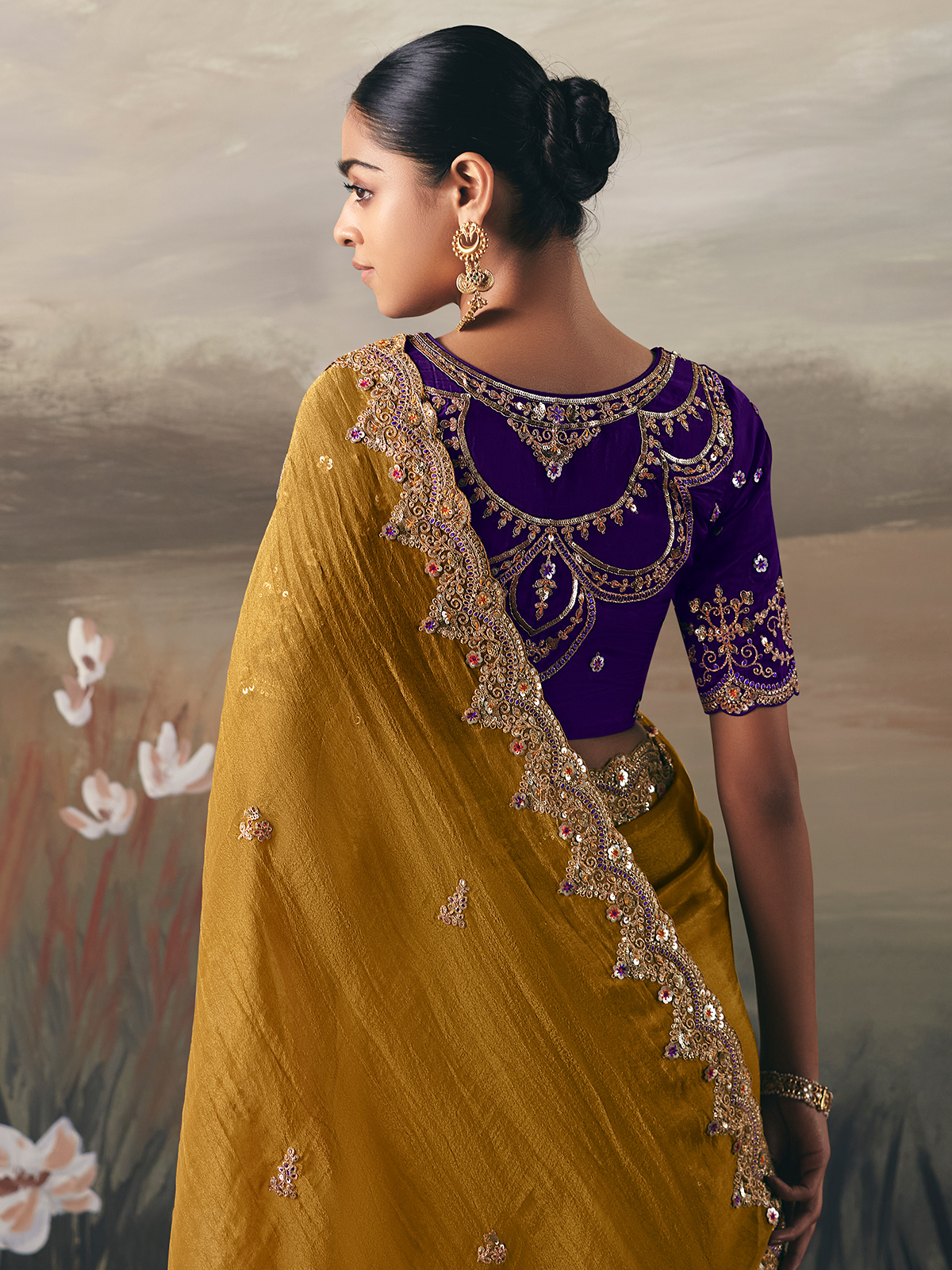 Bright and elegant, this mustard yellow tissue silk saree features sequins, stones, zardosi, resham, embroidery, and bead work. The ornate border heightens its festive charm. Perfect for weddings, haldi, receptions, and sangeet, it includes an unstitched blouse.