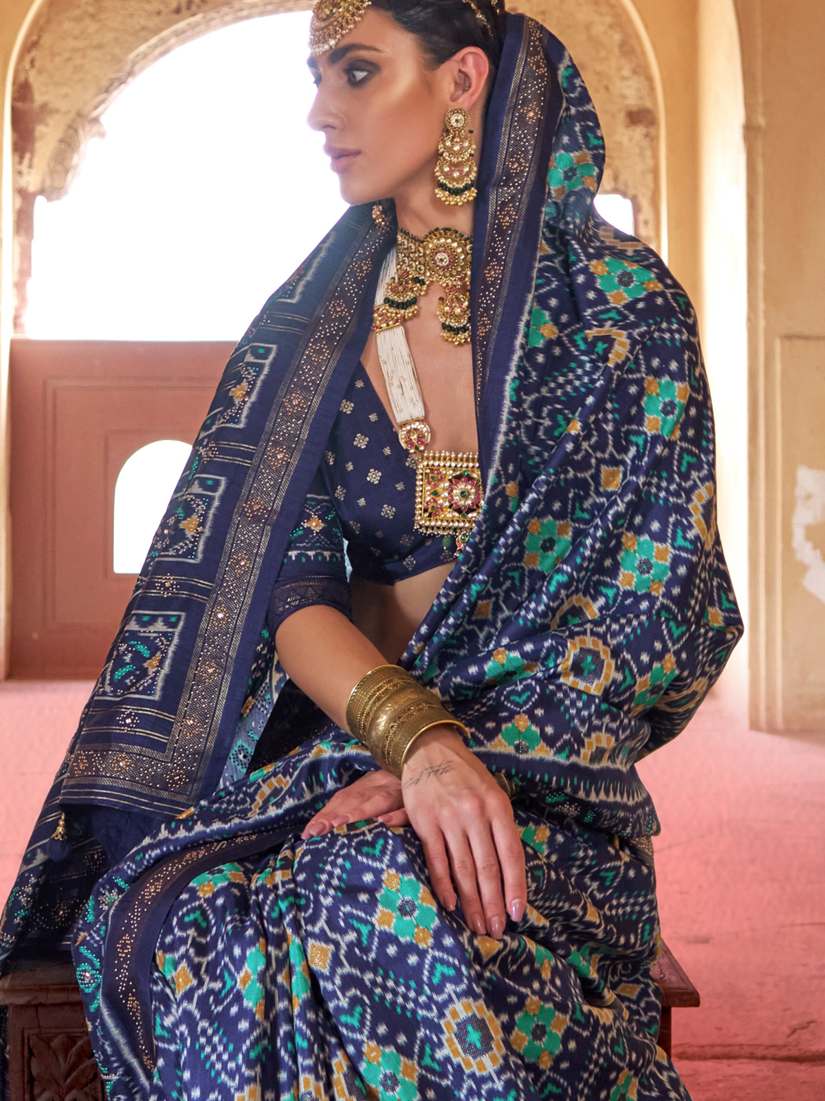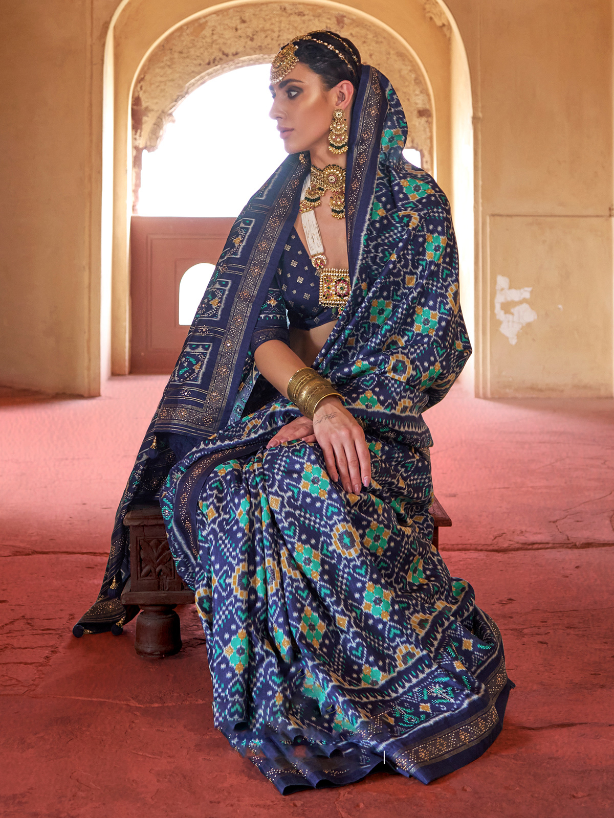 Navy Blue Printed Patola Silk Saree For Festive Wear
