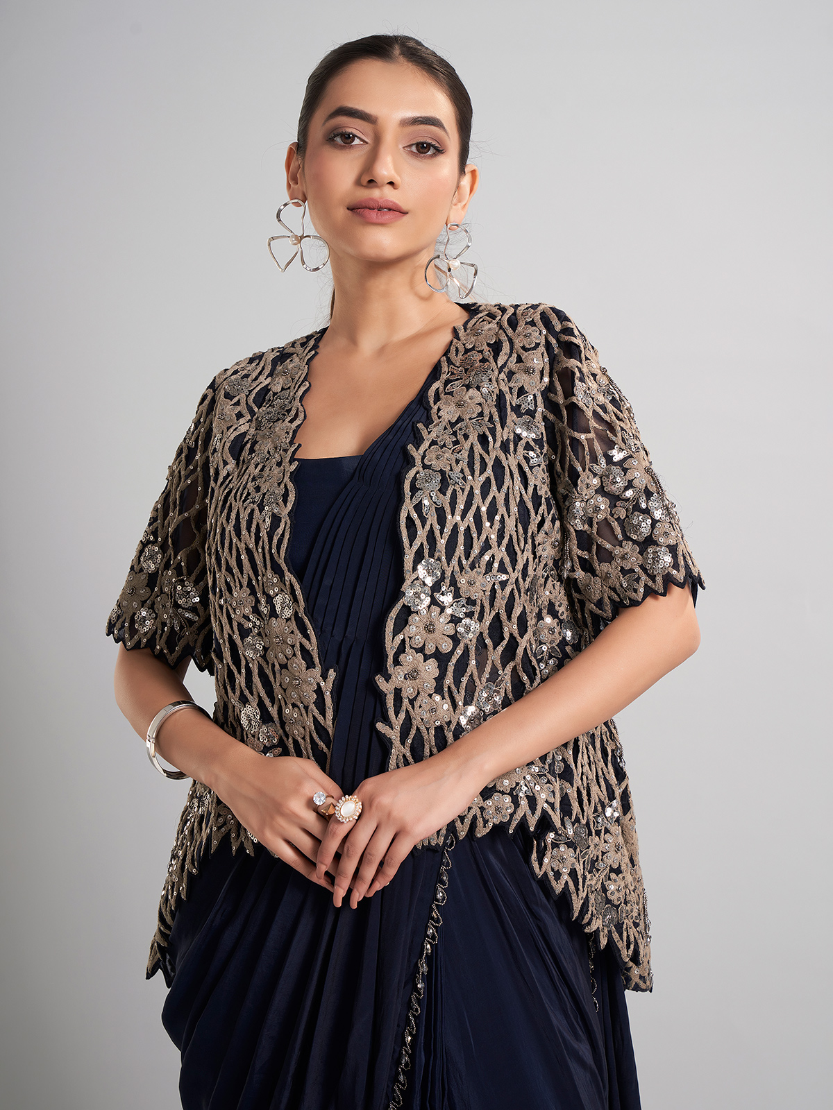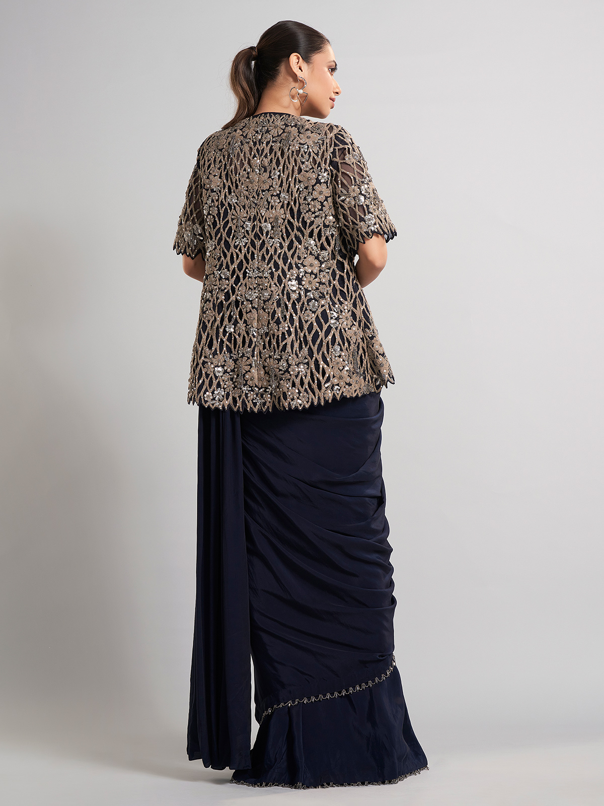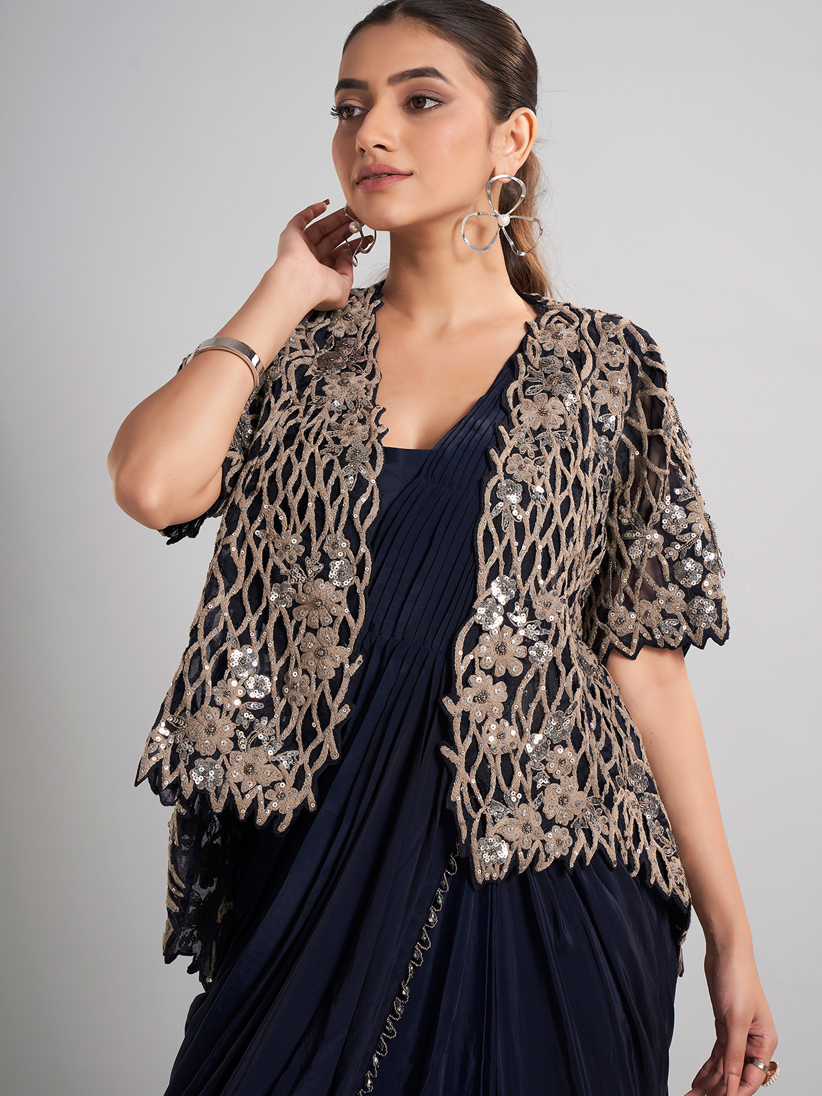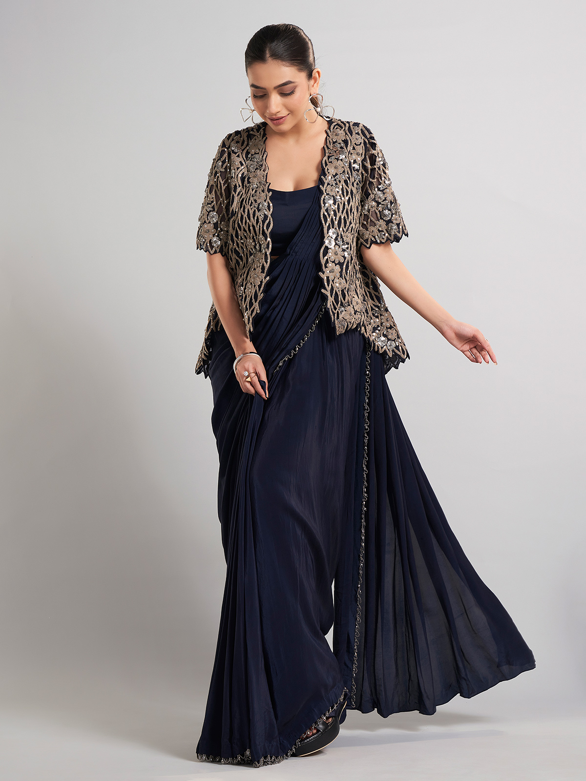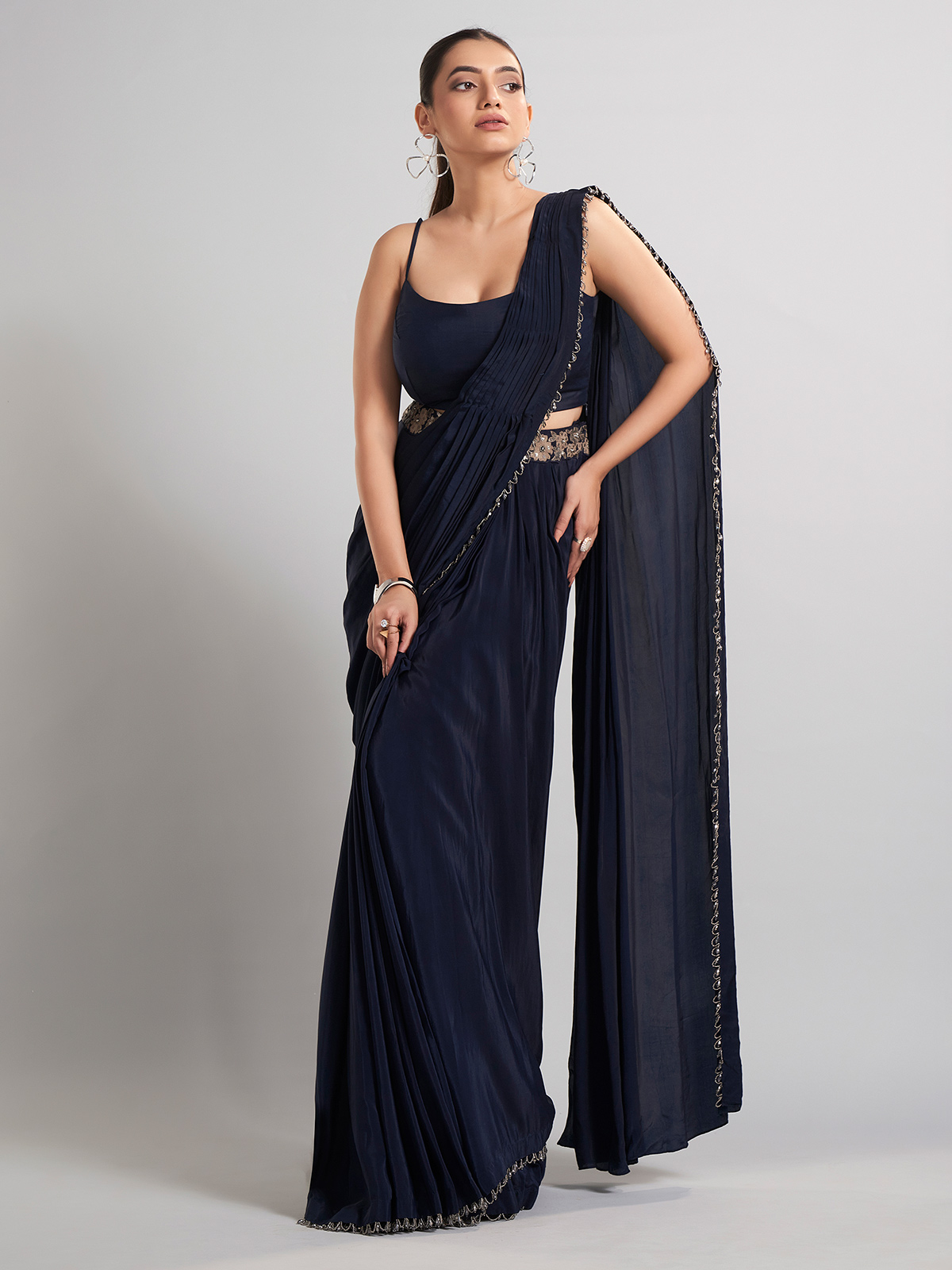 Navy Chinon Silk Party Wear Ready To Wear Saree