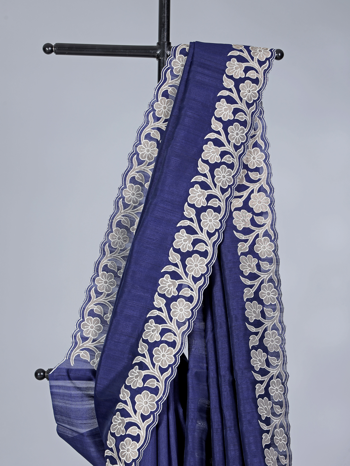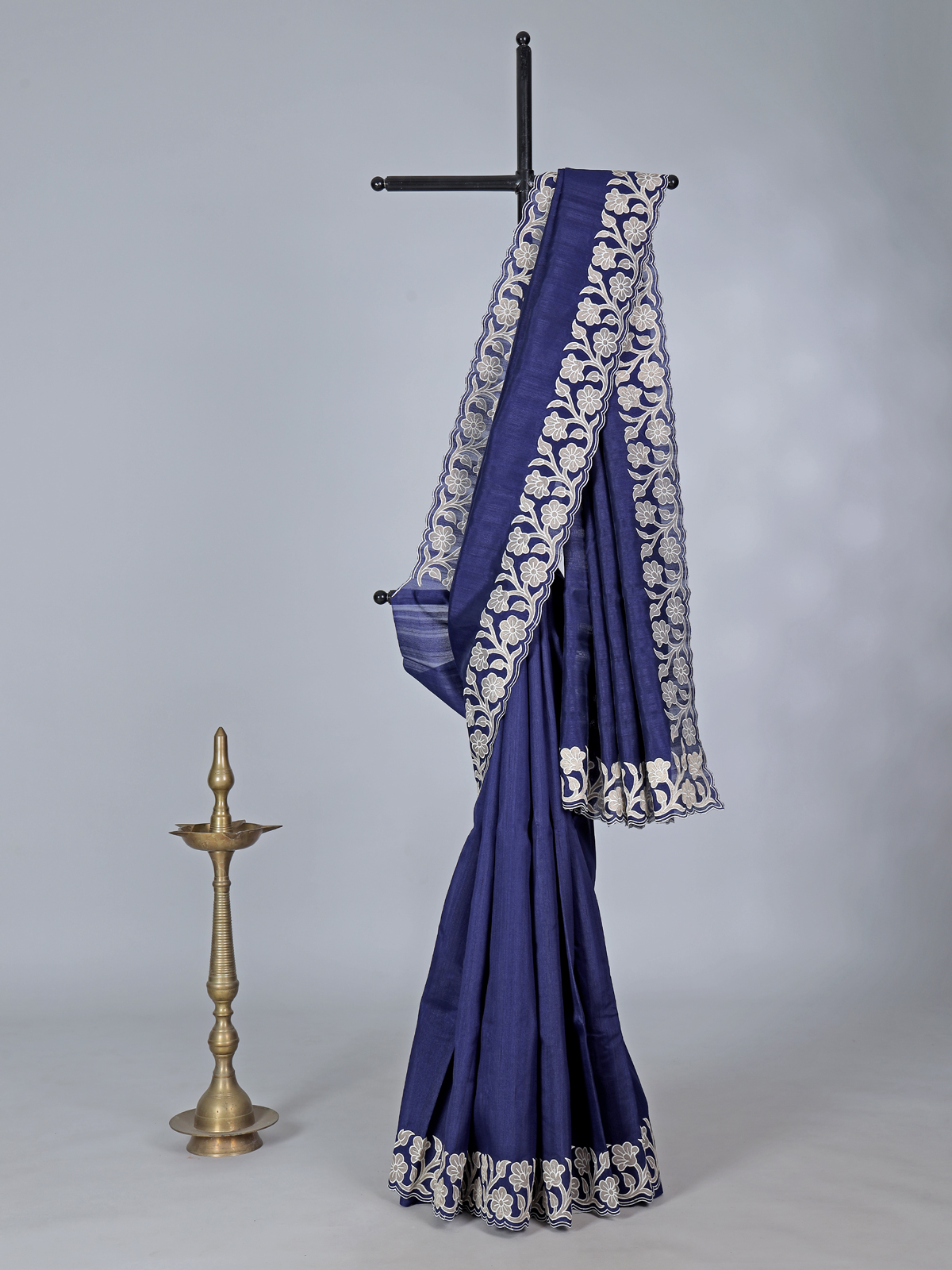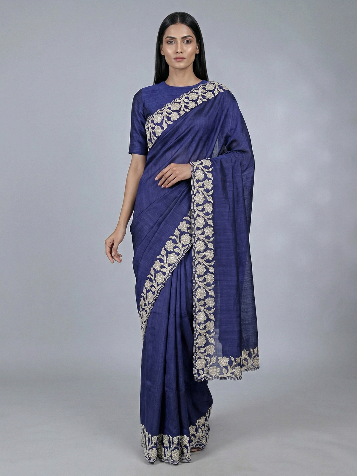 Capturing poised sophistication and celebratory spirit, this navy semi tissue silk saree highlights a your refined beauty with its deep hue and soft sheen. Designed with elegant embroidery and an intricate cutworked border, it offers a regal finish. Suitable for festive gatherings and party wear, it includes a coordinating unstitched blouse piece.