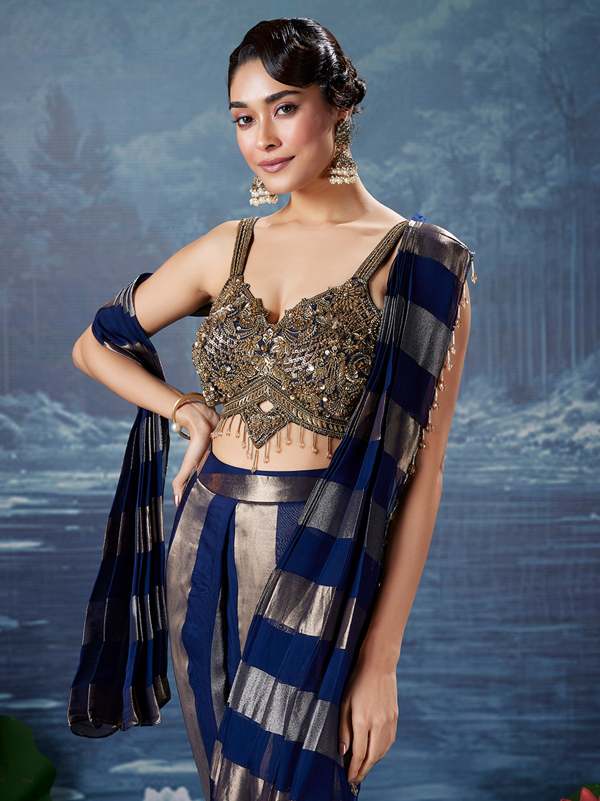 Look radiant in navy silk touched with golden tones, ready-to-wear saree adorned with intricate prints. Cutdana, sequins, and beads flicker like molten light across the folds, giving her drape a luminous elegance. A readymade blouse completes the ensemble for festive nights and joyous parties.