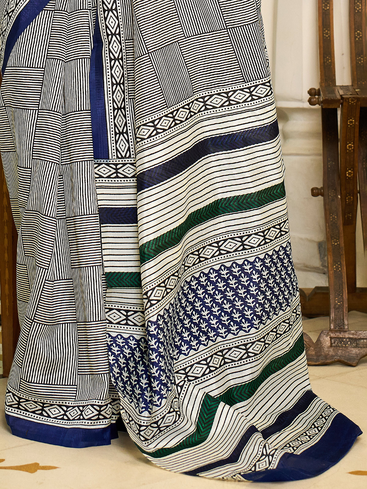 Step into sophistication with this navy Bhagalpuri silk saree. The modern print design and luxurious fabric come together for an effortlessly elegant look. Complete with an unstitched blouse piece for a custom fit.