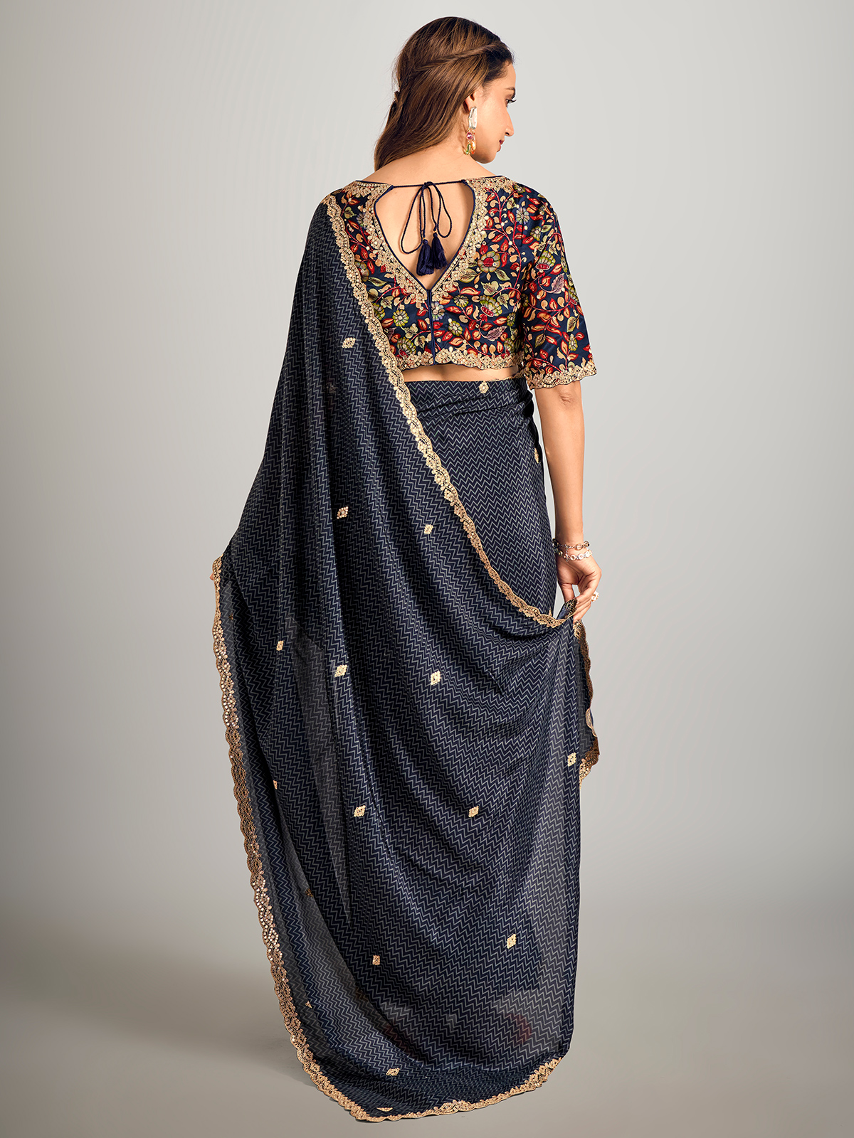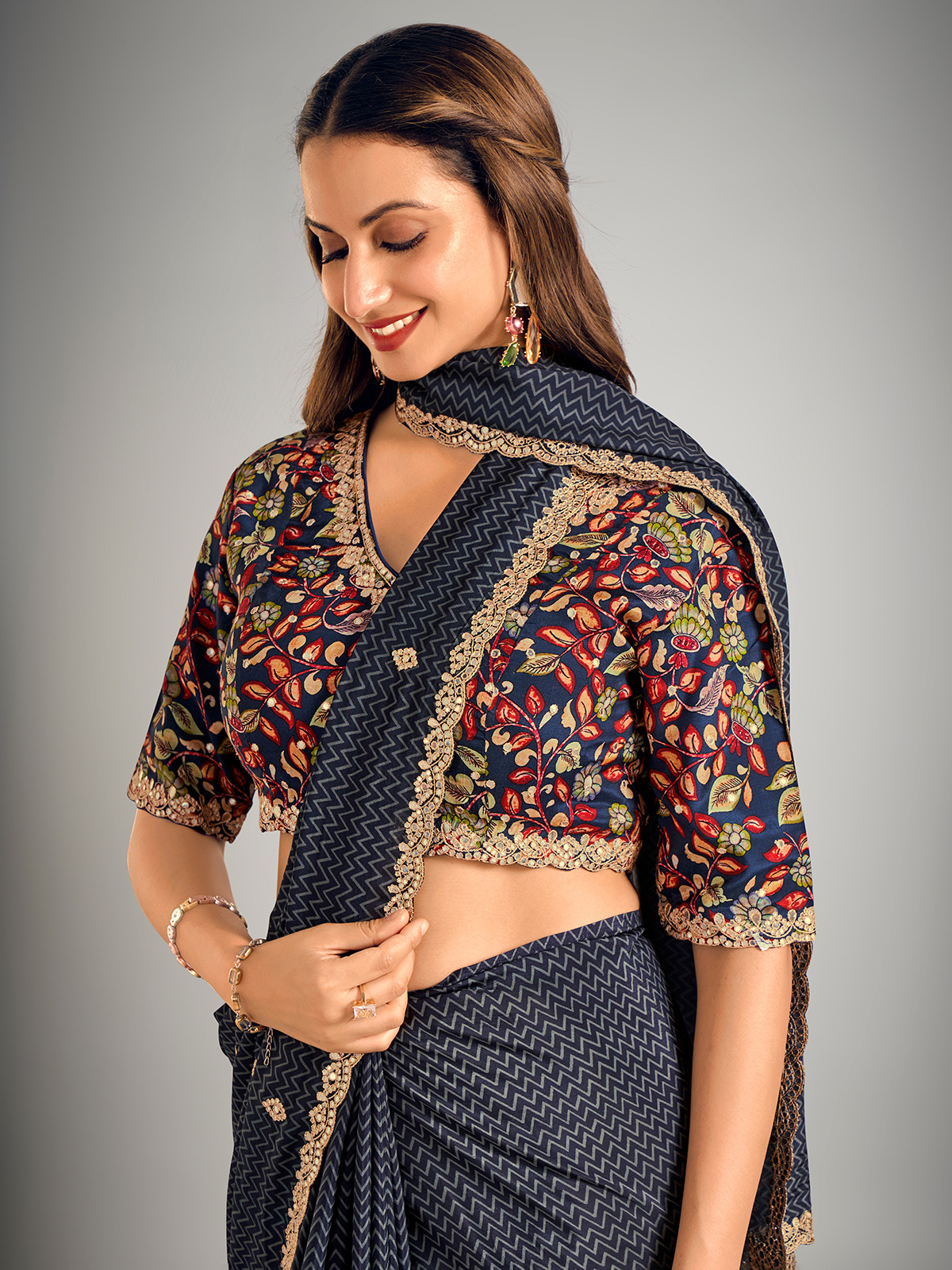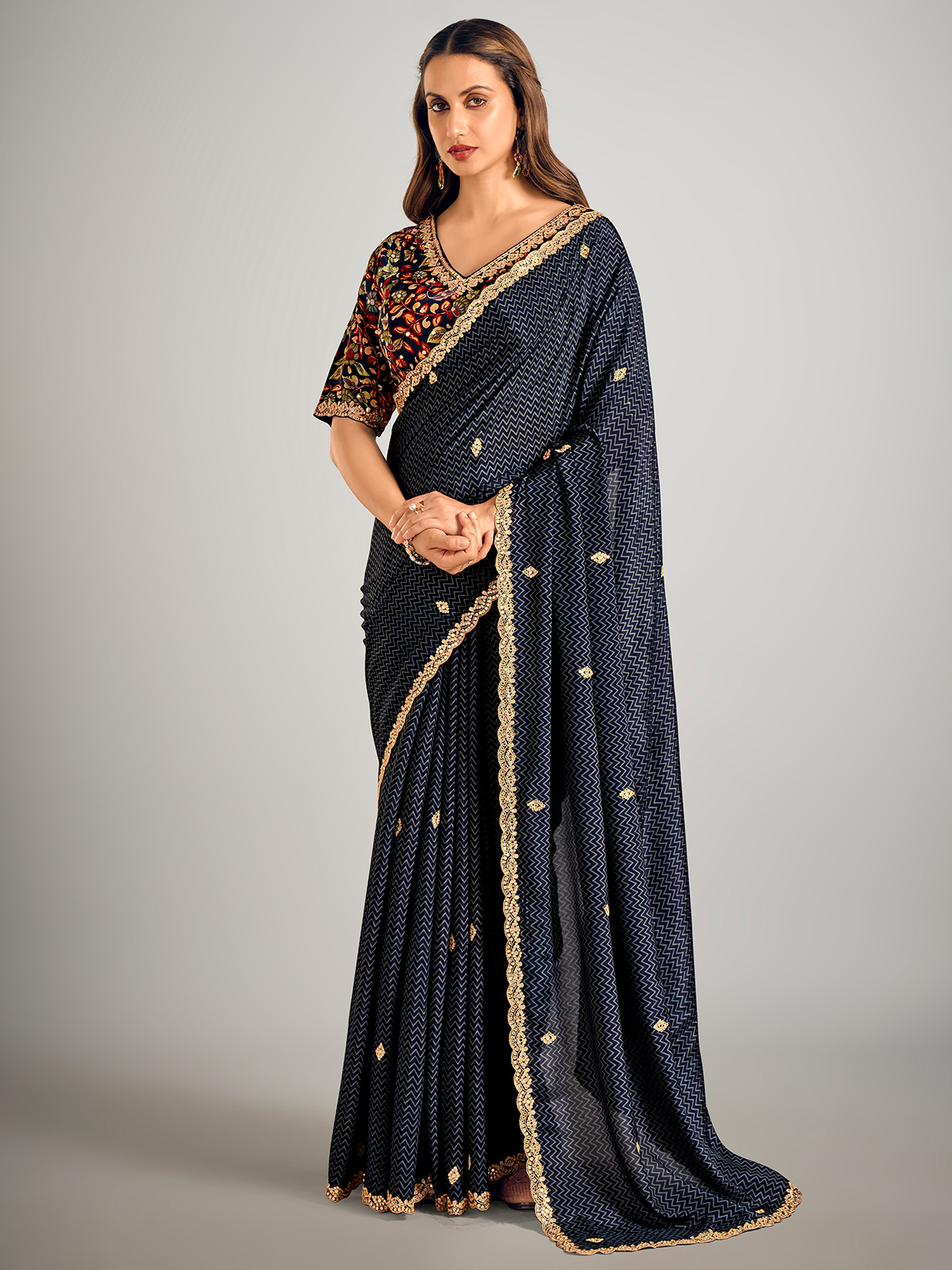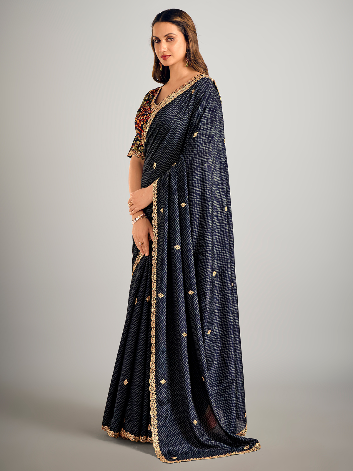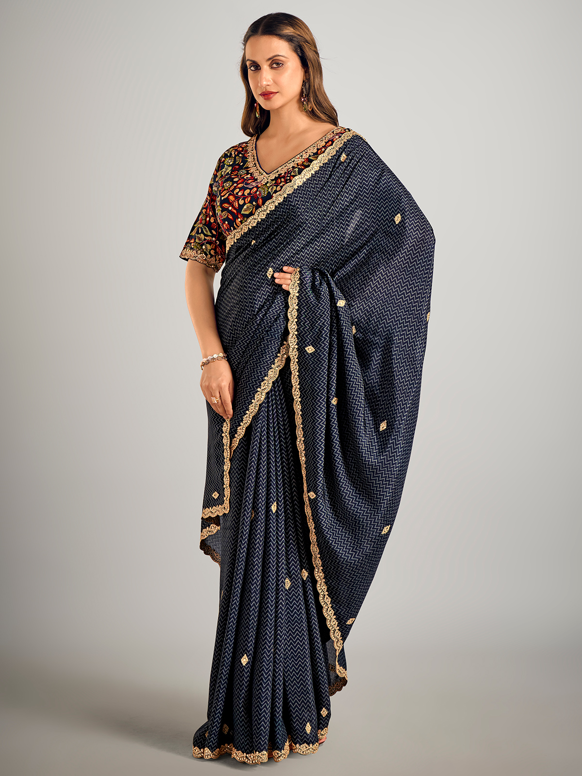 The mesmerizing gota, resham, and aabla work design of this navy printed crepe silk saree lends a glamorous touch to any occasion attire. A ready-made blouse is included.