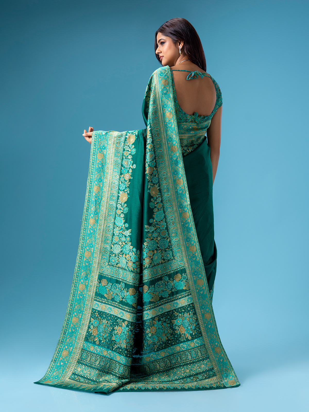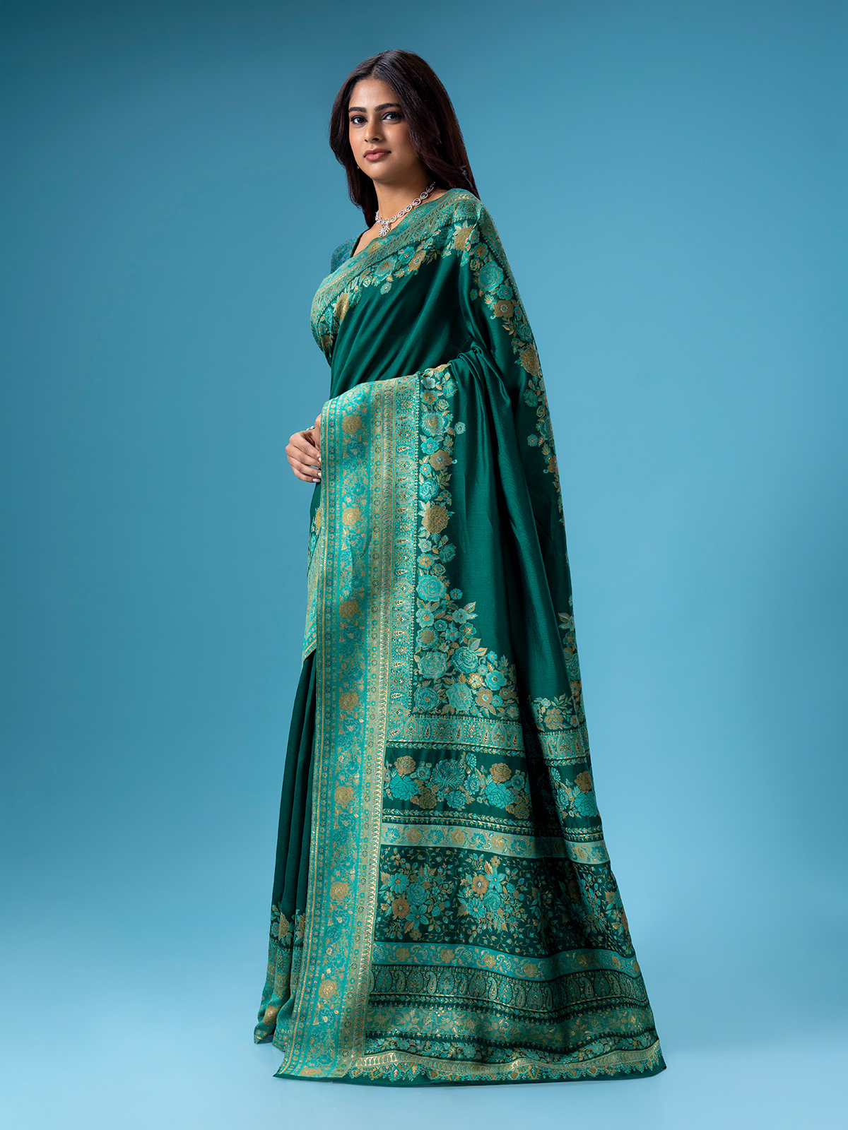 Add timeless versatility to your wardrobe with this dark green pashmina silk saree. Featuring elegant Kashmiri weaving it is a graceful pick for both festive and formal occasions. Comes with a matching blouse piece.