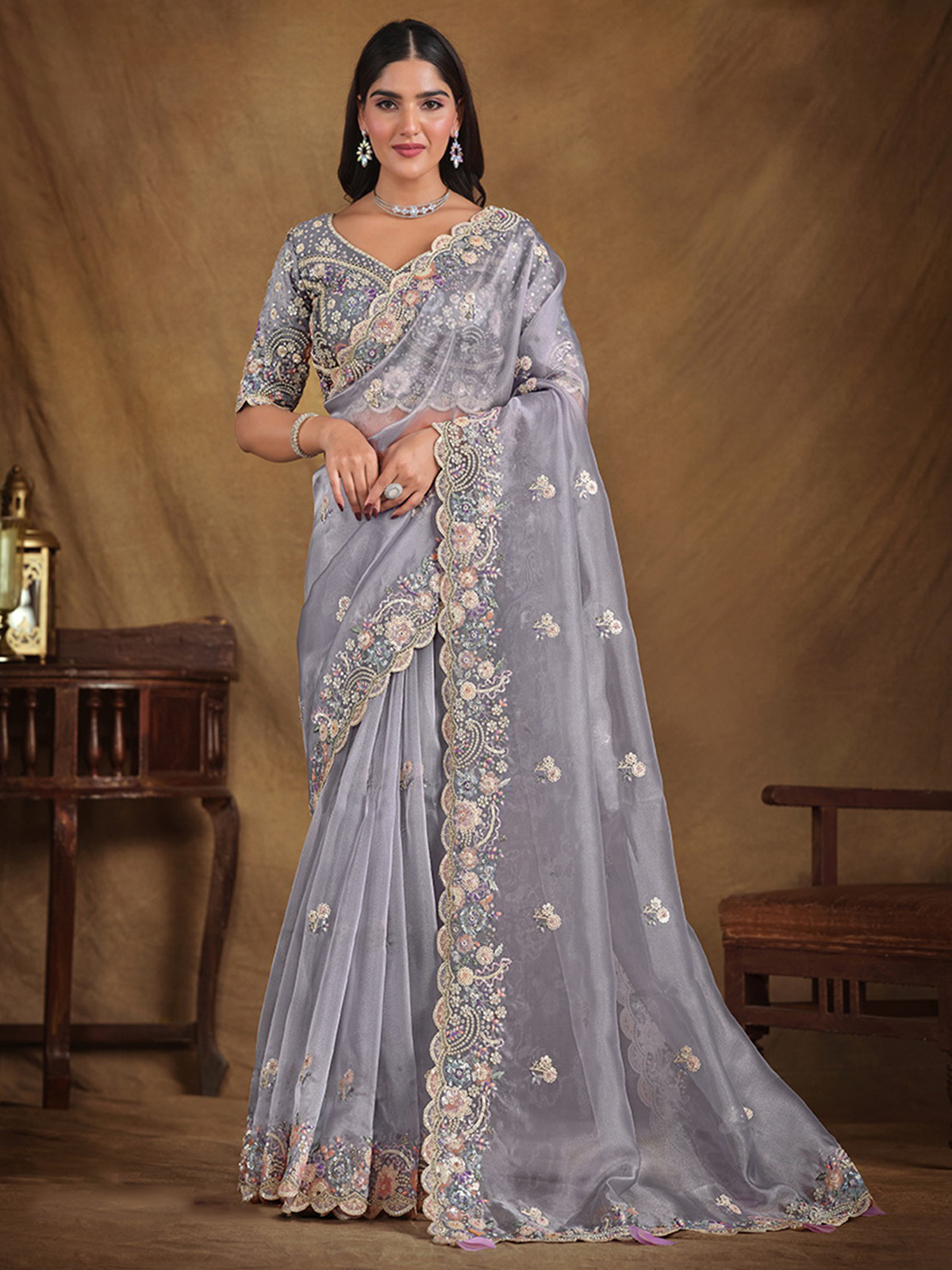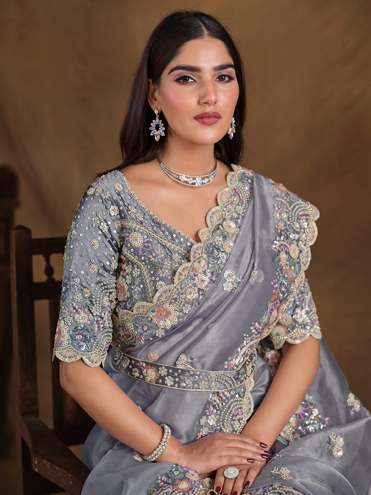 Indulge in regal charm with this grey organza saree, ideal for various functions. The exquisite embroidery, sequins, beads, cutdana, stone, thread, and resham work create a majestic look. Paired with an unstitched blouse piece for a coordinated ensemble.