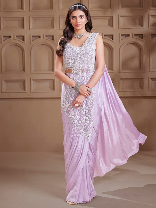 Wearing this lavender designer satin ready-to-wear saree will add to your ethnic charm and make you look sophisticated. It is a distinctive choice because it is embellished with sequins, cutdana, stone, and beaded work. Includes a pre-made blouse.