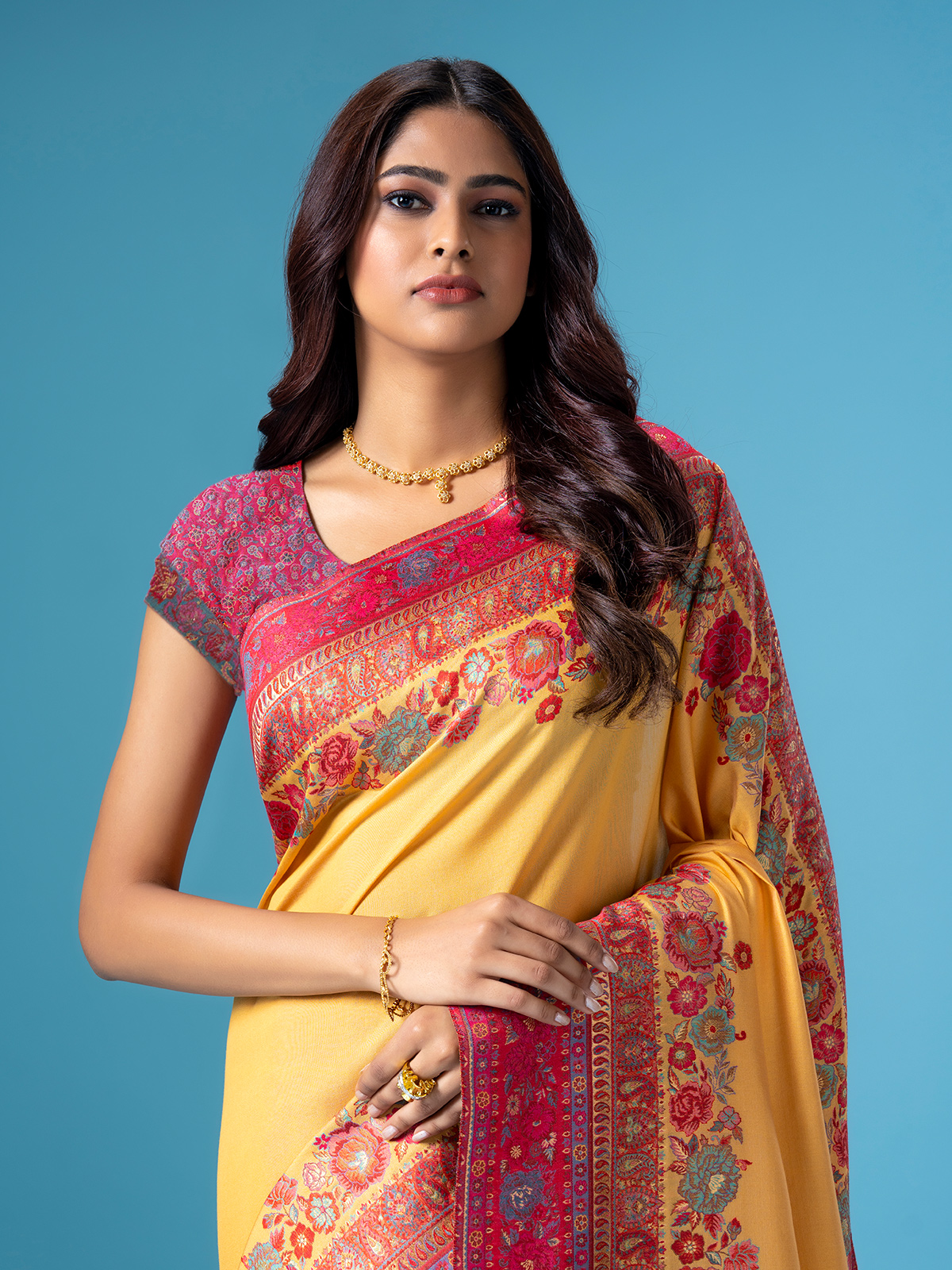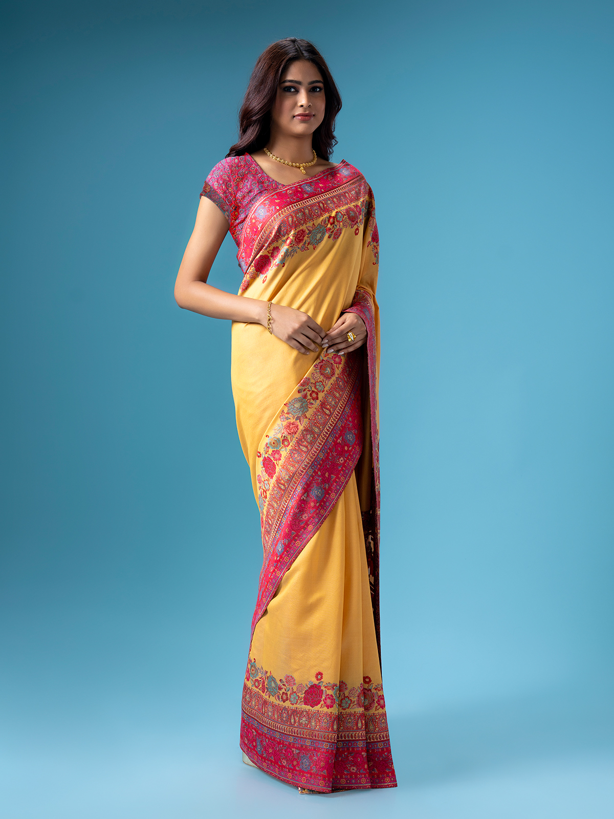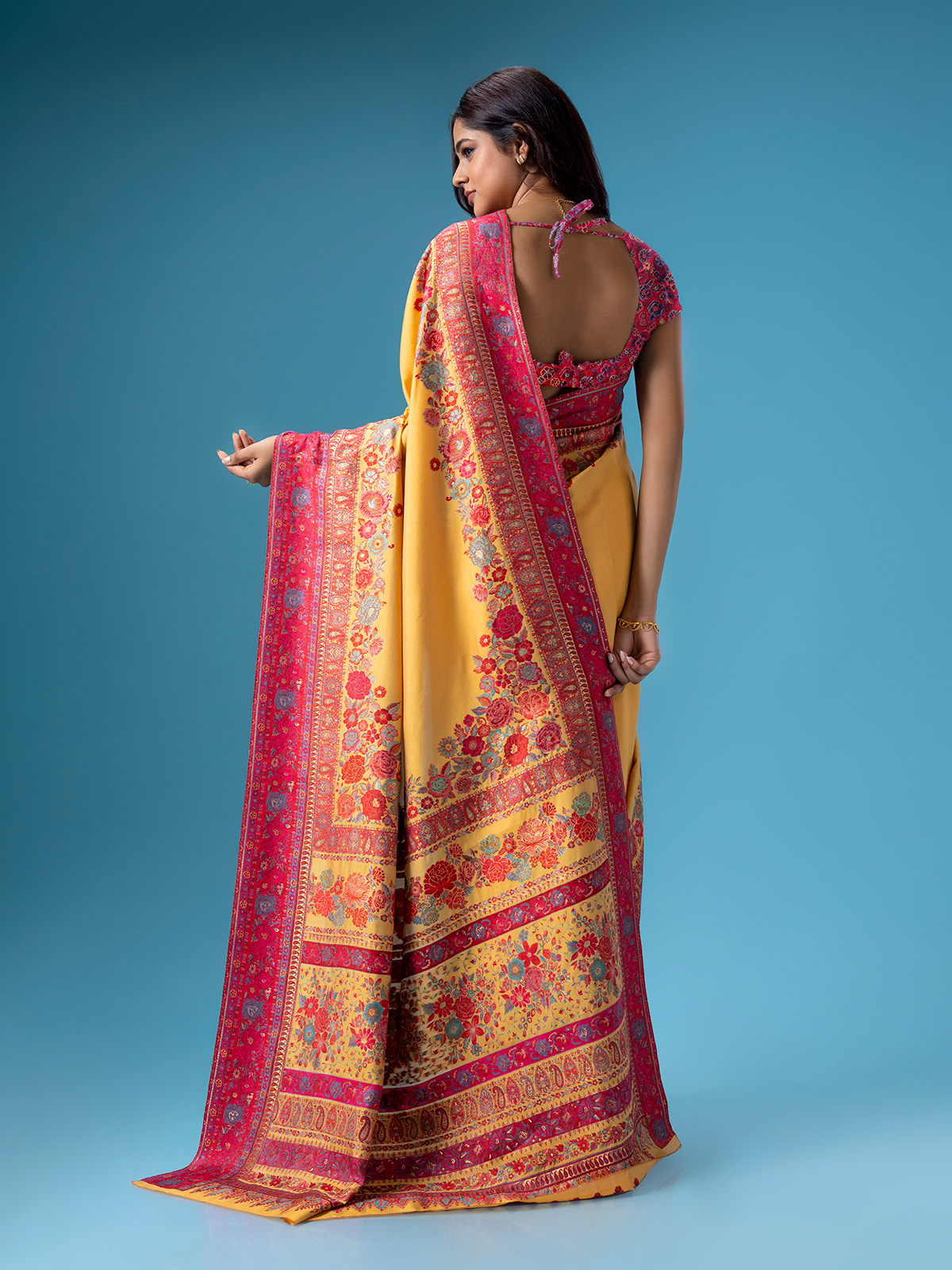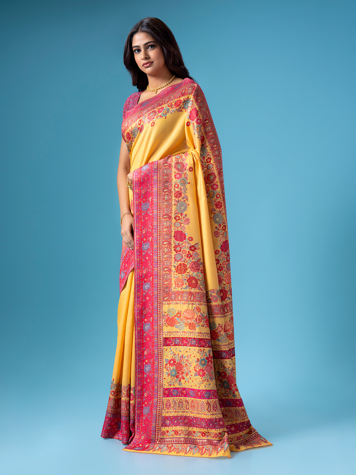 Soft and versatile this yellow pashmina silk saree features a contrasting border and pallu enhanced with elegant Kashmiri weaving. A perfect blend of tradition and contemporary charm. Comes with a matching blouse piece.
