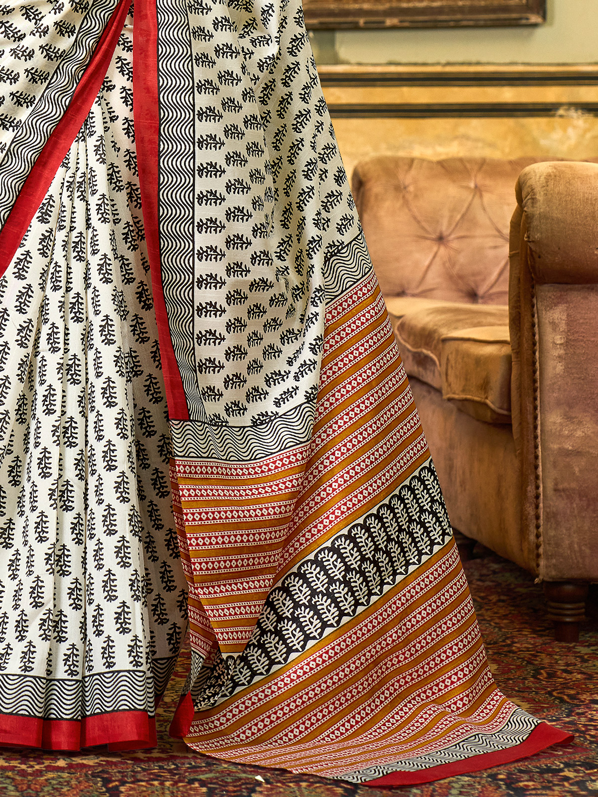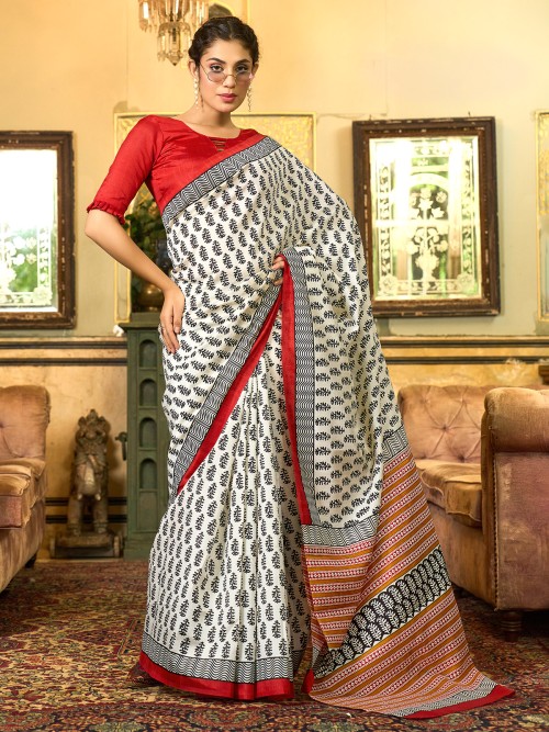 Exude elegance in this off-white saree featuring a chic printed pattern, showcasing the contemporary style of modern Bhagalpuri silk fabrics. An unstitched blouse piece is included for customization.
