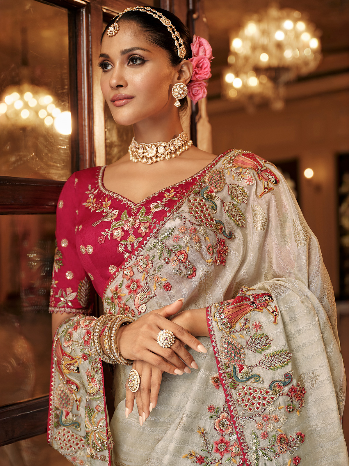 An off-white silk saree unfolds serene elegance, graceful for festive and wedding occasions. Resham, stone, and sequins work bring gentle brilliance, scattering shimmer upon its calm tone. Styled with a maroon unstitched blouse piece, it reflects refinement, artistry, and heritage charm, becoming an ensemble that glows with understated beauty and timeless silk tradition.