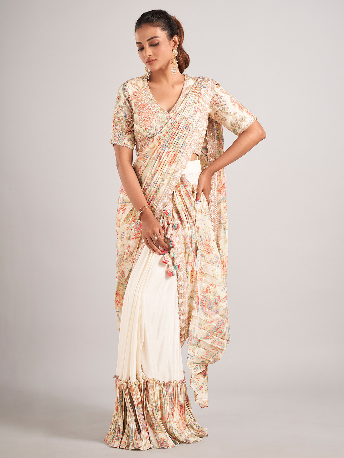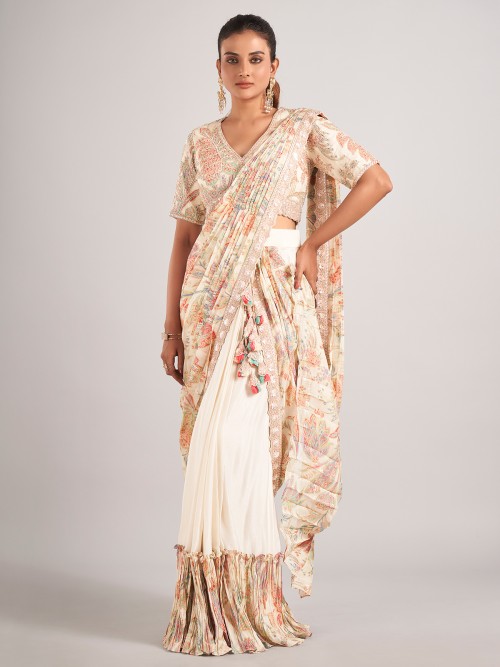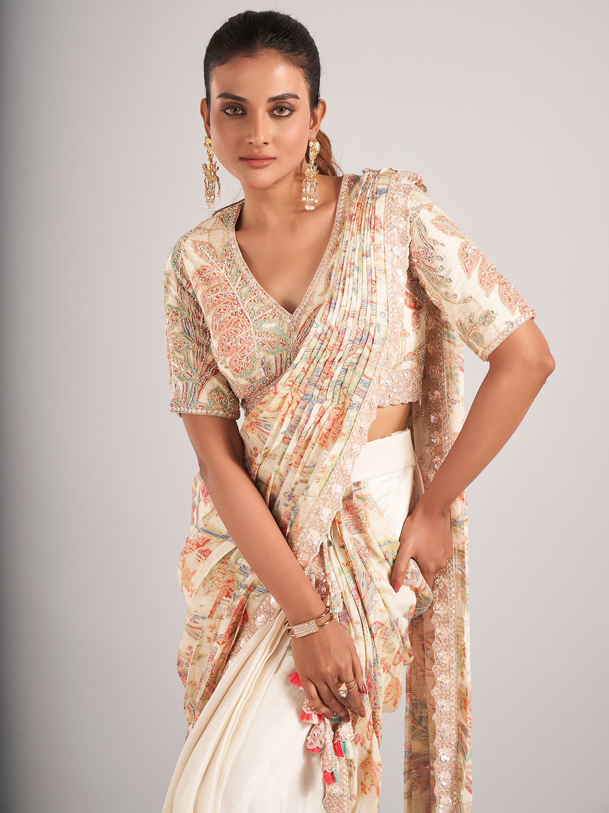 Make a bold statement with this striking off-white designer ready-to-wear saree, crafted from premium imported fabric for a luxurious drape. The saree is embellished with cutdana, sequins, beads, and resham work, adding just the right touch of glamour and chic sophistication. Perfect for weddings, receptions, or evening events, it comes with a ready-made blouse, making it a stylish and hassle-free choice for modern celebrations.