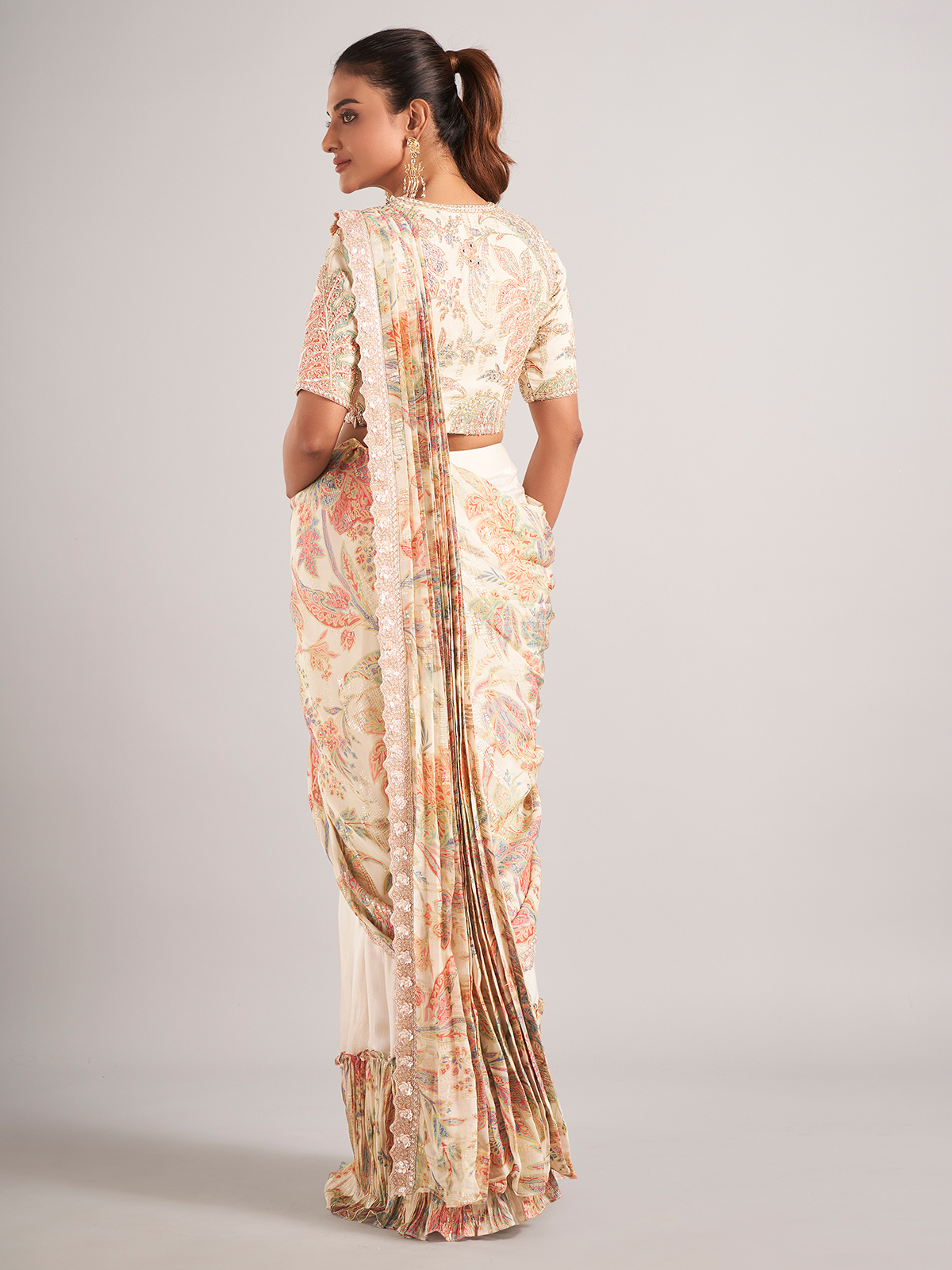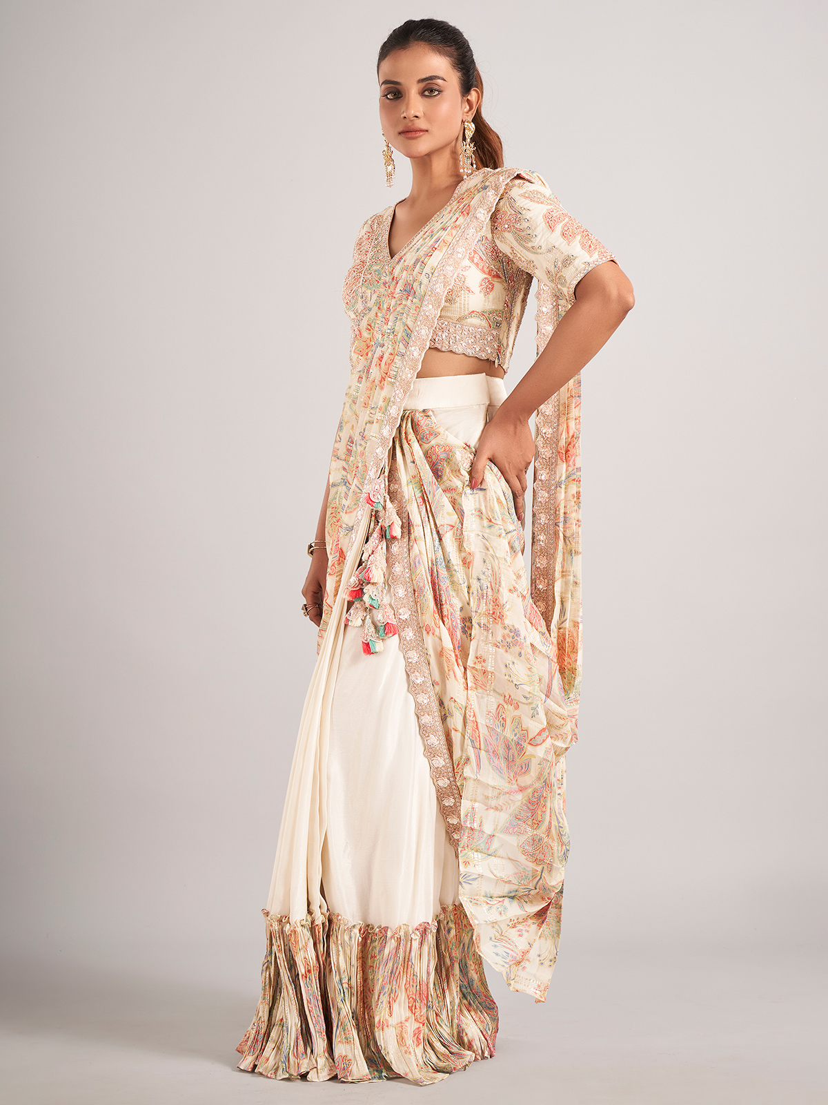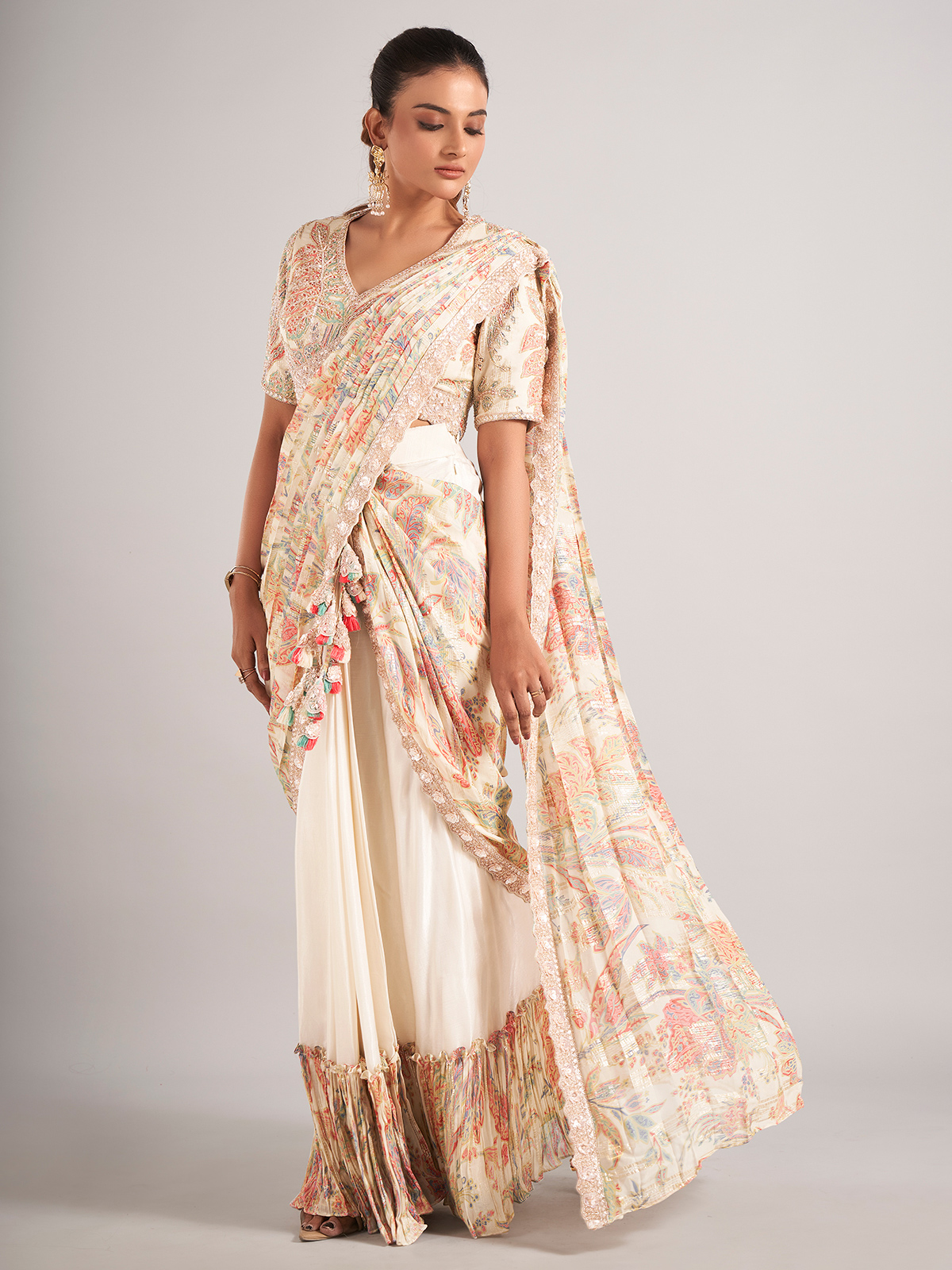 Make a bold statement with this striking off-white designer ready-to-wear saree, crafted from premium imported fabric for a luxurious drape. The saree is embellished with cutdana, sequins, beads, and resham work, adding just the right touch of glamour and chic sophistication. Perfect for weddings, receptions, or evening events, it comes with a ready-made blouse, making it a stylish and hassle-free choice for modern celebrations.