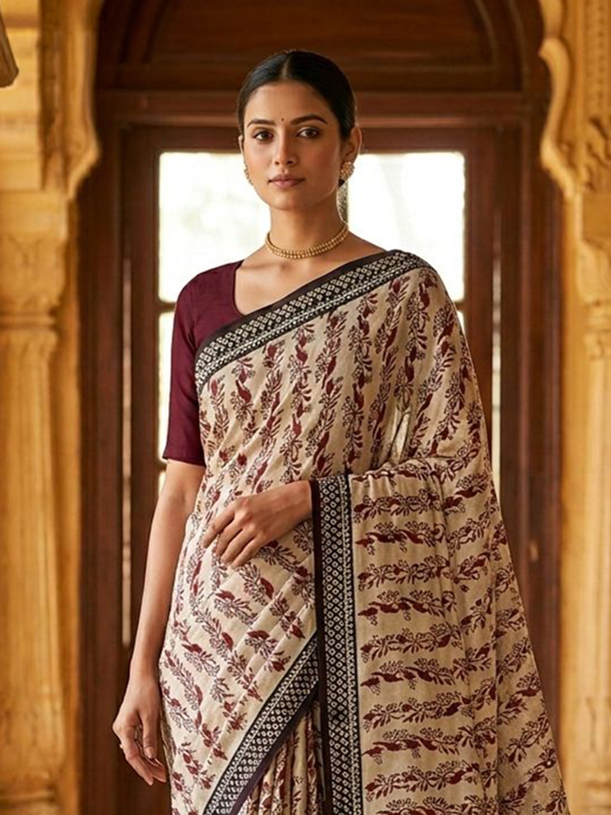 Accentuating your gentle elegance, this off white muslin saree brings a fresh and graceful festive vibe. Featuring refined ethnic printed detailing that adds a clean and sophisticated touch. Perfect for festive occasions, it comes with an unstitched blouse piece for easy customization and a polished ethnic look.