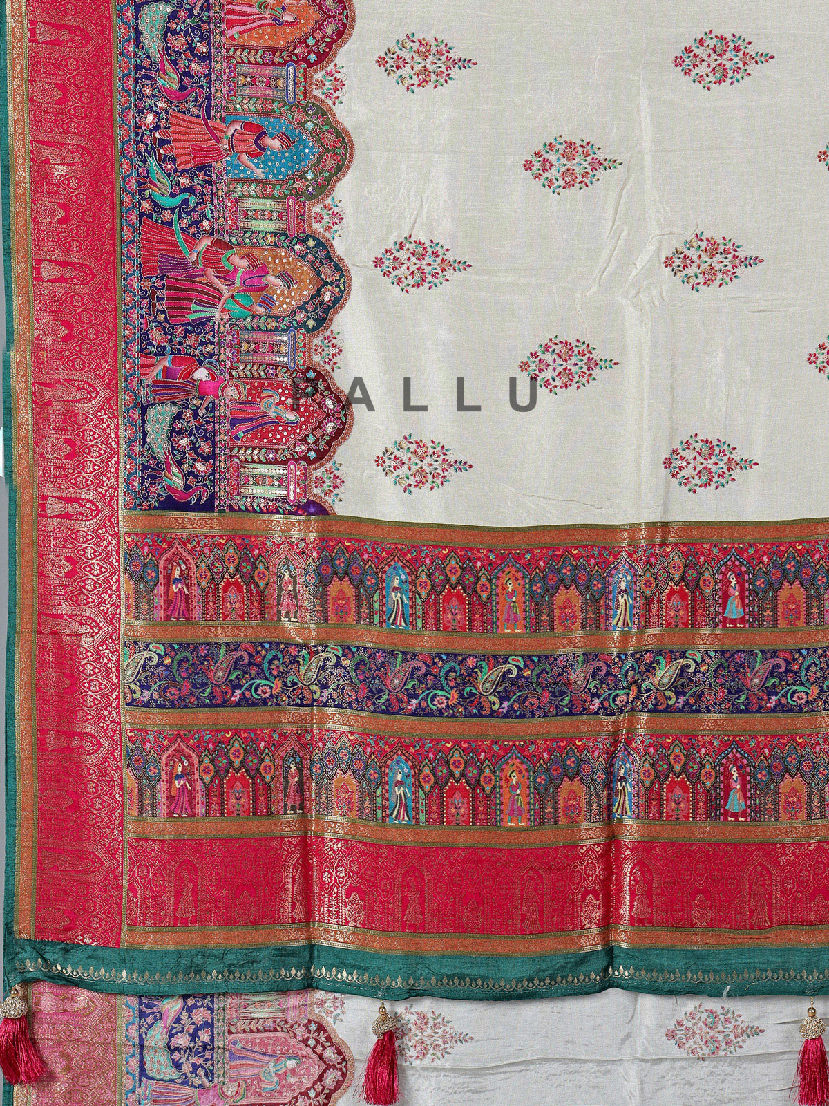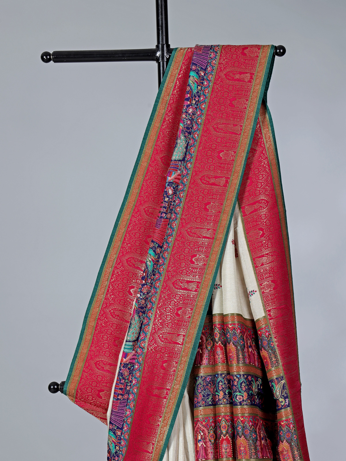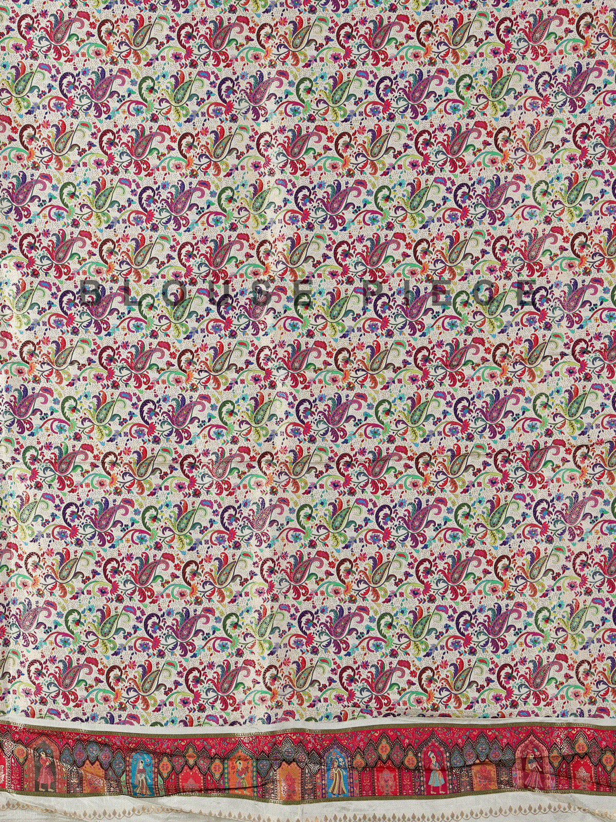 Radiating pure elegance and festive charm, this refined off white printed semi pashmina silk saree flatters with subtle luxury. Intricately crafted with zari, thread, sequins, and colorful motif weaving, it sparkles gracefully. Suitable for festive wear, weddings, sangeet, and receptions, it includes an unstitched blouse.