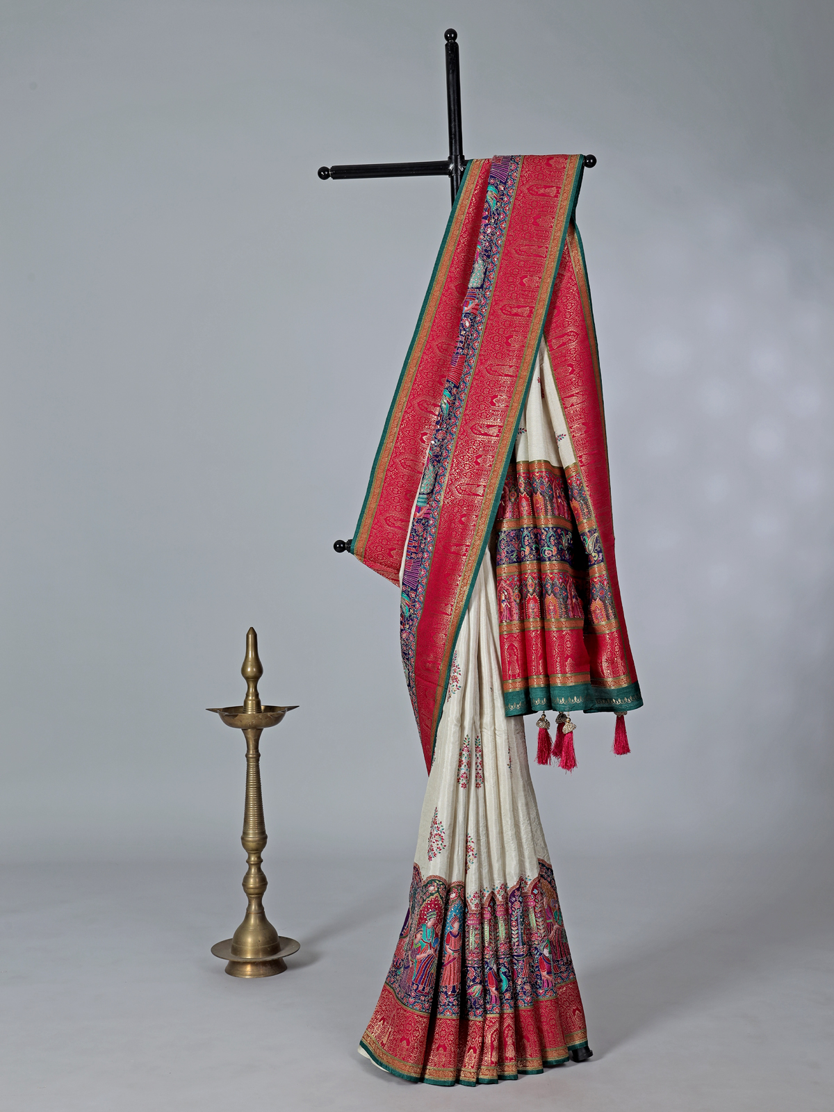 Off White Semi Pashmina Silk Saree With Bold Pallu And Border