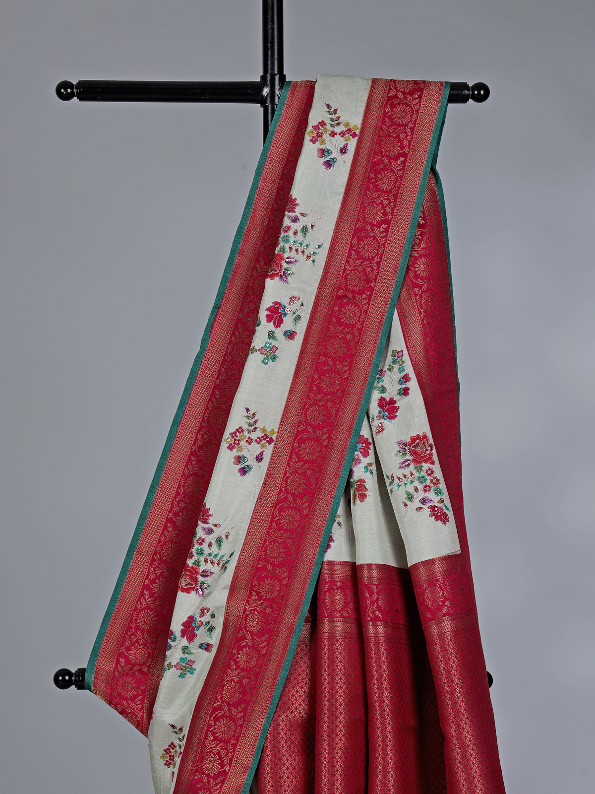 Enhancing the graceful aura of women, this elegant off white semi pashmina silk printed saree exudes timeless beauty and festive finesse. Decorated with zari, thread, sequins, and colorful motif weaving, it adds rich texture and charm. Ideal for festive celebrations, weddings, sangeet, and receptions, paired with an unstitched blouse in a contrast color.