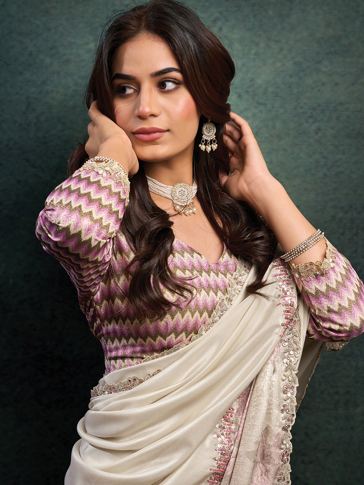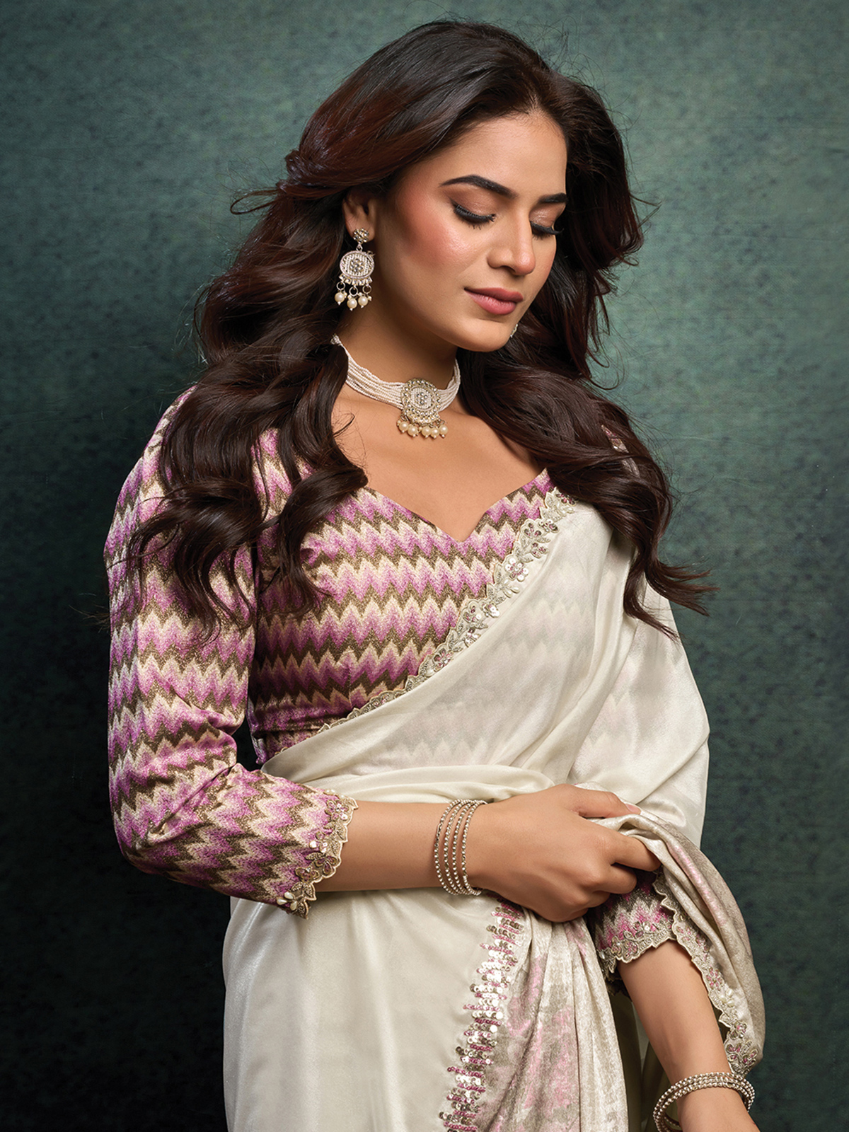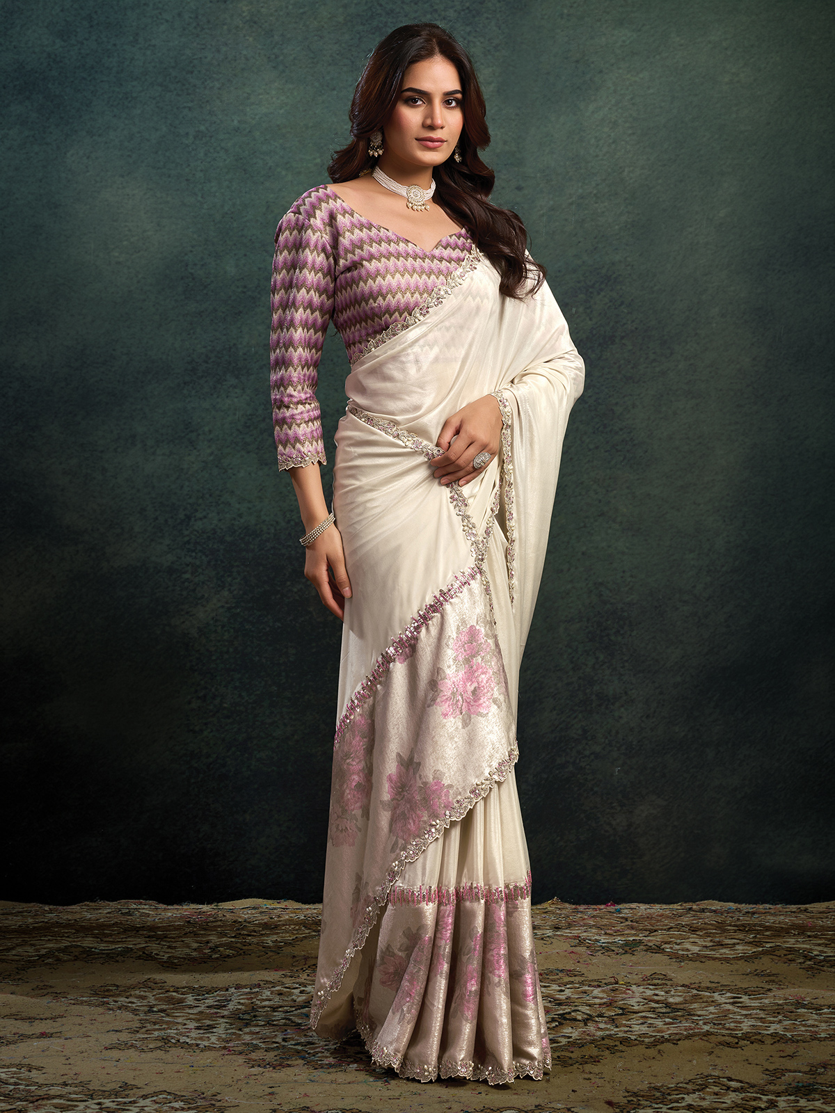 Crafted in luxurious off white upada silk, this saree features a floral printed pallu enhanced with embroidery, sequins, pearls and stone work. The rich drape elevates its designer appeal. Paired with an unstitched blouse piece, it suits weddings, receptions, sangeet and party wear occasions.