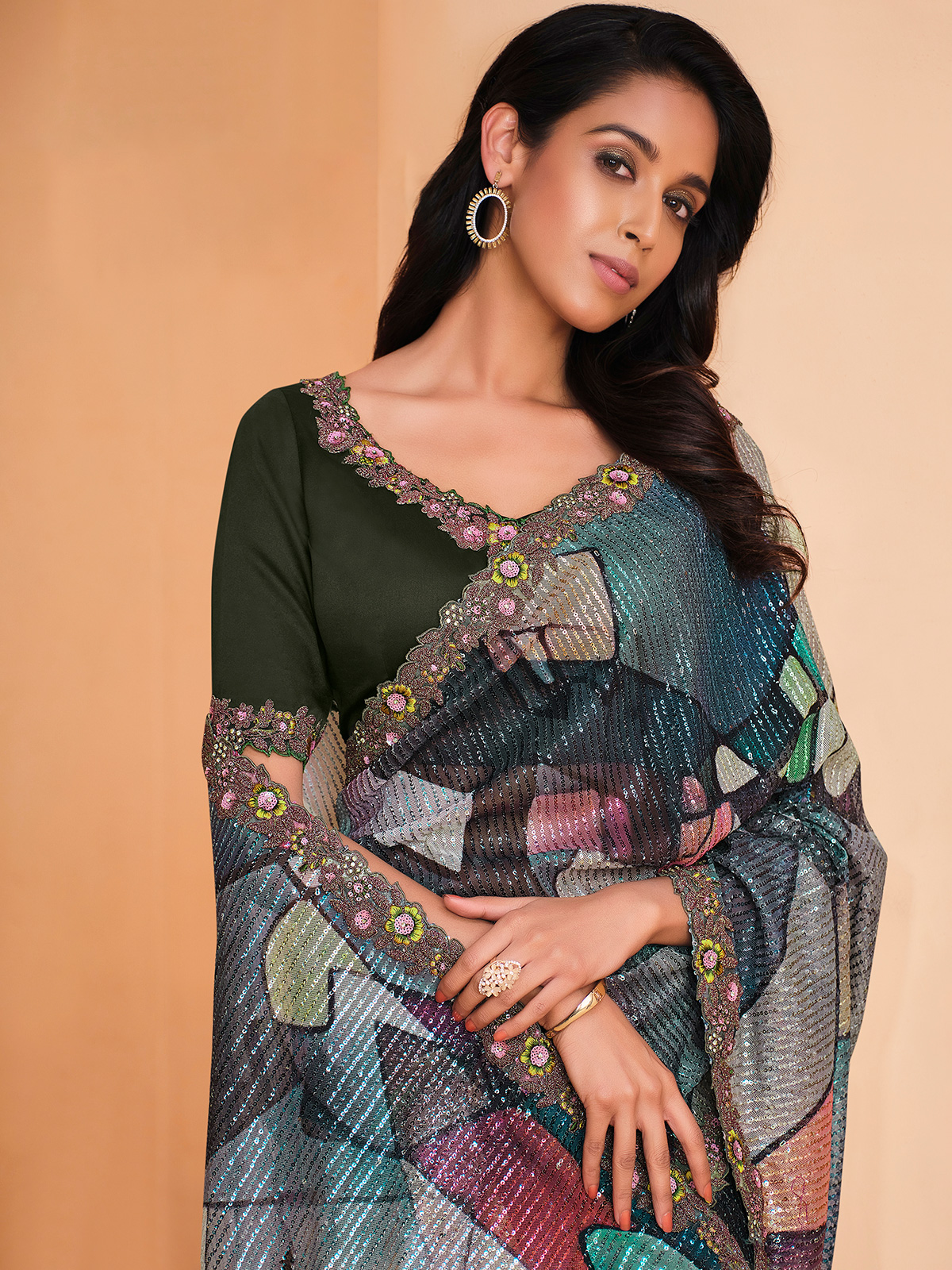 Olive Digital Sequins Designer Party Saree