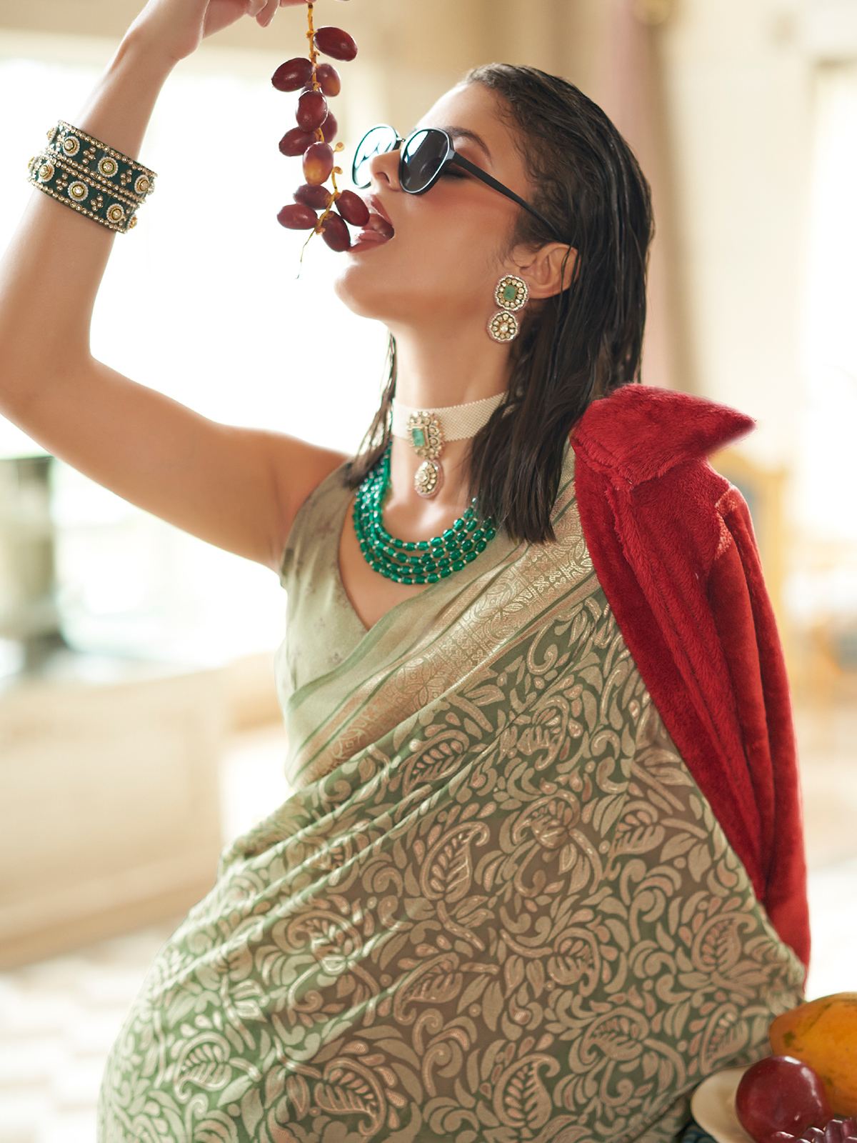 Designed for festive moments and family gatherings, this olive georgette saree dazzles with a beautiful shimmer print. The soft fabric ensures graceful draping, and the included unstitched blouse piece lets you tailor it to your style.
