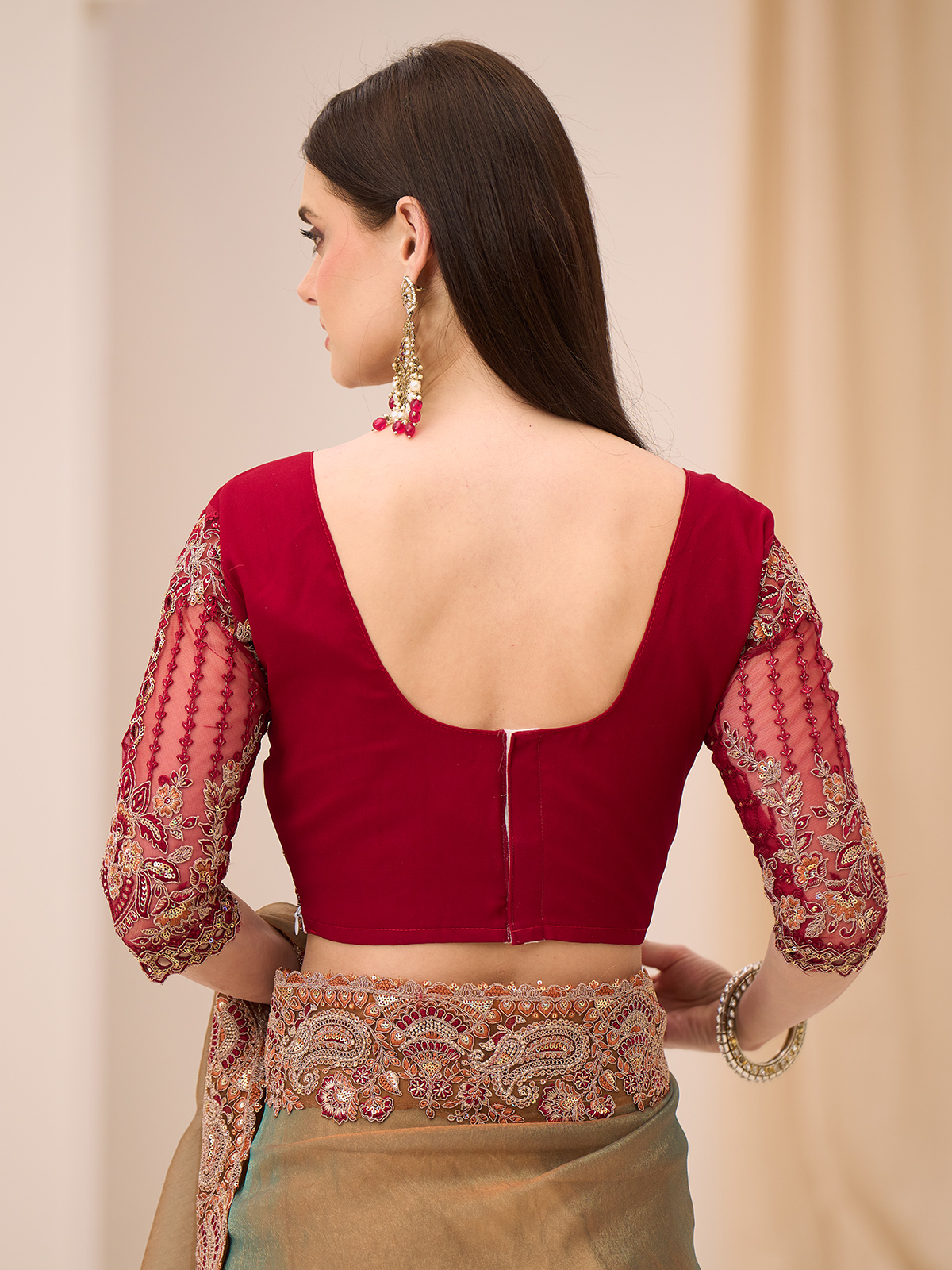 Earthy elegance meets modern charm in this dual shade olive green georgette tissue saree that offers a unique and graceful drape. Beautified with resham and sequins work on the border, it adds refined sparkle and texture. Perfect for festive and party occasions, it includes an unstitched blouse for versatile styling.